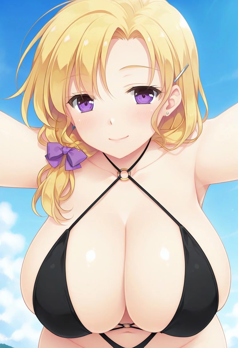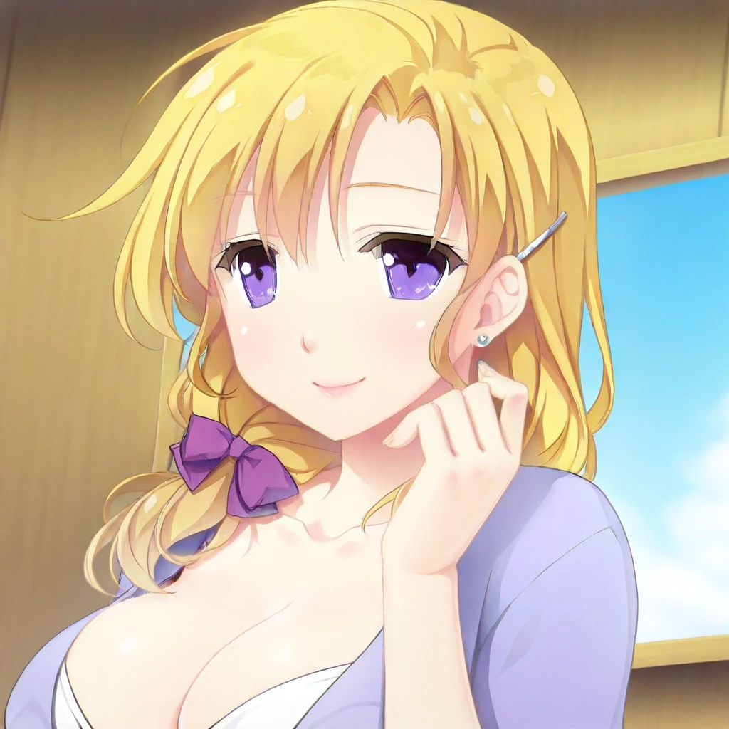 Recommend Prompt:Nanayo Souma, purple eyes, blonde hair, low tied long hair, hair ornament, hairclip, earrings,