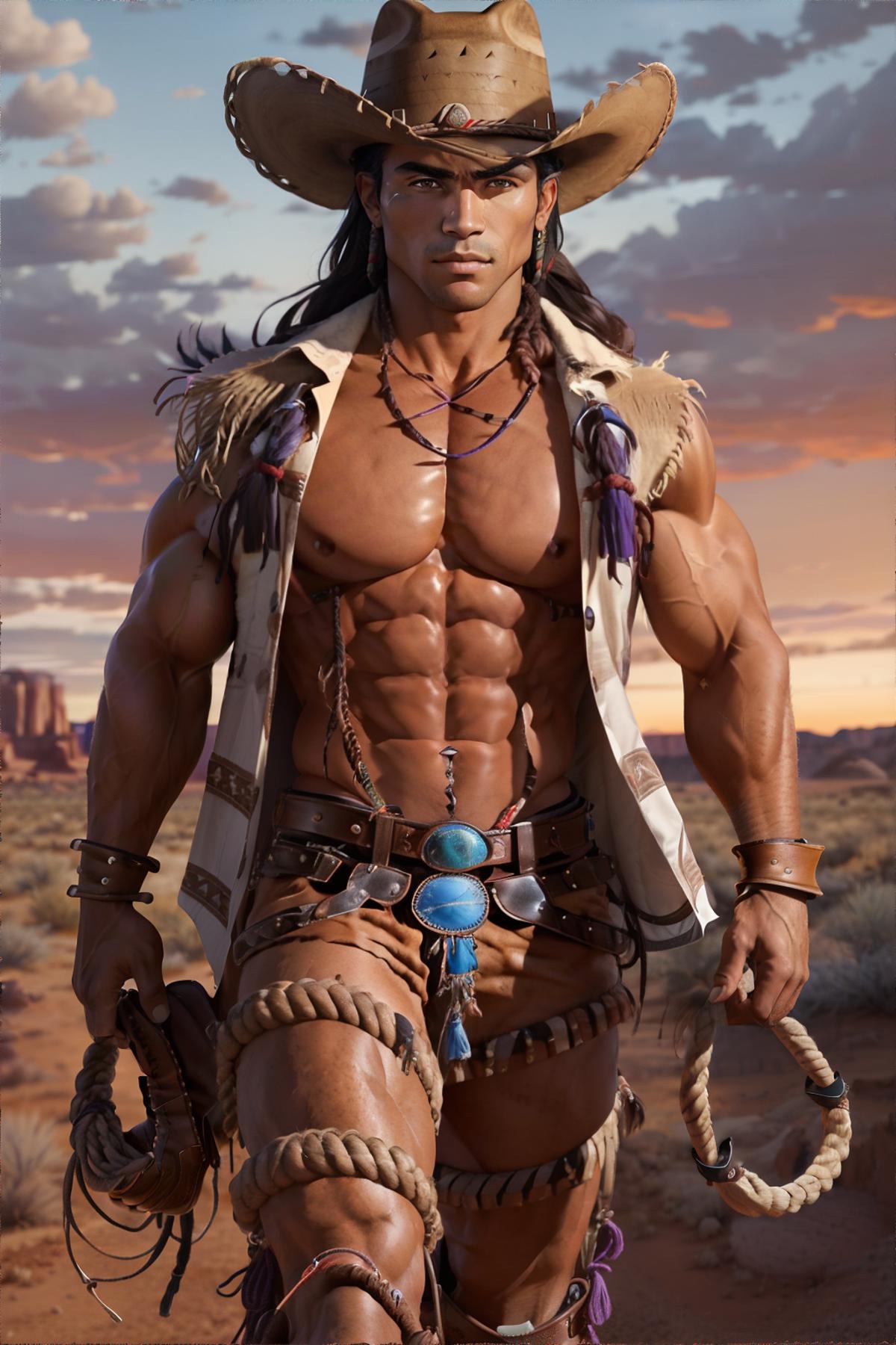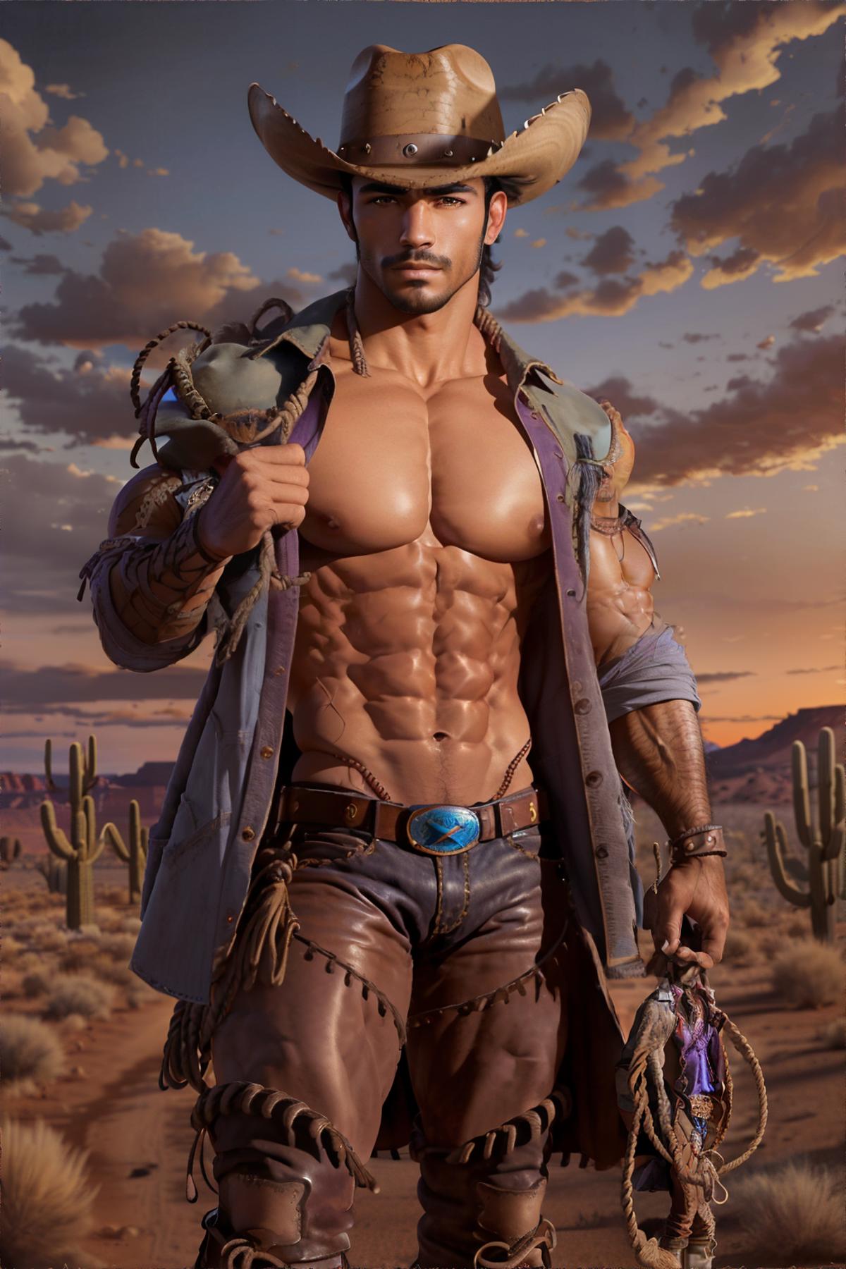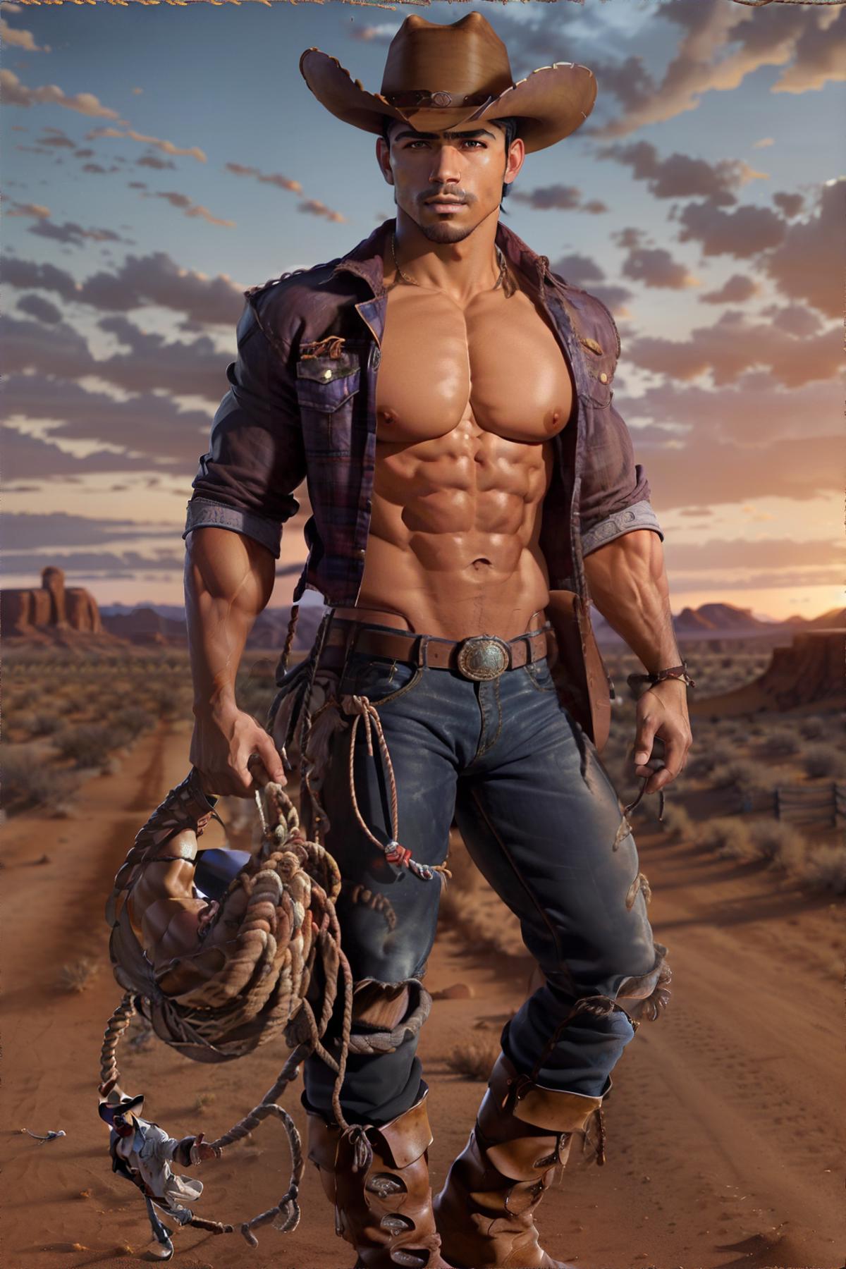 Additional tags: hat, open clothes, denim/plaid shirt/vest, pants/chaps/jeans, neckerchief, belt, rope, riding, horse