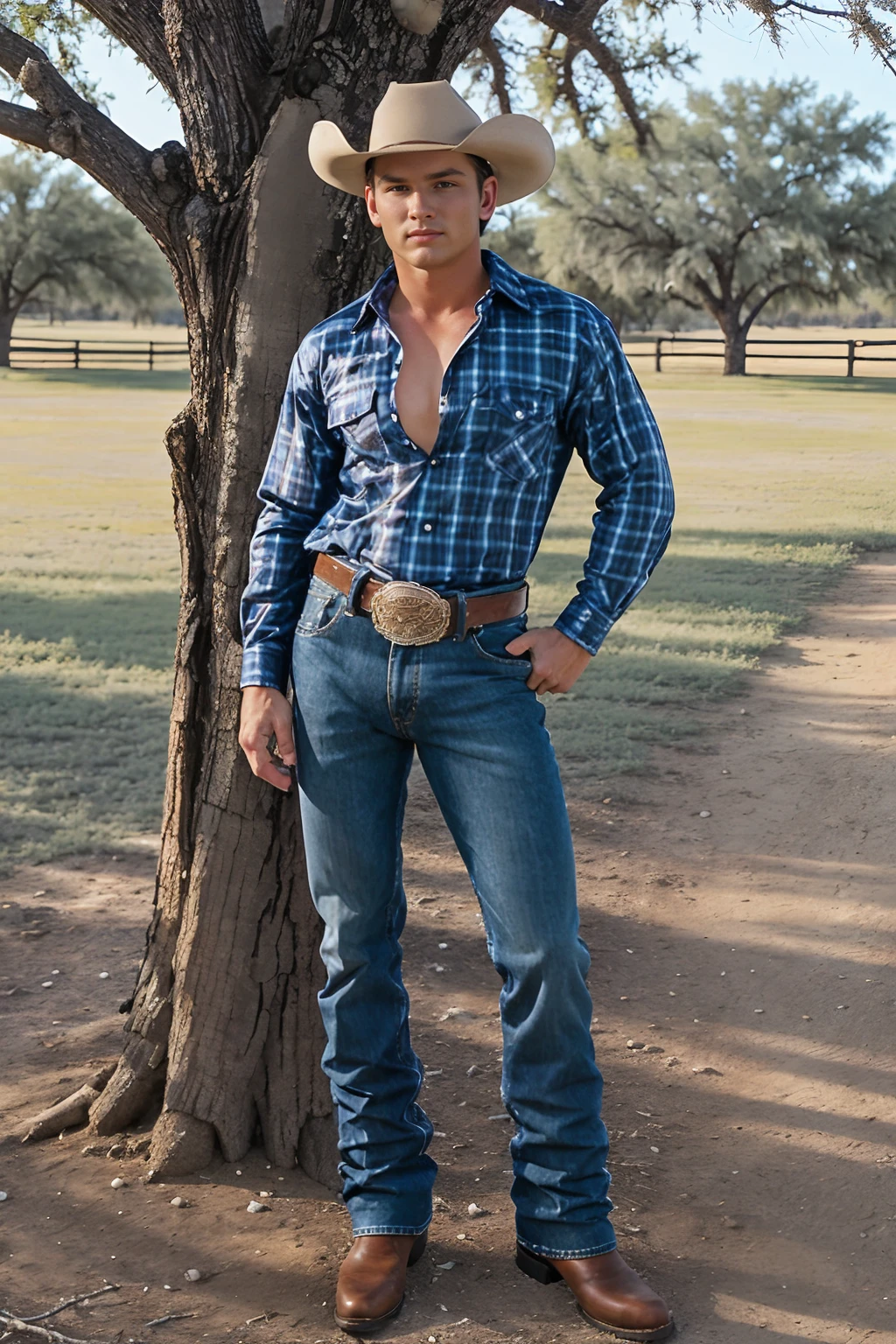 hat, open clothes, shirt/vest, pants/chaps/jeans, denim/plaid, neckerchief, belt, rope, riding, horse