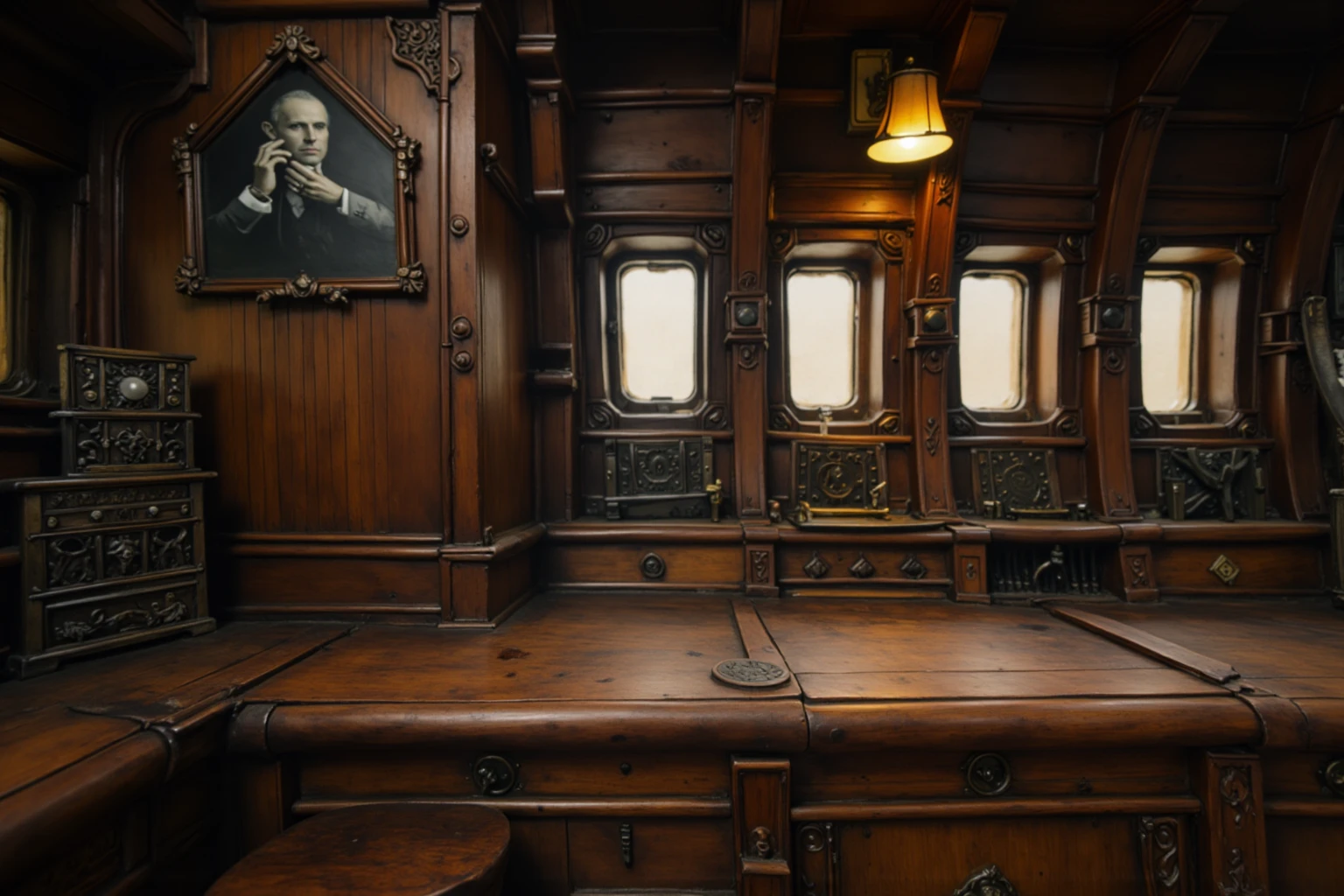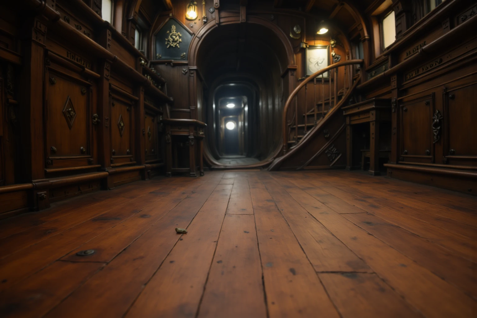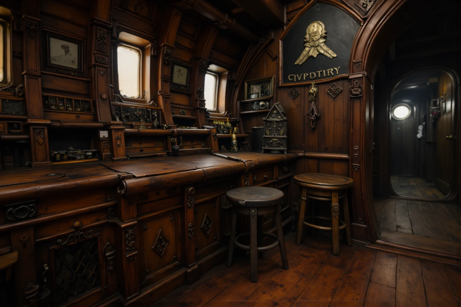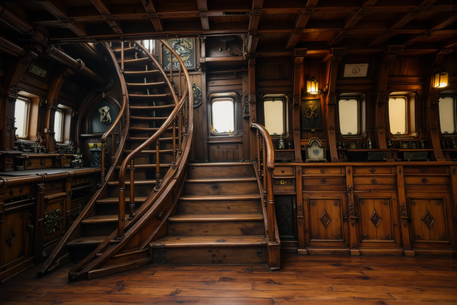 wooden ship interior, detailed interior, captured from a slightly low, human eye-level camera angle that emphasizes depth and structure, Dark carved wooden walls and exposed ceiling beams frame a long workbench beneath a row of frosted rectangular windows, where diffused daylight softly enters the space, Warm lantern and oil-lamp lighting is mounted along the walls and pillars, creating a gentle contrast between amber highlights and deep shadows, A spiral wooden staircase rises along one side of the room, while a large arched doorway beneath it leads into a dim corridor, adding a strong sense of scale and narrative depth, The far end of the interior a doorway opens into another compartment, The polished wooden floor reflects subtle light, reinforcing the cinematic, moody atmosphere and highlighting the aged textures and craftsmanship of the ship’s interior