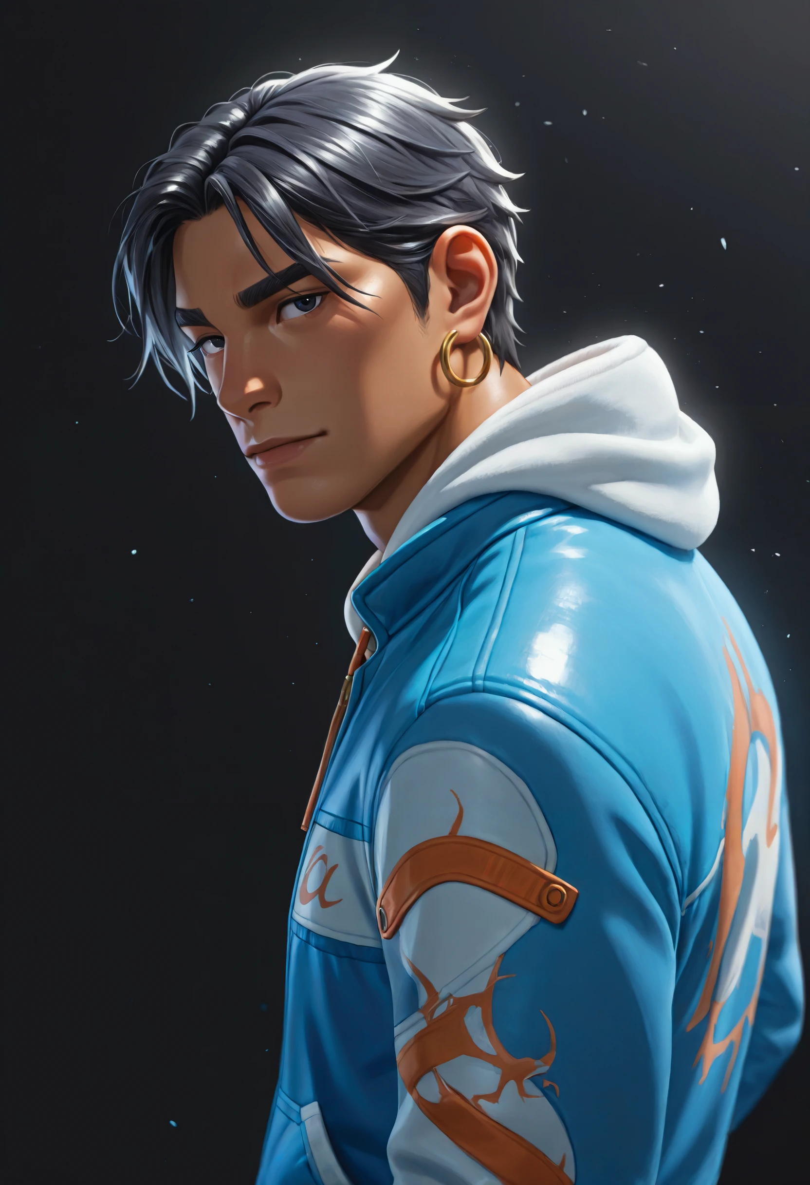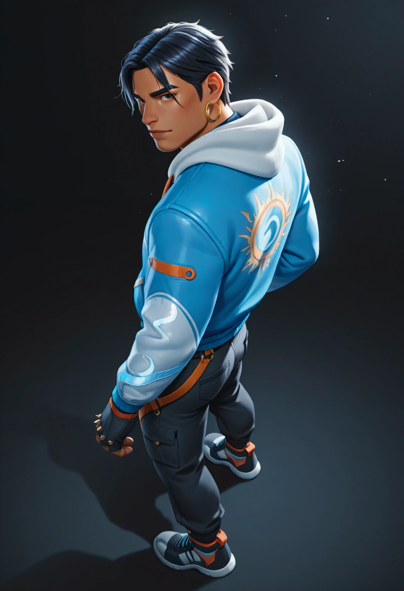 Optional Trigger words: bright blue jacket, hoodie layer, orange zipper pull, dragon graphic sleeve, back dragon emblem, fingerless gloves, cargo joggers,