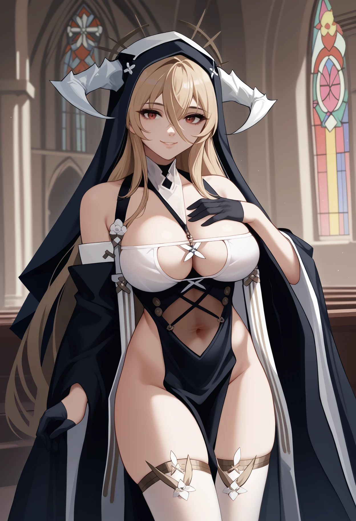 Default Outfit: implacabledef, habit, veil, white horns, fake horns, nun, revealing clothes, two-tone dress, see-through, breast cutout, between breasts, long sleeves, wide sleeves, detached sleeves, black gloves, half gloves, pelvic curtain, thighs, white thighhighs, bare shoulders, covered navel, cleavage, large breasts