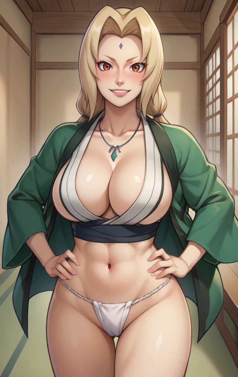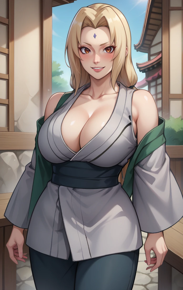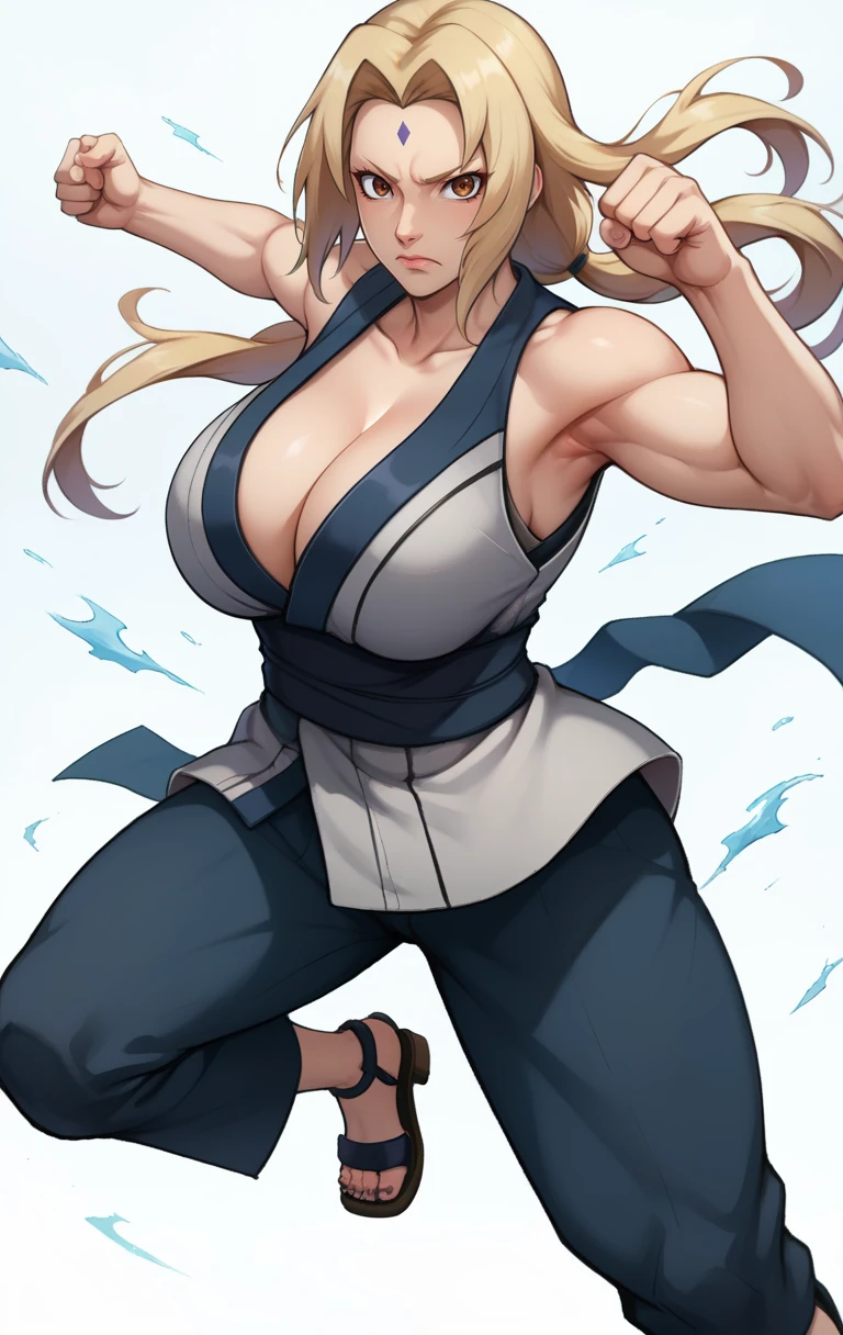 Promt: 1girl, solo, long hair, breasts, looking at viewer, bangs, blonde hair, large breasts, cleavage, bare shoulders, brown eyes, closed mouth, collarbone, thighs, japanese clothes, sleeveless, pants, kimono, huge breasts, parted bangs, sash, muscular, facial mark, obi, sandals, clenched hand, serious, mature female, forehead mark, muscular female, blue pants, midriff peek, tsunade (naruto)