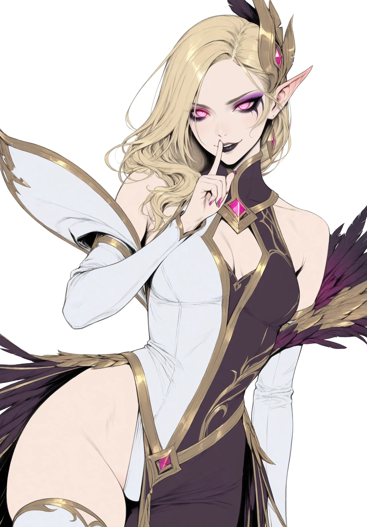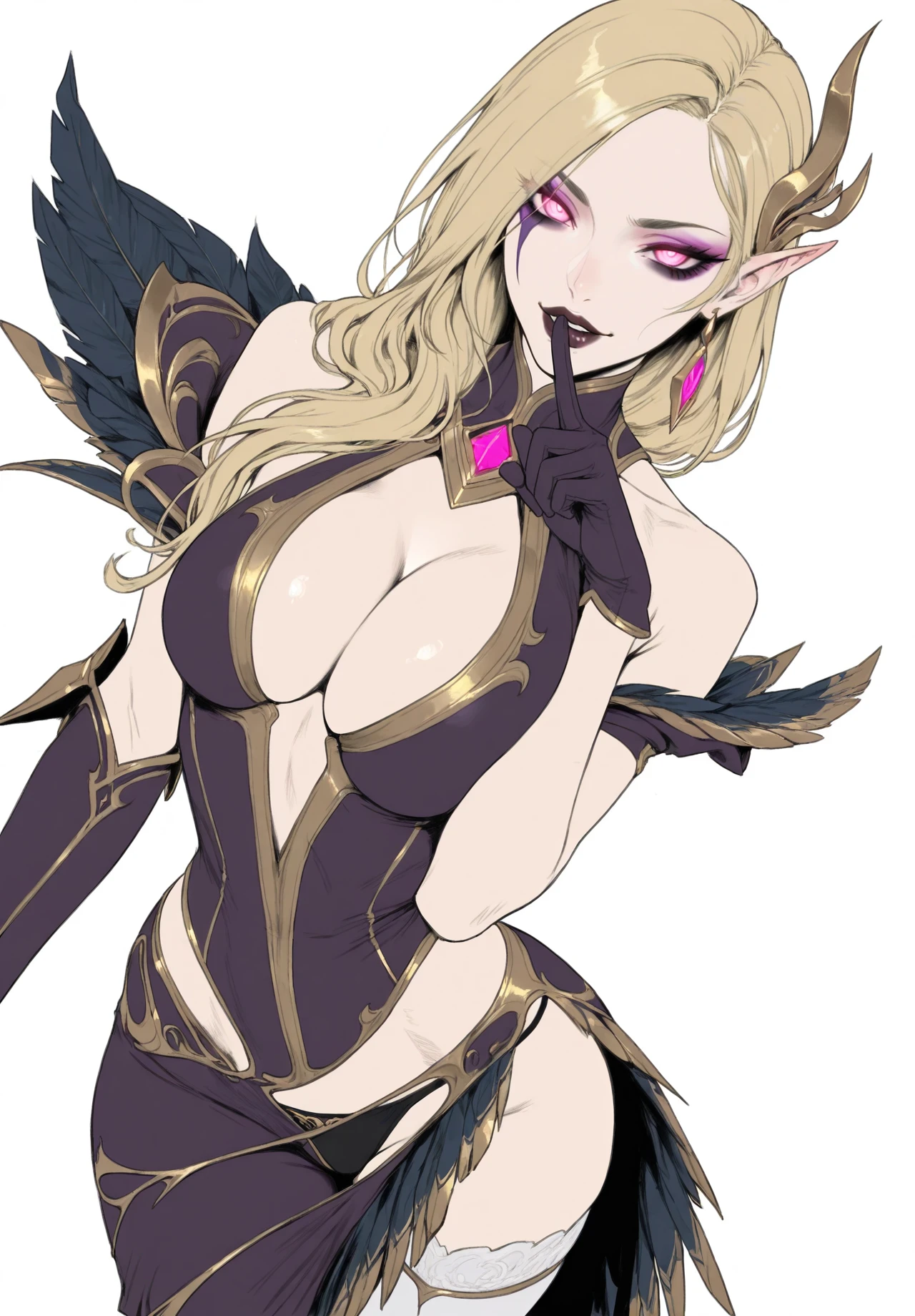 Coven_Morgana,slim body,long blonde hair,side-swept hair,pink eyes,glowing eyes,sharp eyes,dark eye makeup,purple eyeshadow,pointed ears,purple and gold bodysuit,fantasy armor,gold trim details,high collar,feather dress,white stockings,sleeves,bare shoulders,