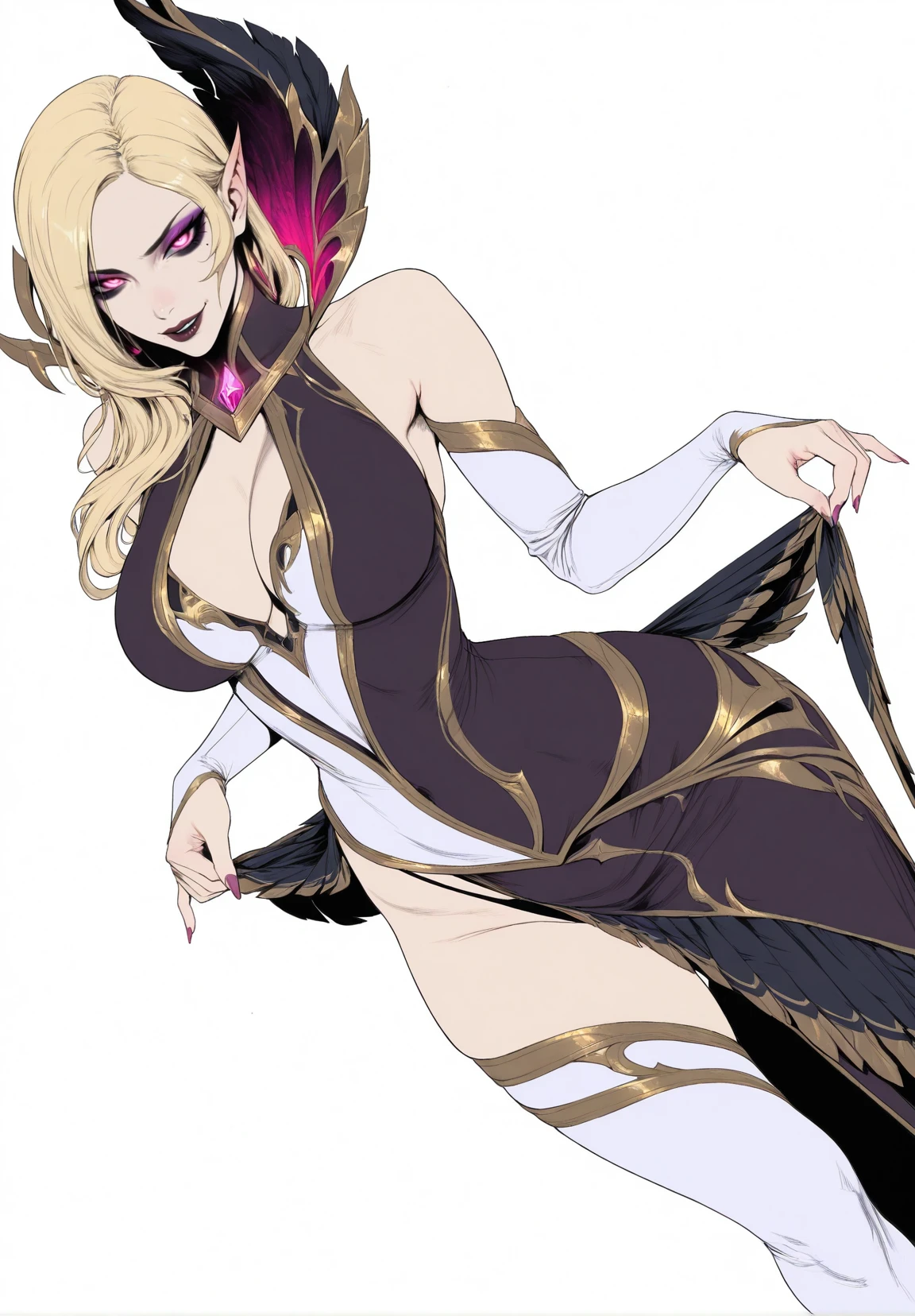 Coven_Morgana,slim body,long blonde hair,side-swept hair,pink eyes,glowing eyes,sharp eyes,dark eye makeup,purple eyeshadow,pointed ears,purple and gold ,fantasy armor,gold trim details,high collar,feather dress,white stockings,sleeves,bare shoulders,