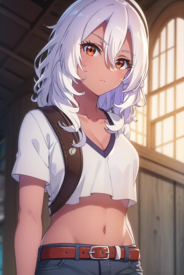 shirt, navel, cleavage, collarbone, white shirt, midriff, belt, pants, dark skin, dark-skinned female, crop top, denim,
