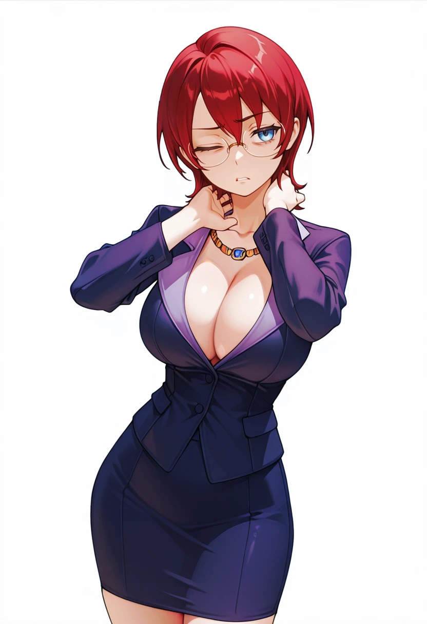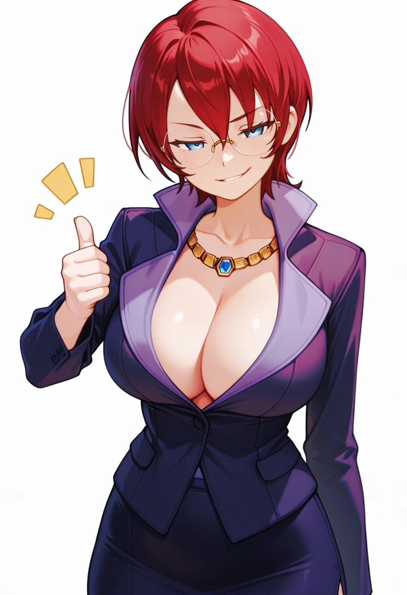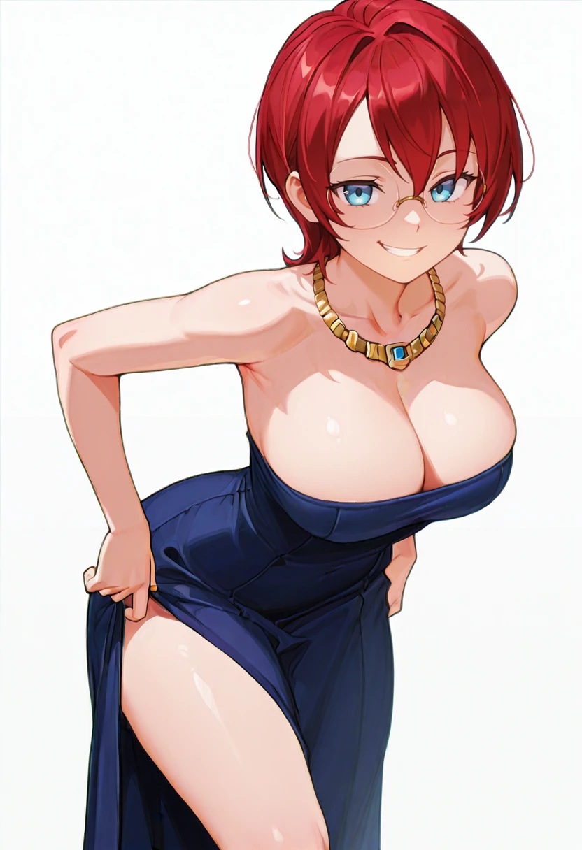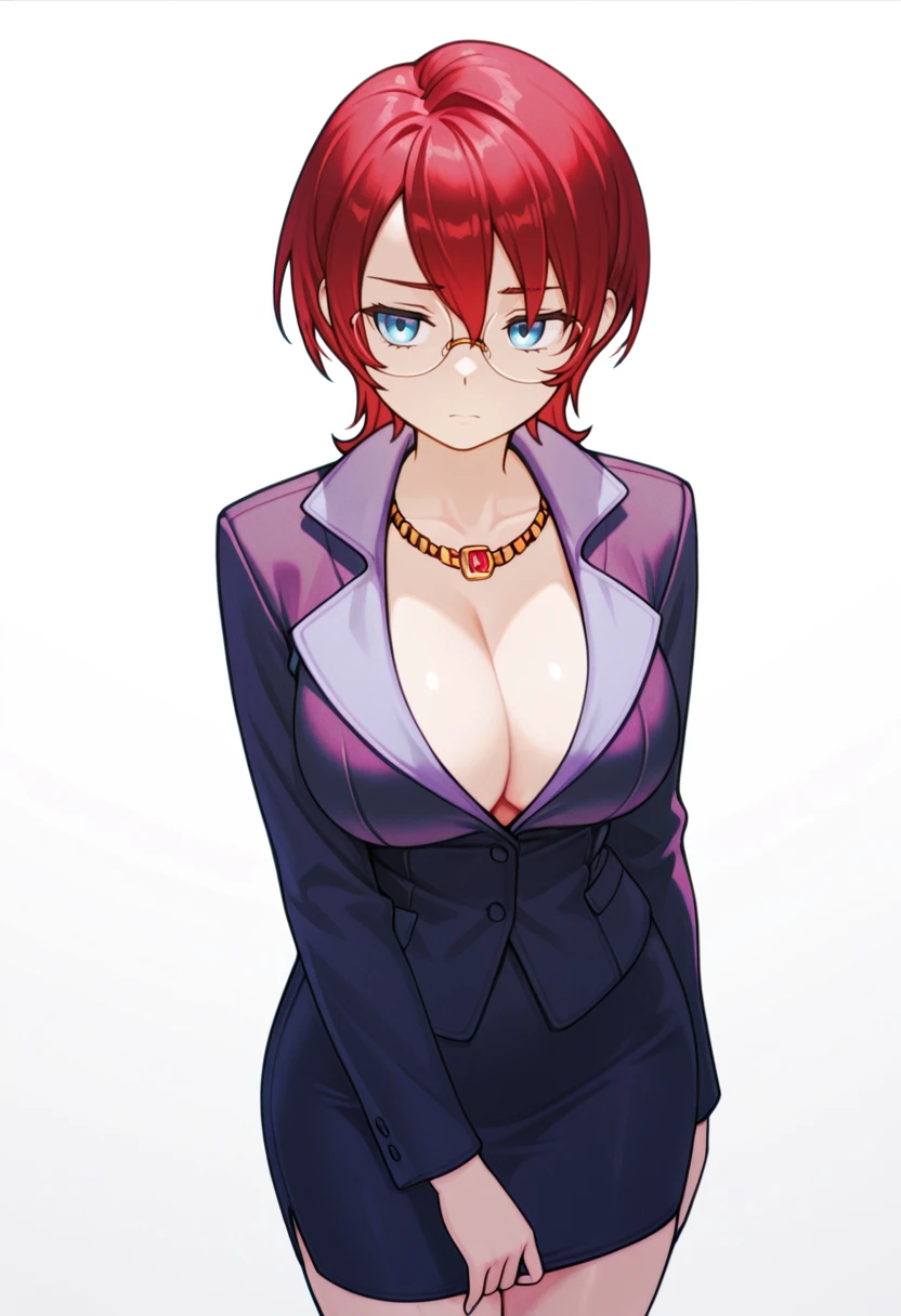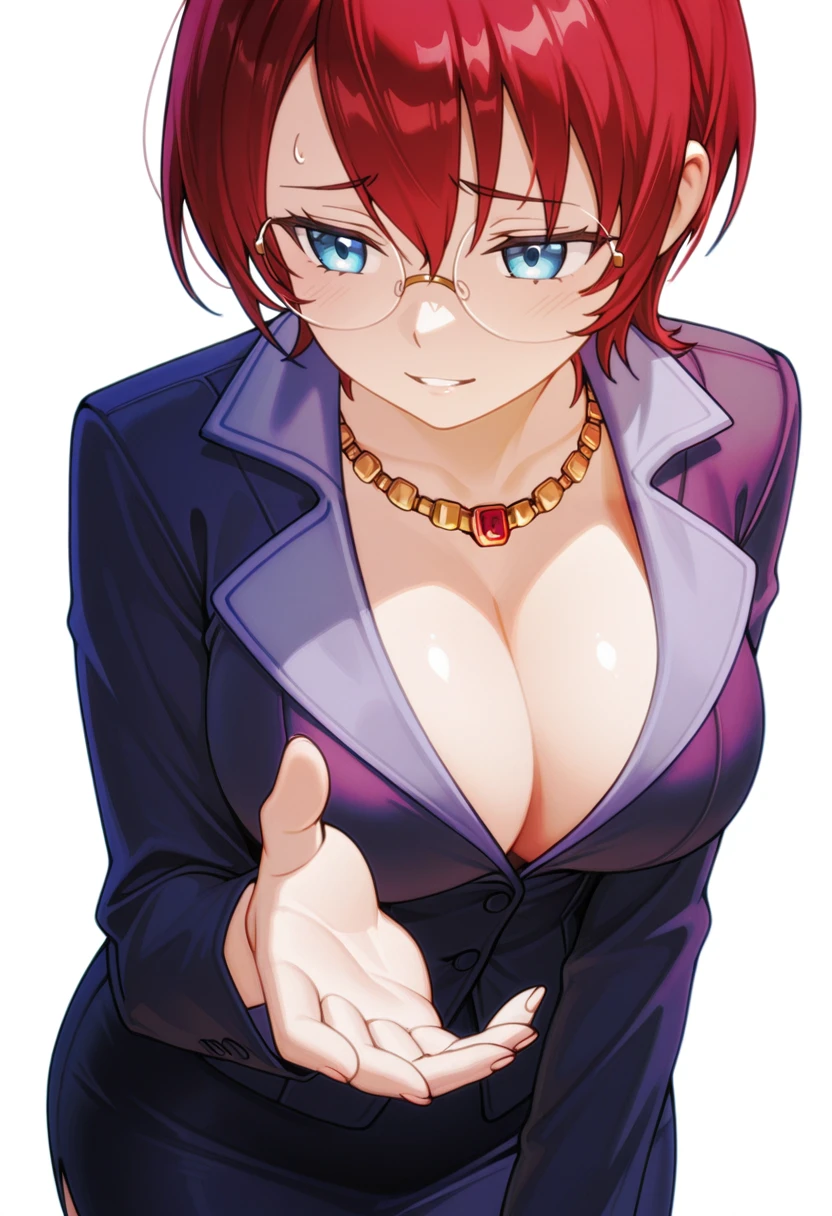 joster_cnr, 1girl,red hair, blue eyes, short hair, large breasts, necklace, rimless eyewear,