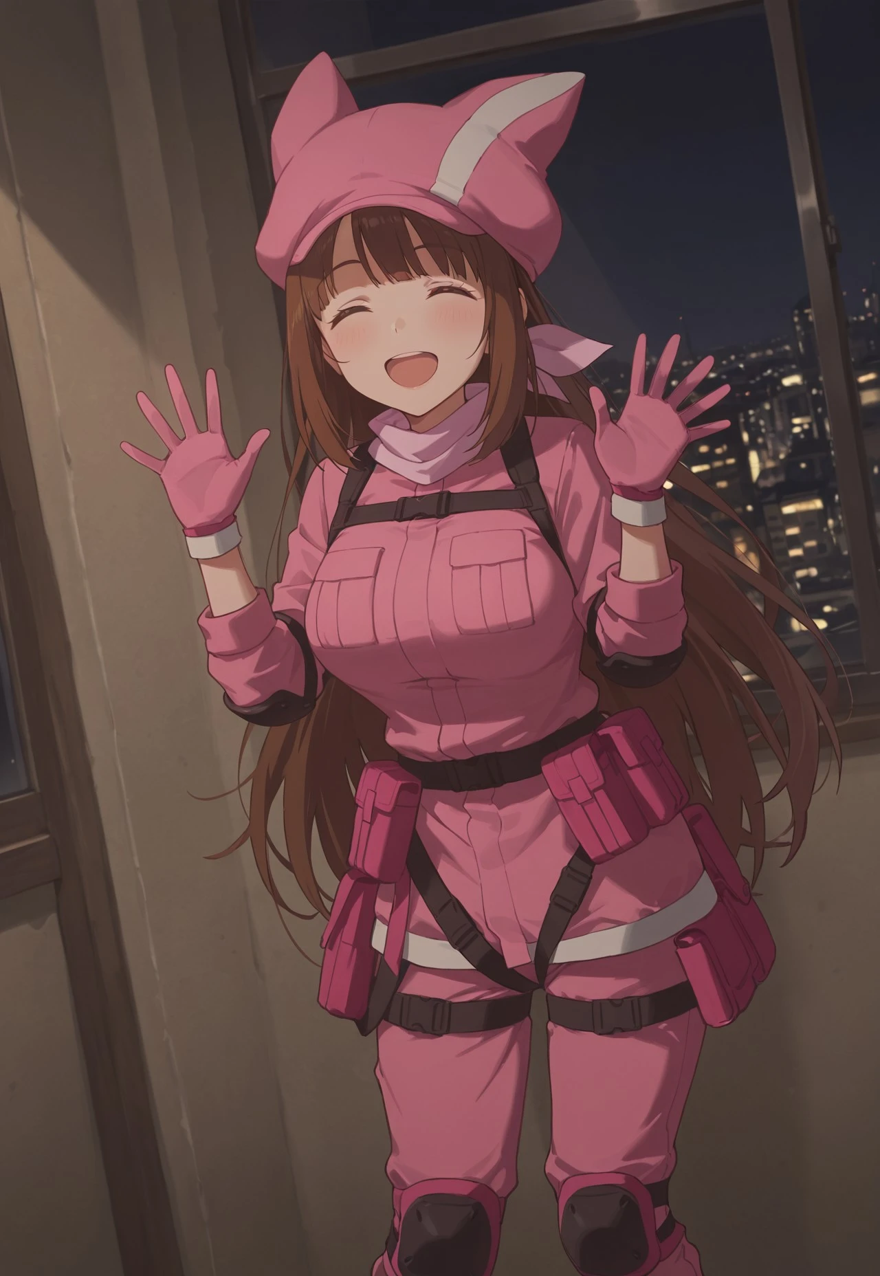 LlennIL, mature, , brown hair, very long hair, pink headwear, pink jacket, brown eyes, pink gloves, animal hat, long sleeves, pink pants, bandana, bangs, elbow pads, knee pads, ammunition pouch,