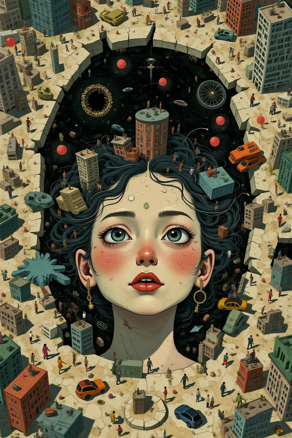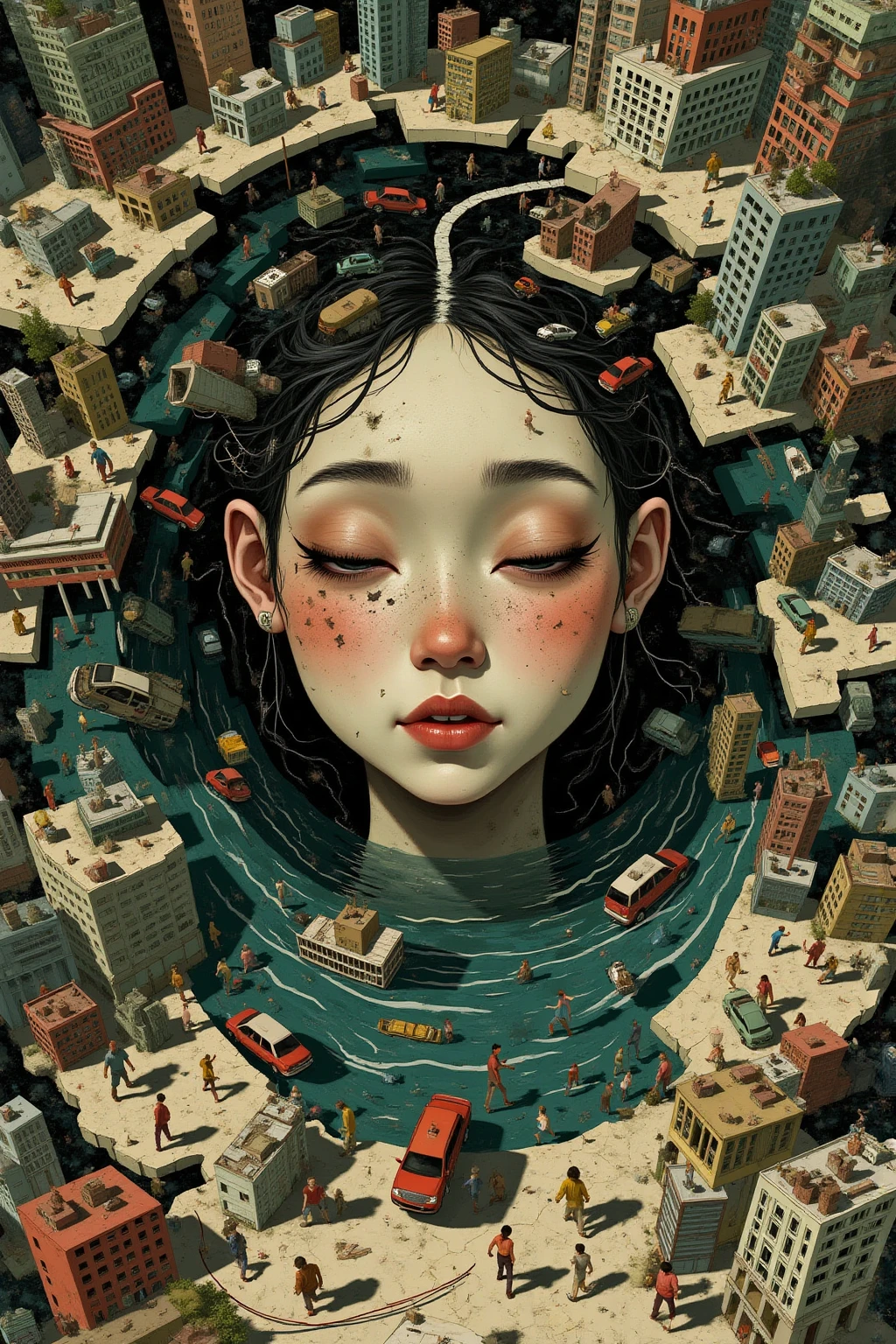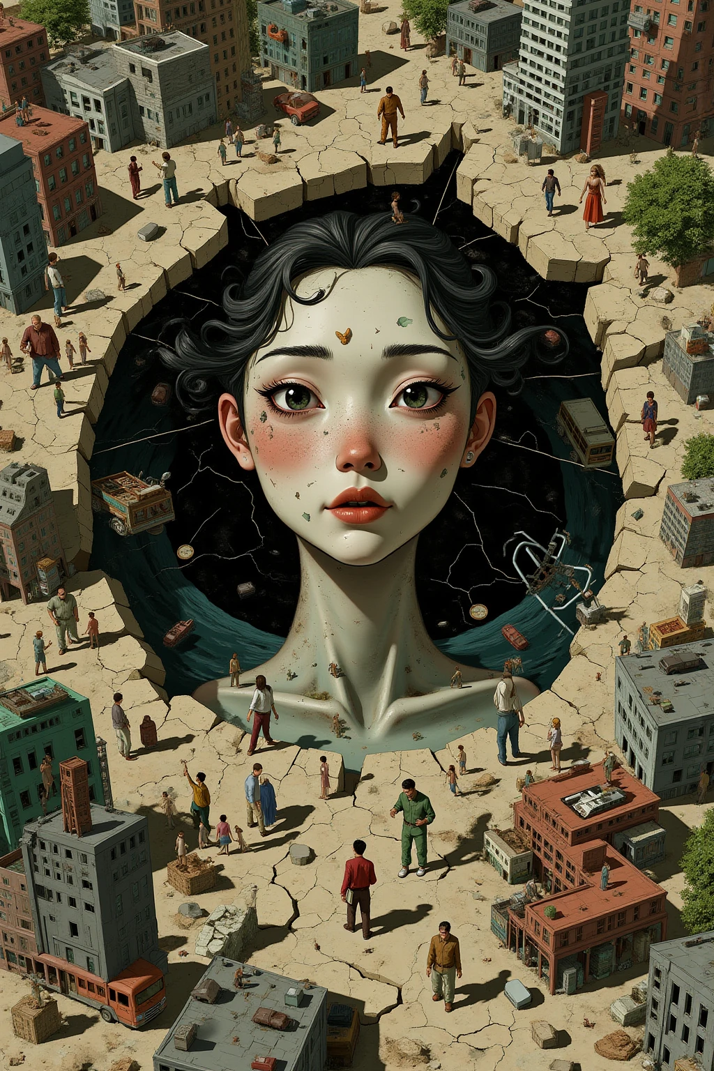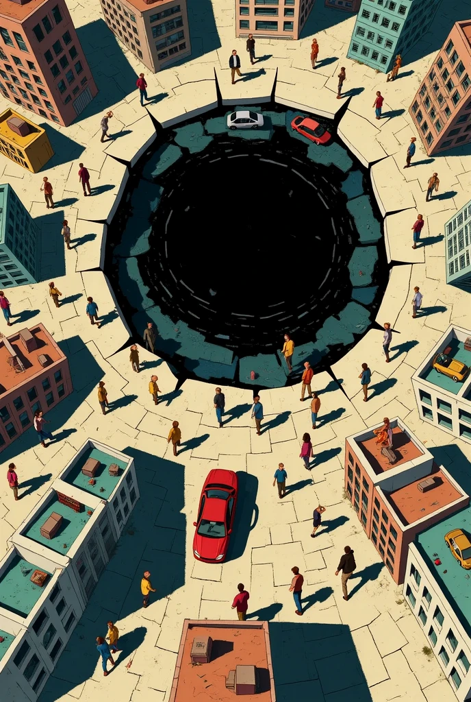 高層ビル群に囲まれた都心の中心部に大きな円形の陥没があり、数台の車両が静止している。都市の破壊的な景観です。地面にある大きなギザギザの穴が画像の焦点であり、にぎやかな都市景観に囲まれています。穴は赤い車、白い車、青い車を含む車両で埋められており、すべて部分的に水に沈んでいます。穴の周囲には、現代と伝統的な建築様式が混在した高層ビルが立ち並んでいます。建物は青、緑、茶色などさまざまな色で塗装されており、頂上に十字架が描かれている建物もあります。穴の周りの地面はひび割れて凹凸があり、草や瓦礫が散在しているように見えます。現場には人影がなく、緊迫感や危険性を示唆しています。照明は柔らかく、シーンに優しい光を投げかけ、建物や乗り物の質感や色を強調します。