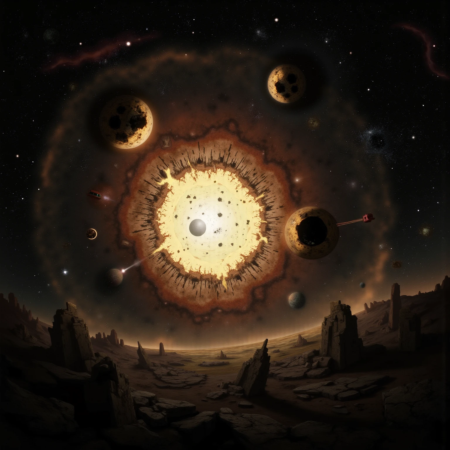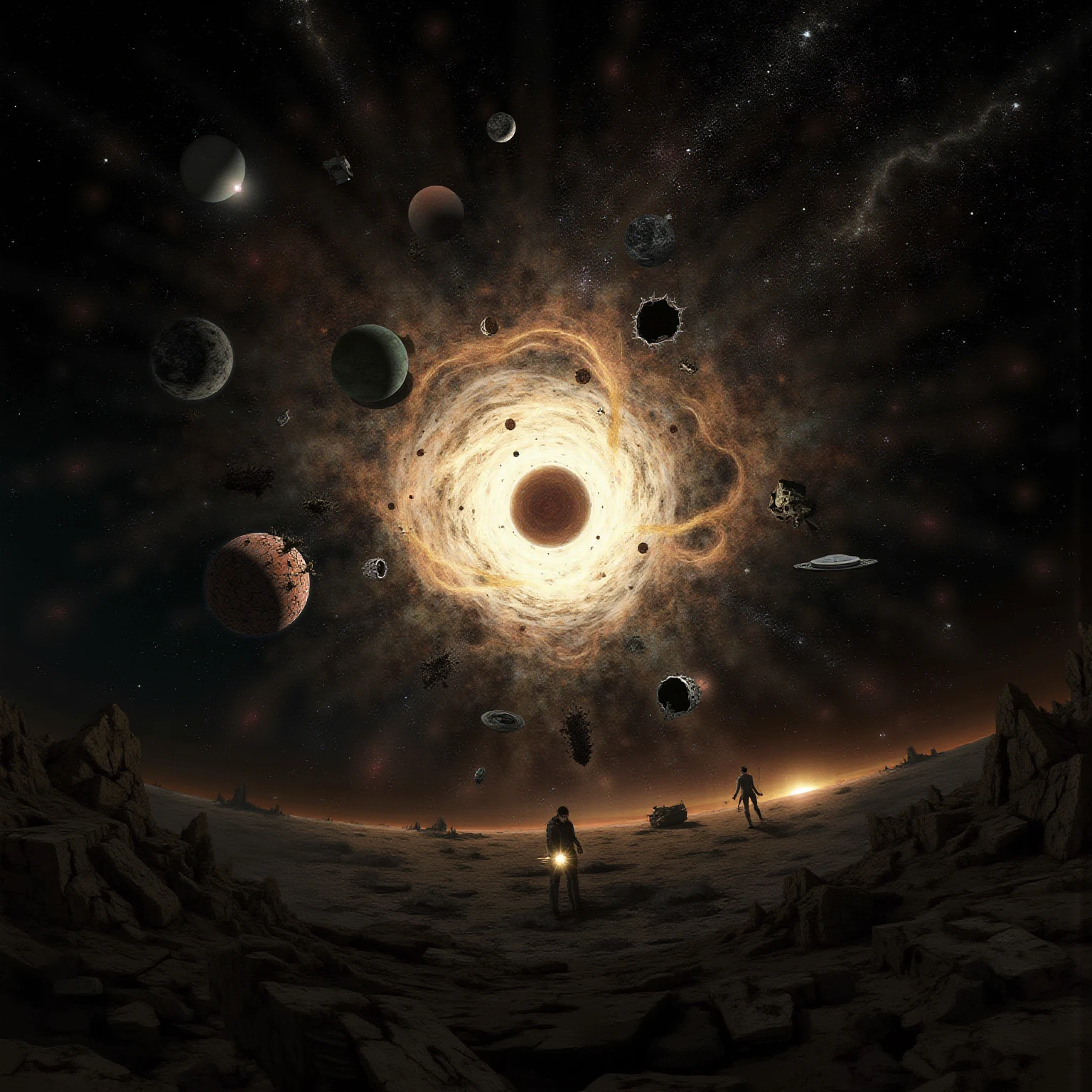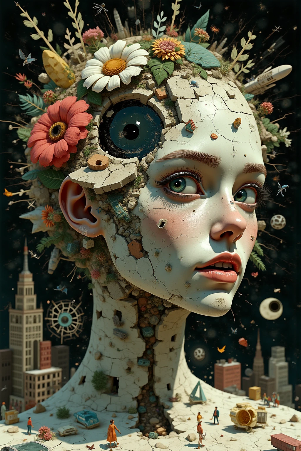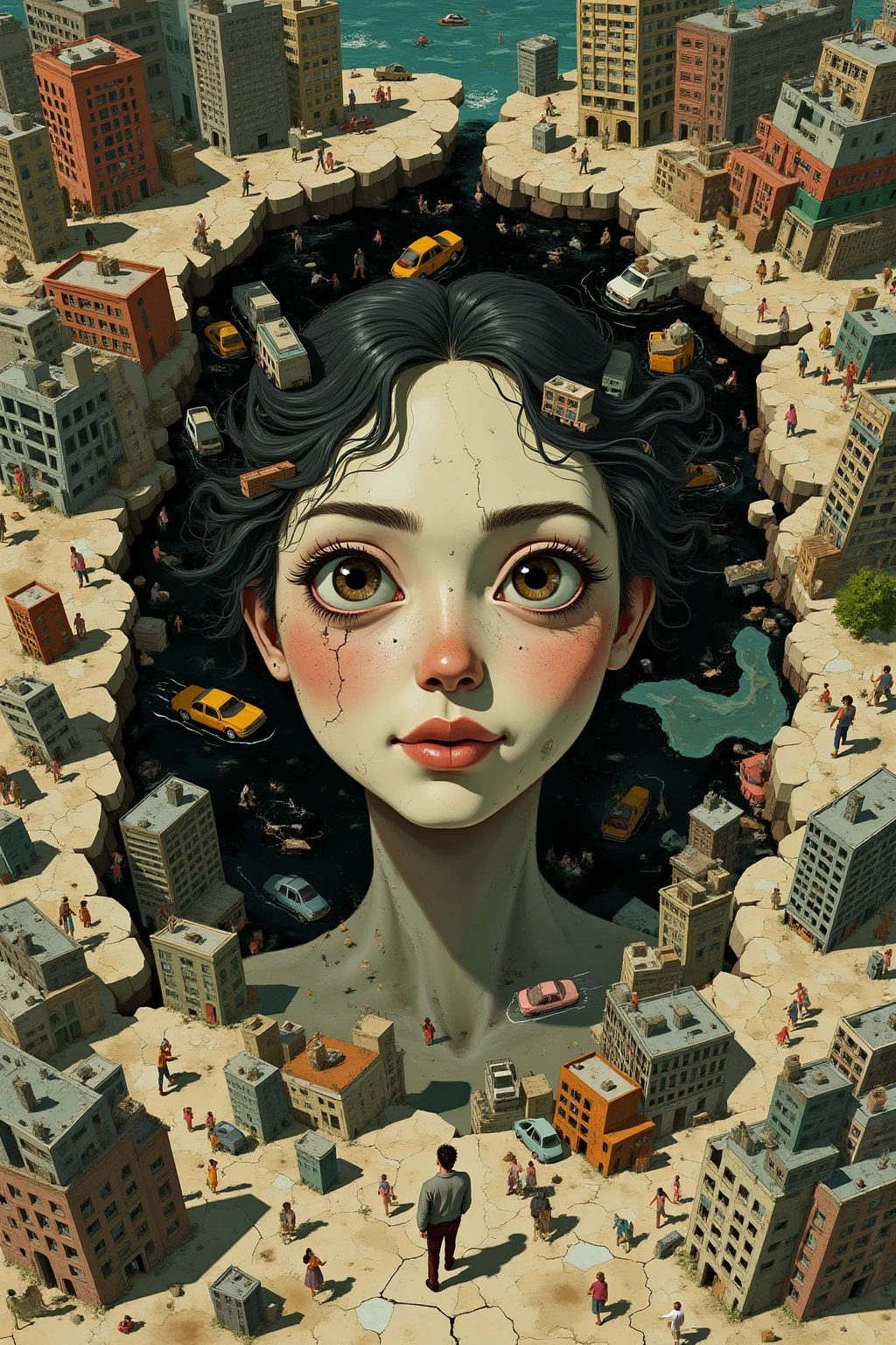 高層ビル群に囲まれた都心の中心部に大きな円形の陥没があり、数台の車両が静止している。都市の破壊的な景観です。地面にある大きなギザギザの穴が画像の焦点であり、にぎやかな都市景観に囲まれています。穴は赤い車、白い車、青い車を含む車両で埋められており、すべて部分的に水に沈んでいます。穴の周囲には、現代と伝統的な建築様式が混在した高層ビルが立ち並んでいます。建物は青、緑、茶色などさまざまな色で塗装されており、頂上に十字架が描かれている建物もあります。穴の周りの地面はひび割れて凹凸があり、草や瓦礫が散在しているように見えます。現場には人影がなく、緊迫感や危険性を示唆しています。照明は柔らかく、シーンに優しい光を投げかけ、建物や乗り物の質感や色を強調します。