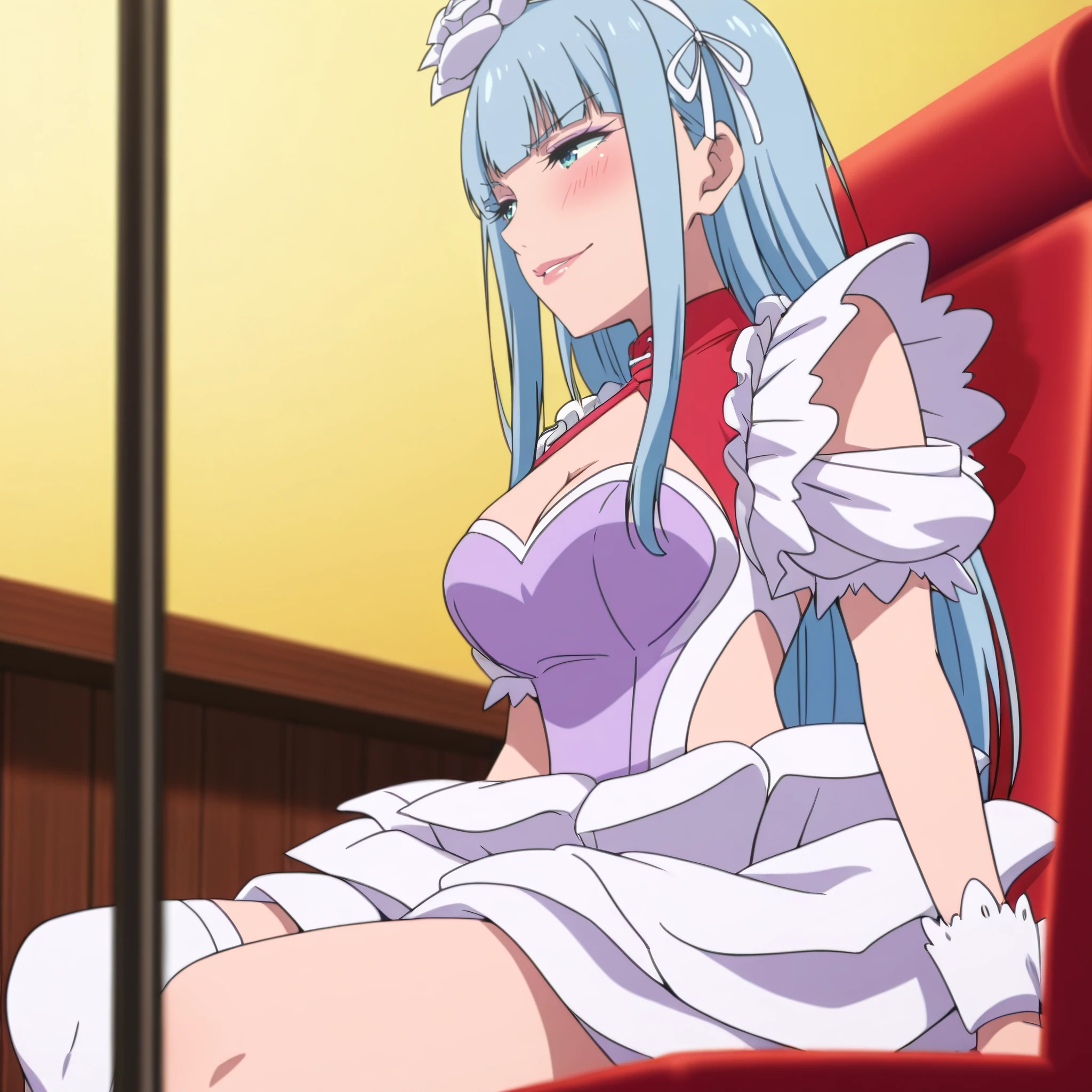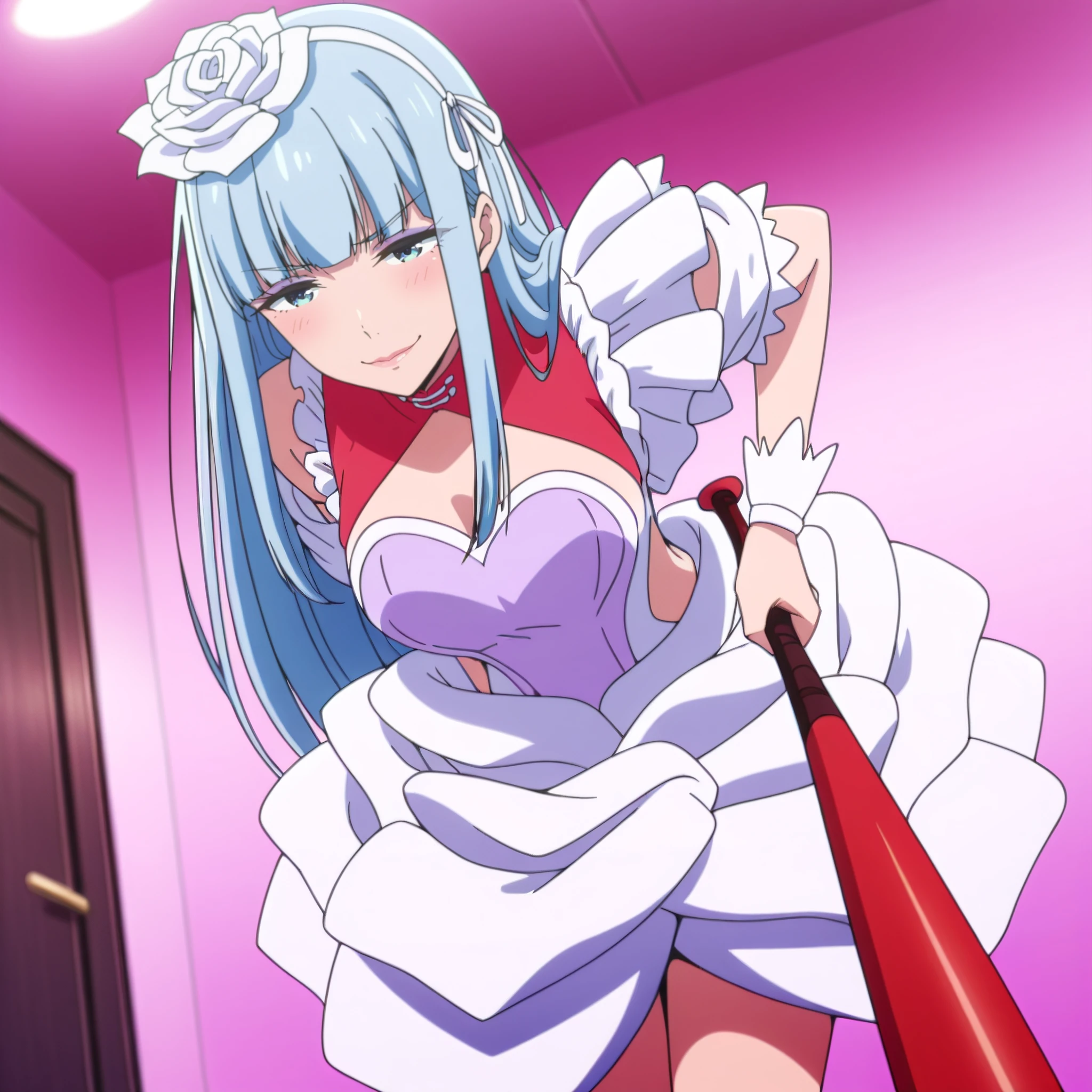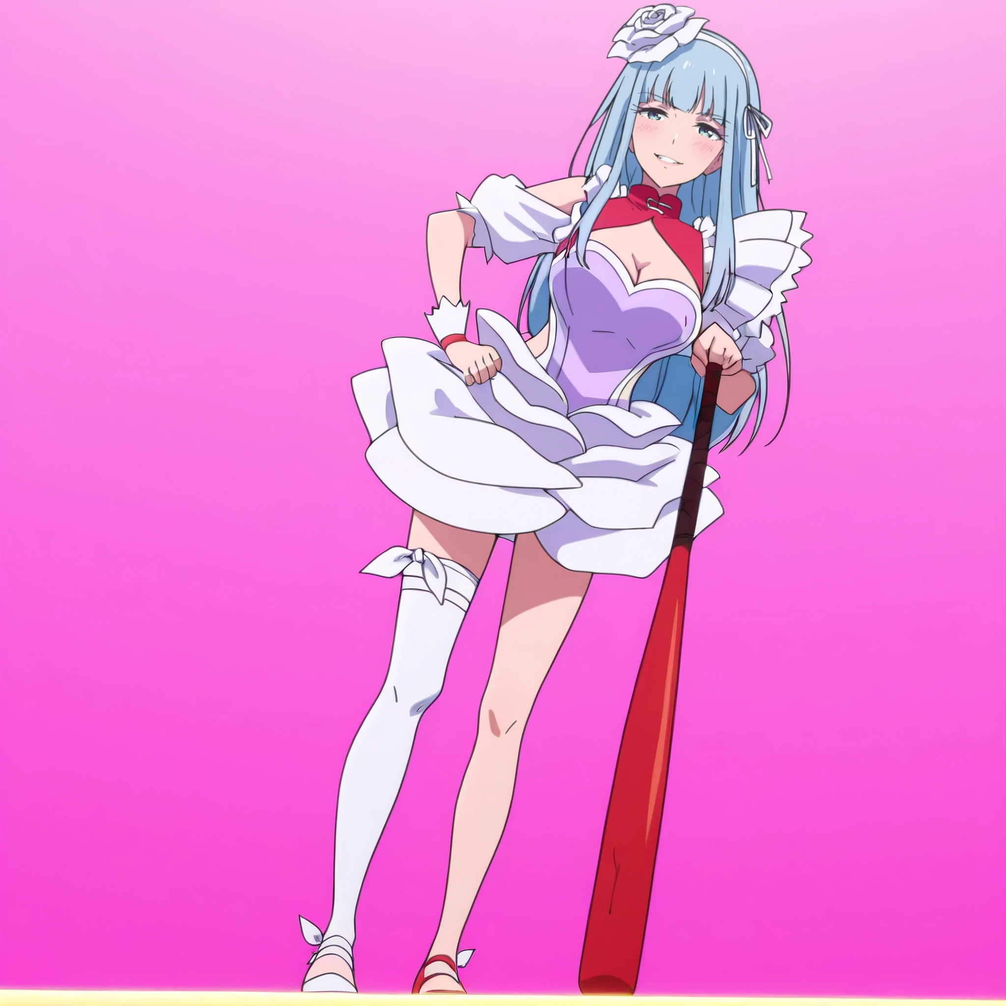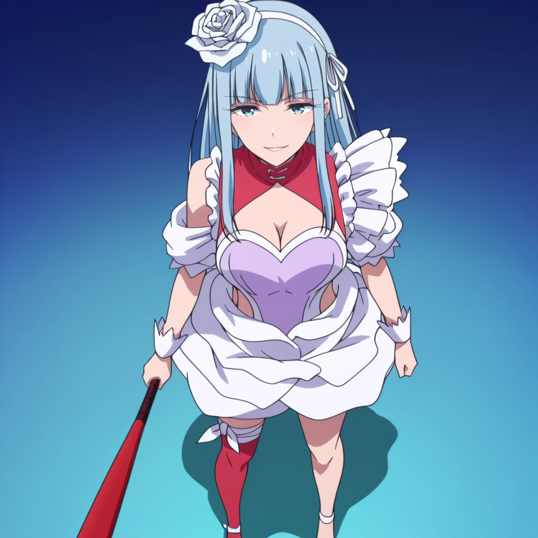 dress, frills, cleavage, maid, rose, puffy sleeves, gloves, wrist cuffs, apron, puffy short sleeves, single thighhigh, cleavage cutout,