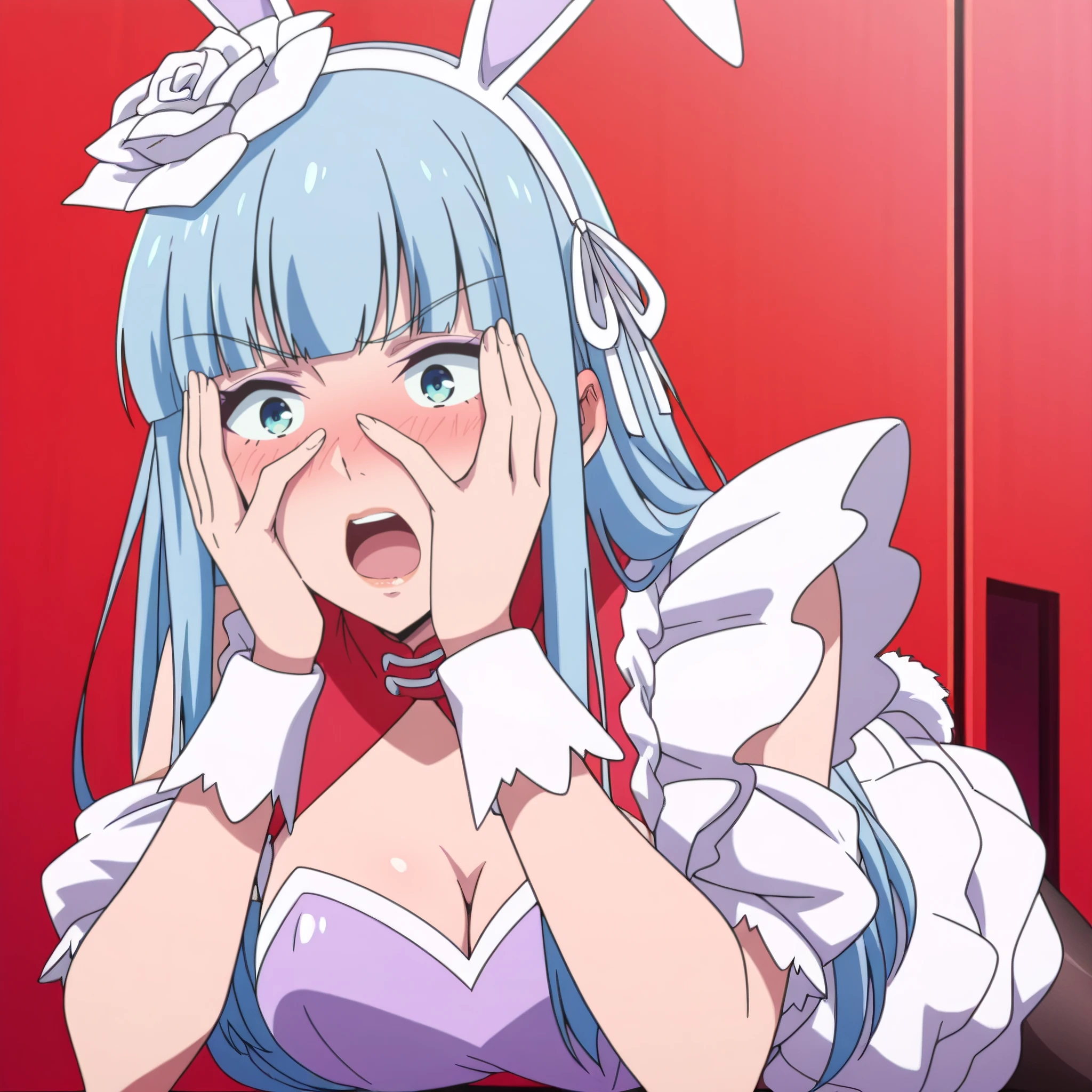 AMWManami, long hair, bangs, blunt bangs, hair ornament, blue hair, hair flower, ribbon, hairband, eyebrows visible through hair, blue eyes, hair ribbon,