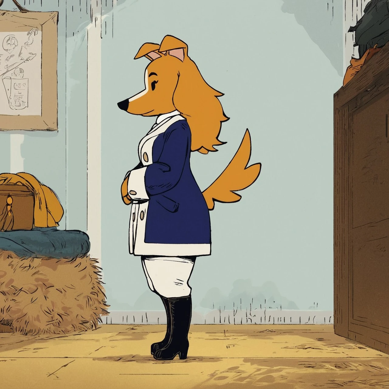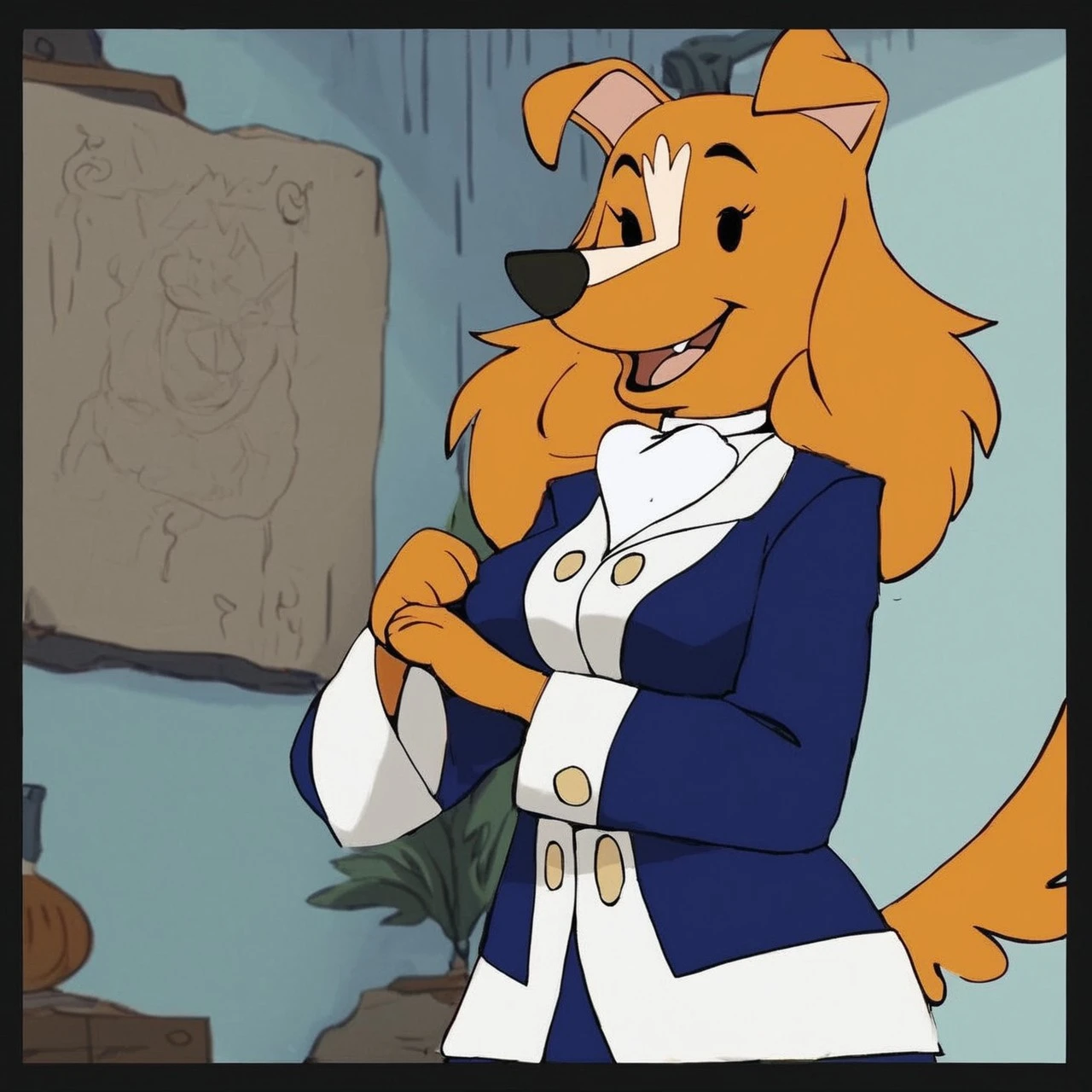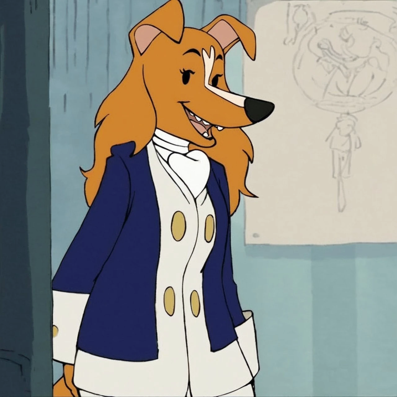 She looks like a Rough Collie and wears a military coat of the American Revolutionary War, she is crossdressing as a male soldier. Based in the real history of Deborah Sampson.