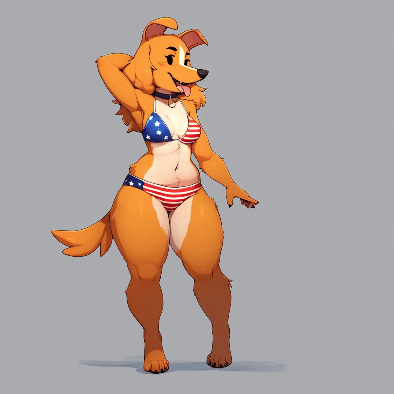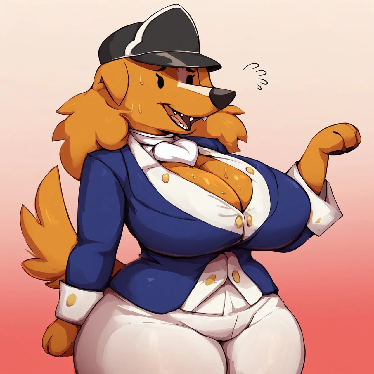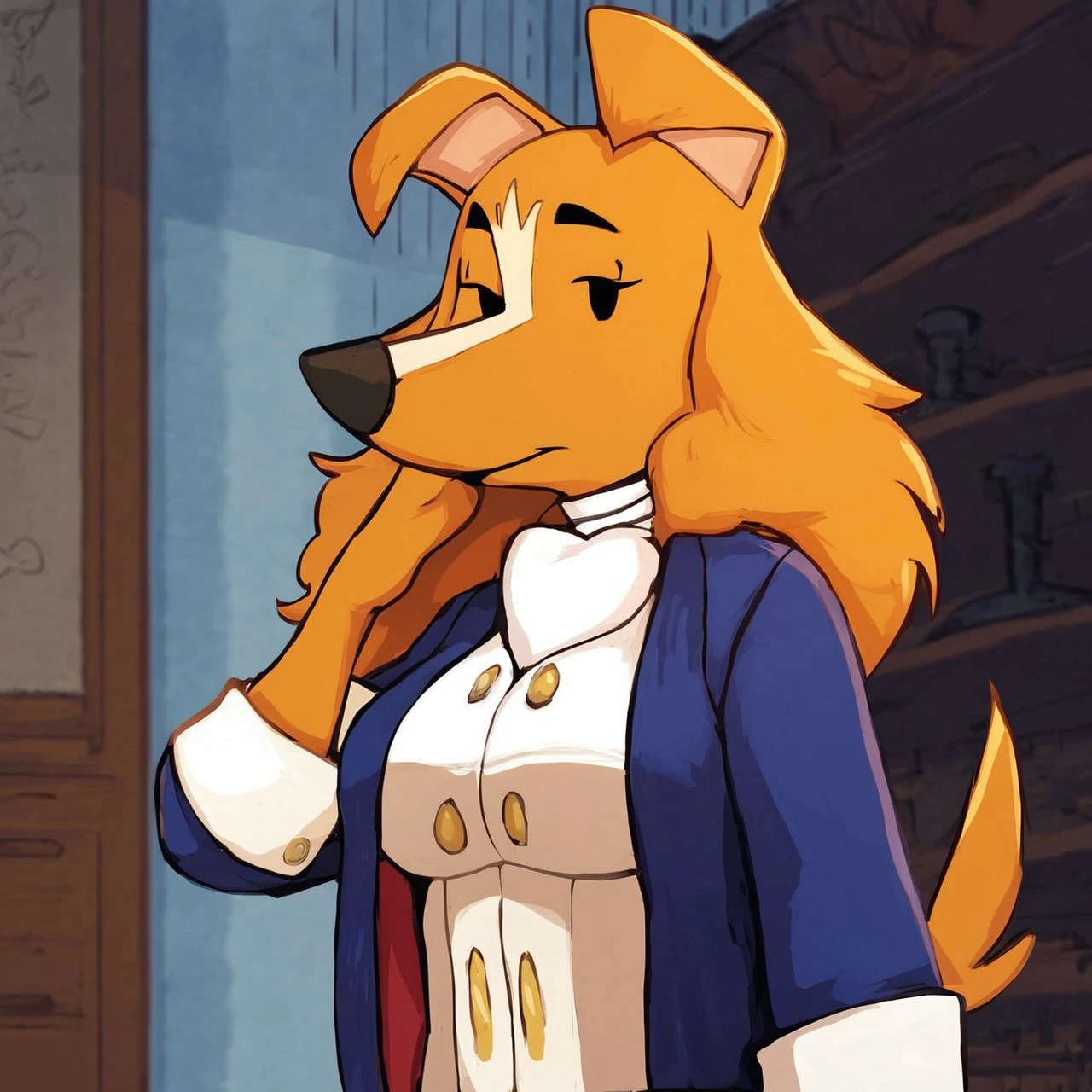 She looks like a Rough Collie and wears a military coat of the American Revolutionary War, she is crossdressing as a male soldier. Based in the real history of Deborah Sampson.