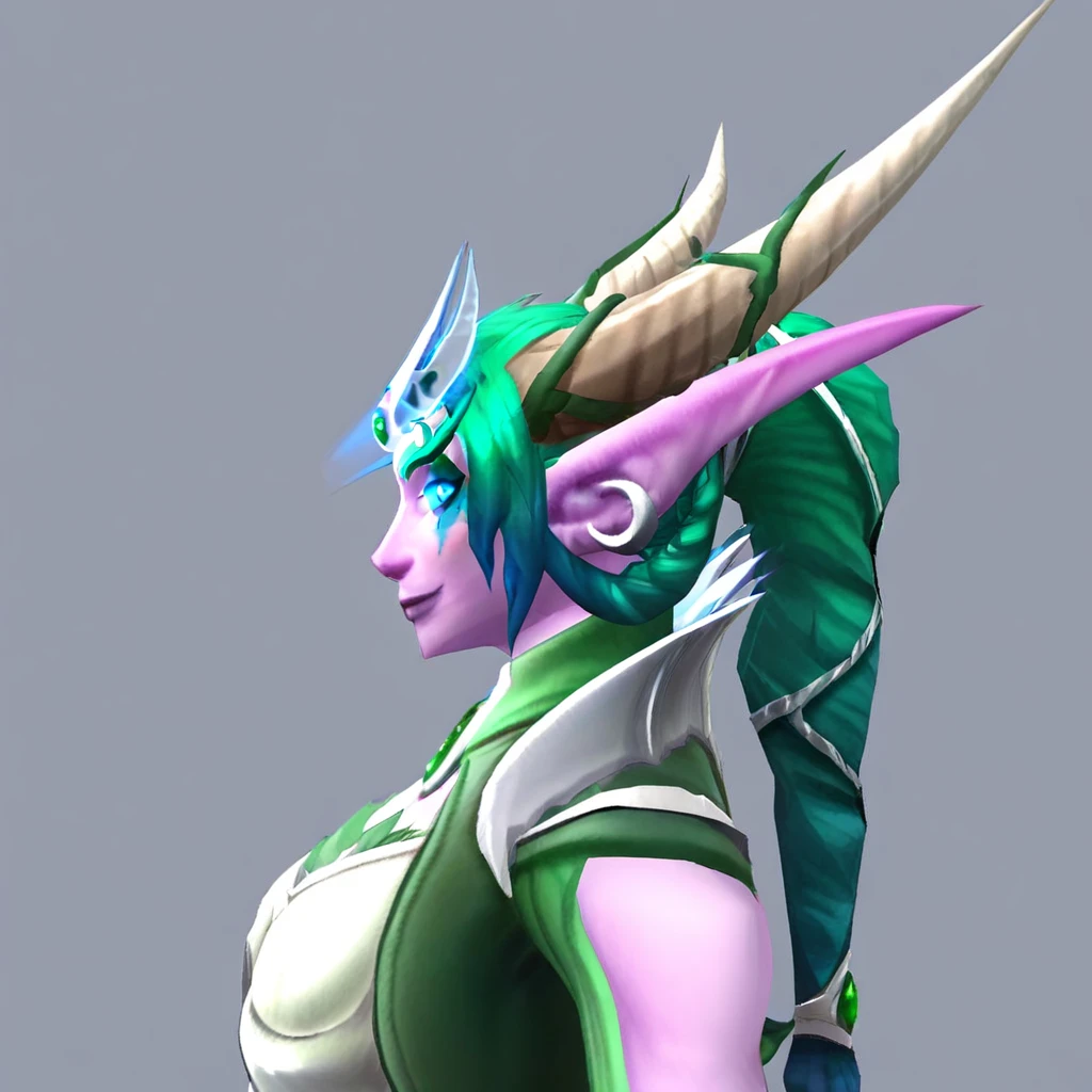 Night elf, Teal braided hair, small braids under ears, elf ears, long hair, silver and jade hair ornament, Silver tiara with saphire, White horns with ivy, blue glowing eyes, teal facial marking, long eyebrows, teal and white clothes, high collar, teal and silver shoes, naked shoulder, pelvic curtain, moon earings, Full Finger silver Ring, silver bracers with jade over clothes, baggy sleeves, glowing clothes underside,