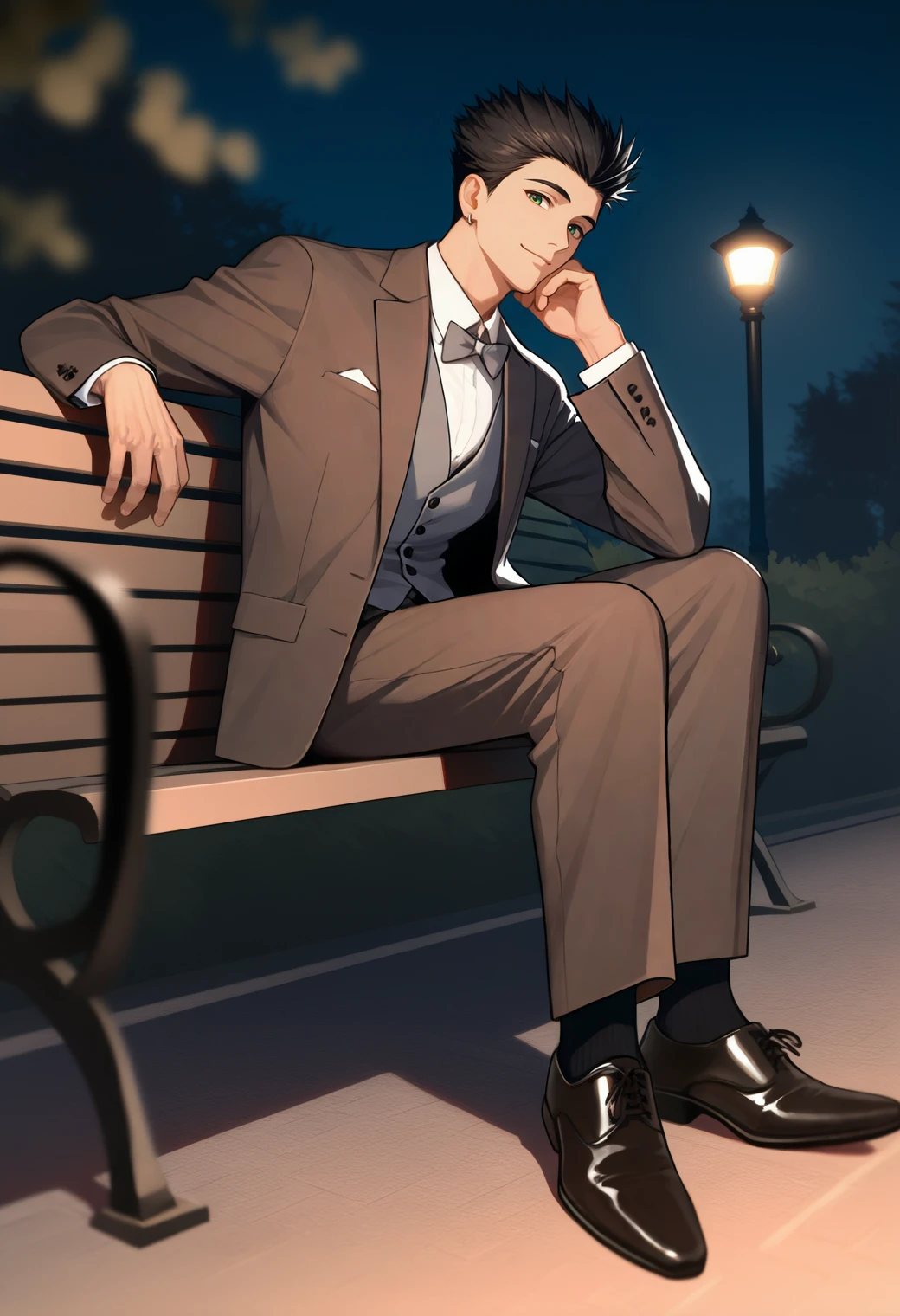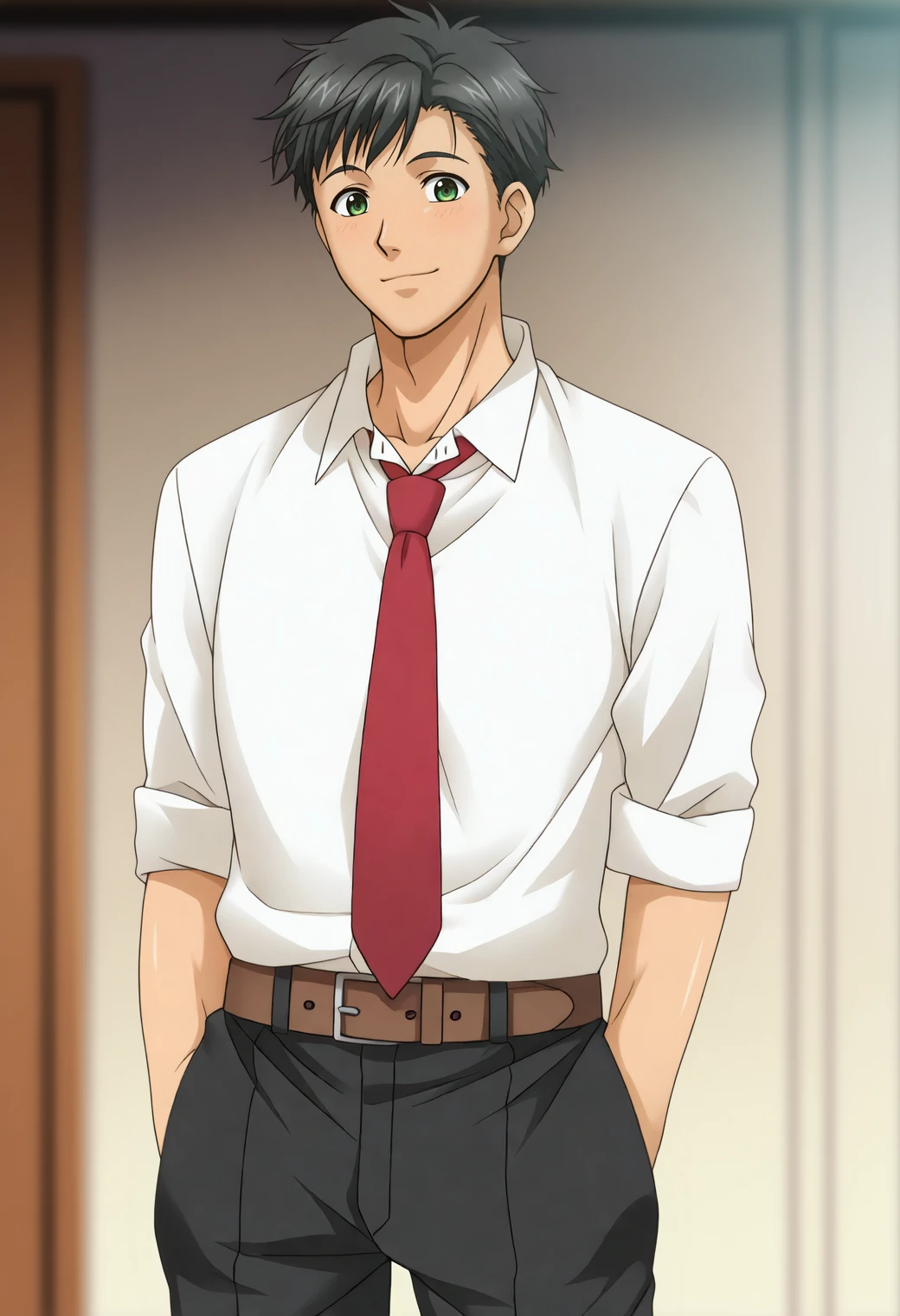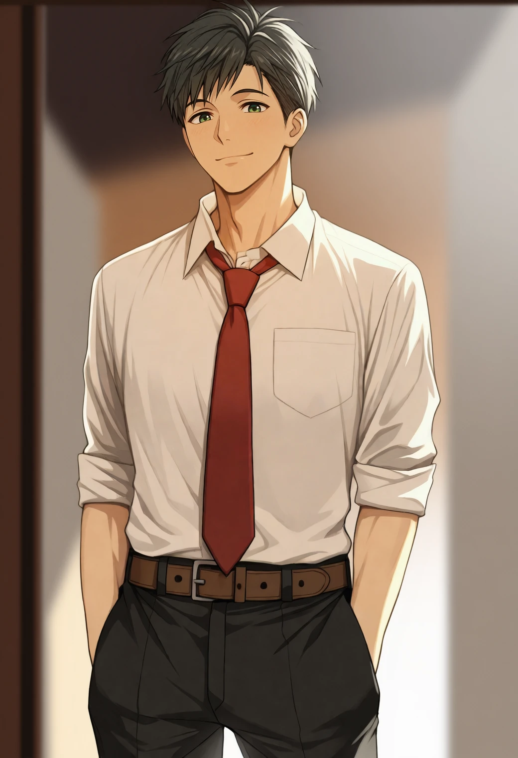hanegasaki academy school uniform, grey jacket, white collared shirt, black necktie- His classic school look!