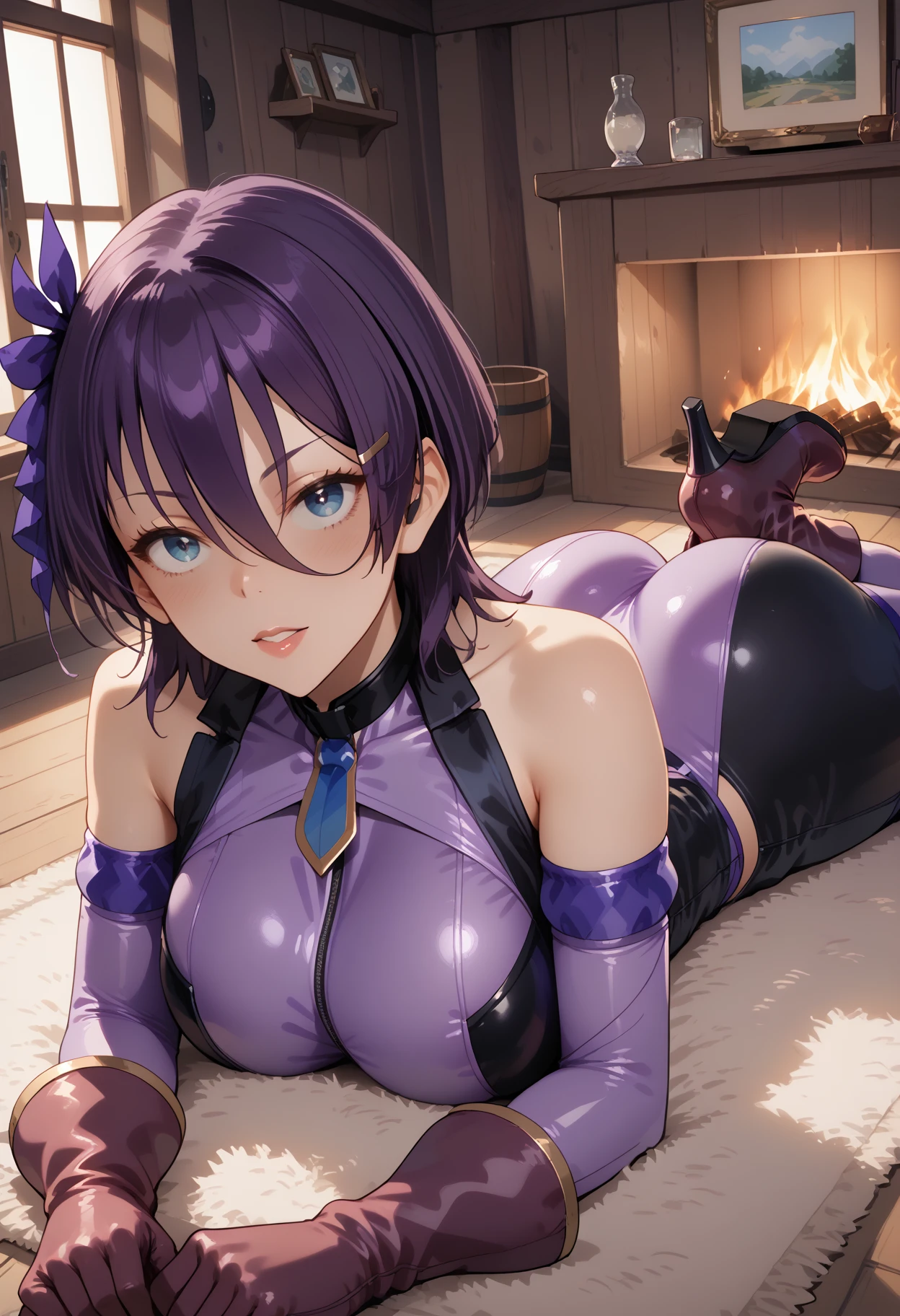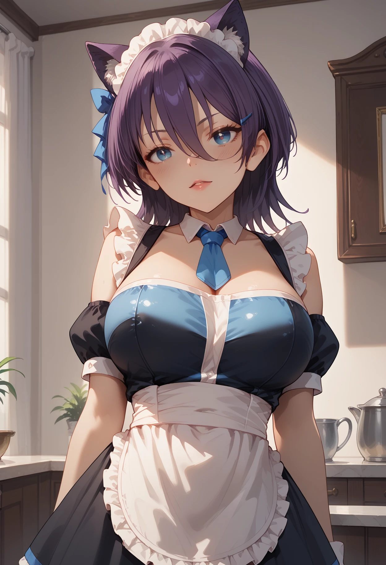 main tags: 1girl, solo, blue eyes, medium hair, purple hair, hair between eyes, bangs, breasts, large breasts, huge breasts,