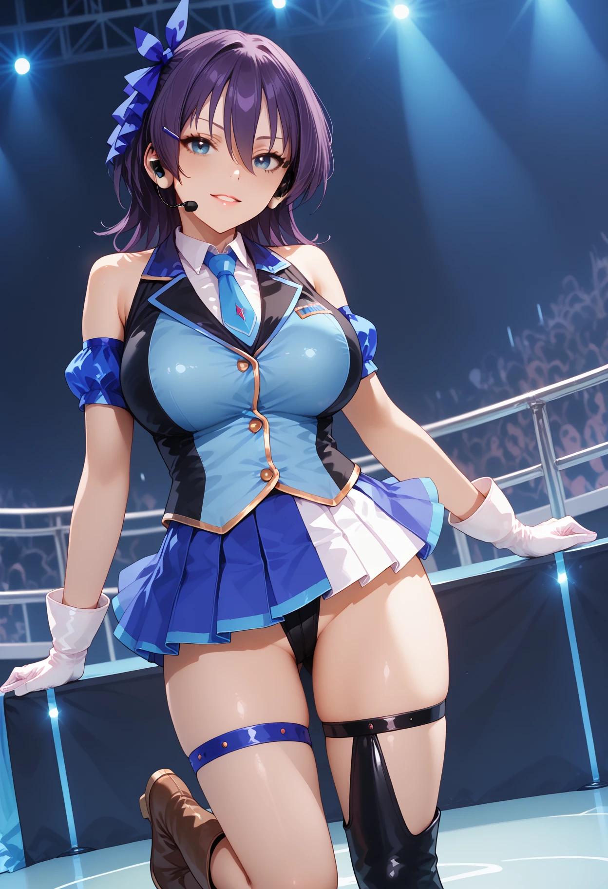main outfit tags: hair ornament, ribbon, hair ribbon, idol, idol clothes, bare shoulders, shirt, sleeveless, collared shirt, necktie, blue necktie, gloves, white gloves, skirt, blue skirt, pleated skirt, miniskirt, thighhighs, single thighhigh, thigh strap, boots, brown footwear, headset,