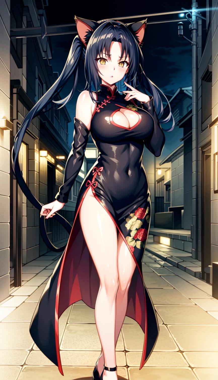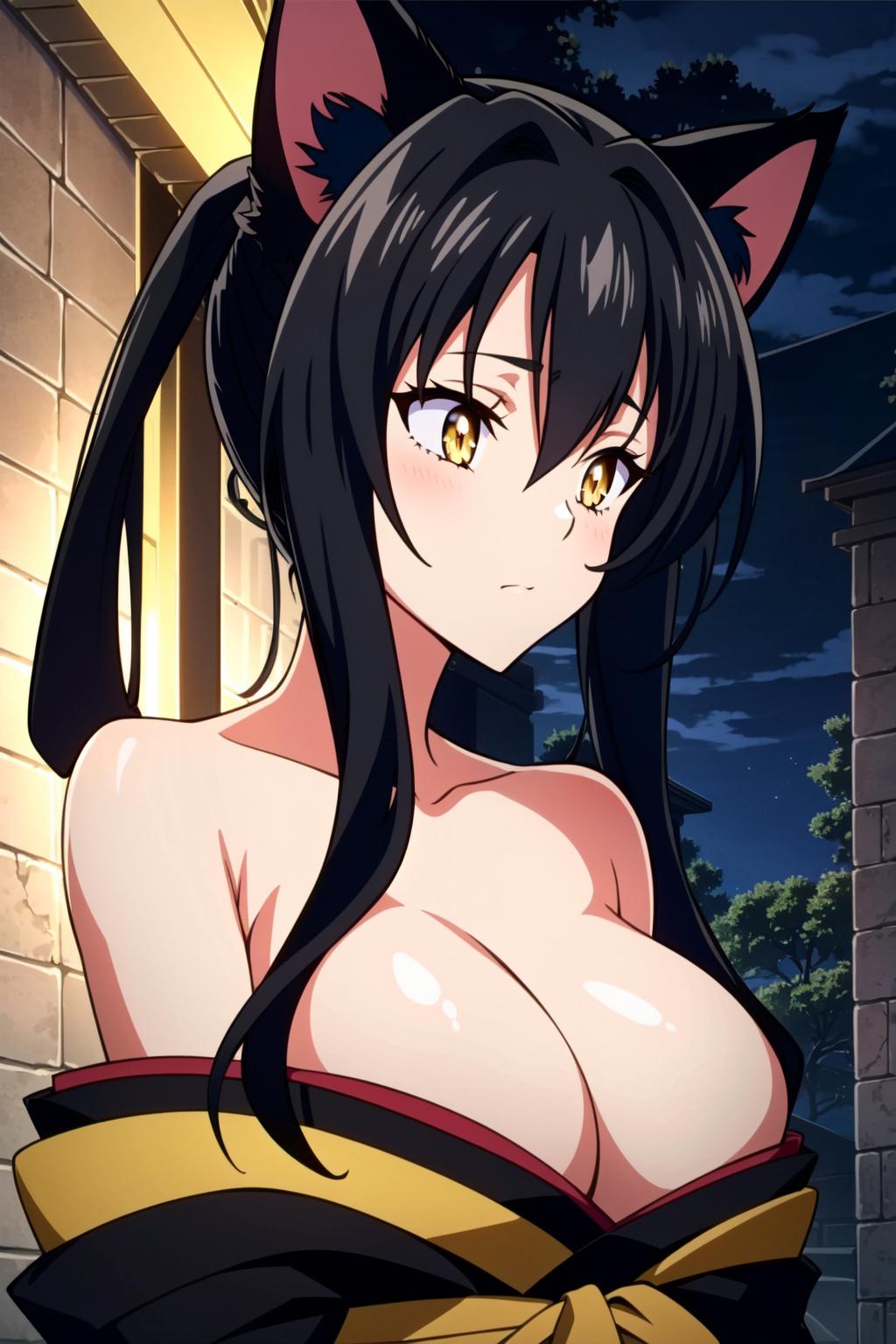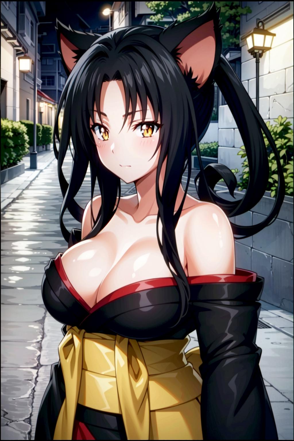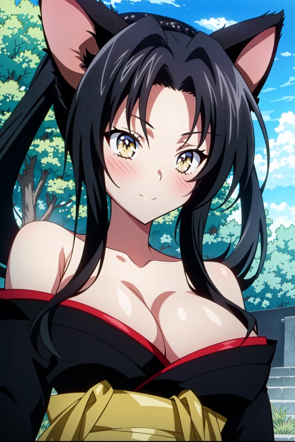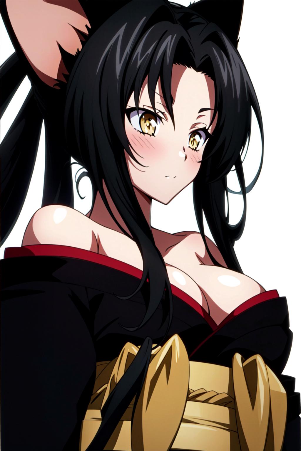 Kuroka Toujou, 1girl, breasts, animal ears, solo, black hair, cat ears, cleavage, japanese clothes, large breasts, hair rings, kimono, bare shoulders, long hair, off shoulder, makeup, yellow eyes, anime coloring, sash, lipstick, black kimono