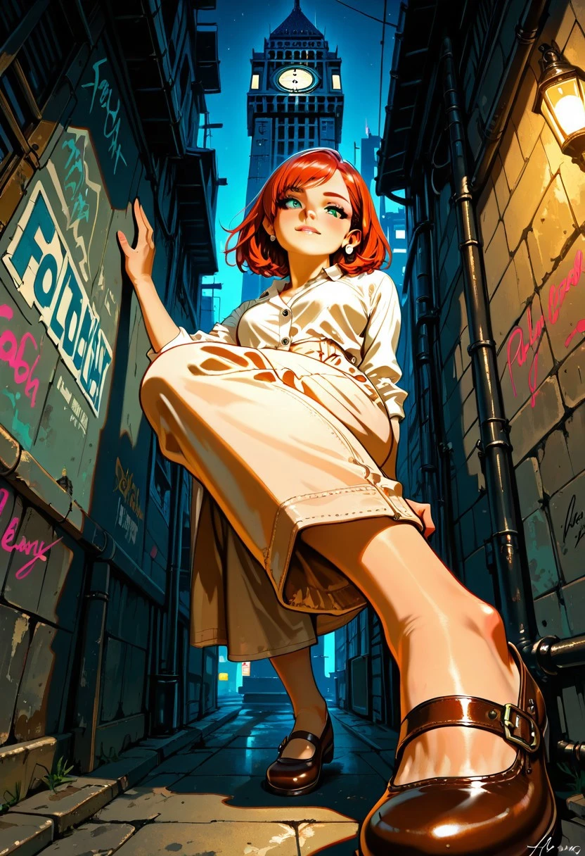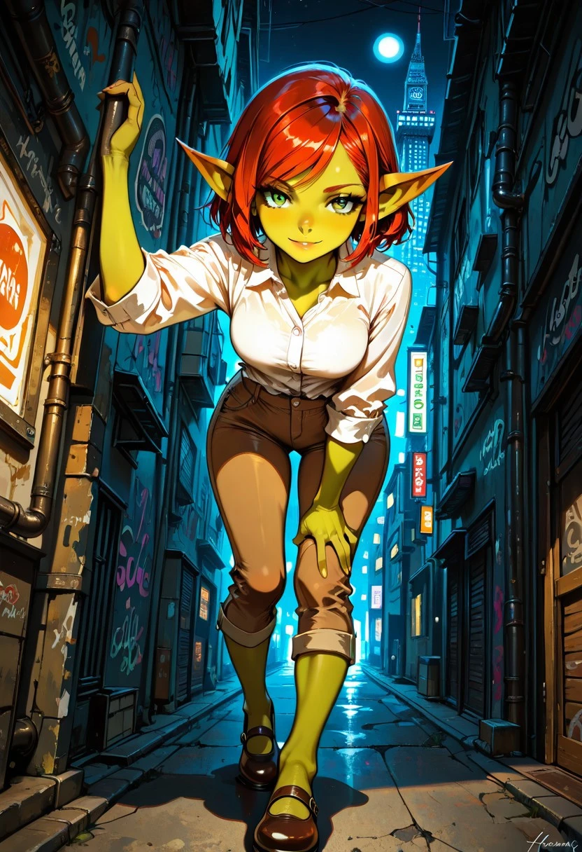 female goblin, short hair, red hair, green eyes, eyelashes, beige dress shirt, brown capri pants, brown footwear, brown Mary Janes