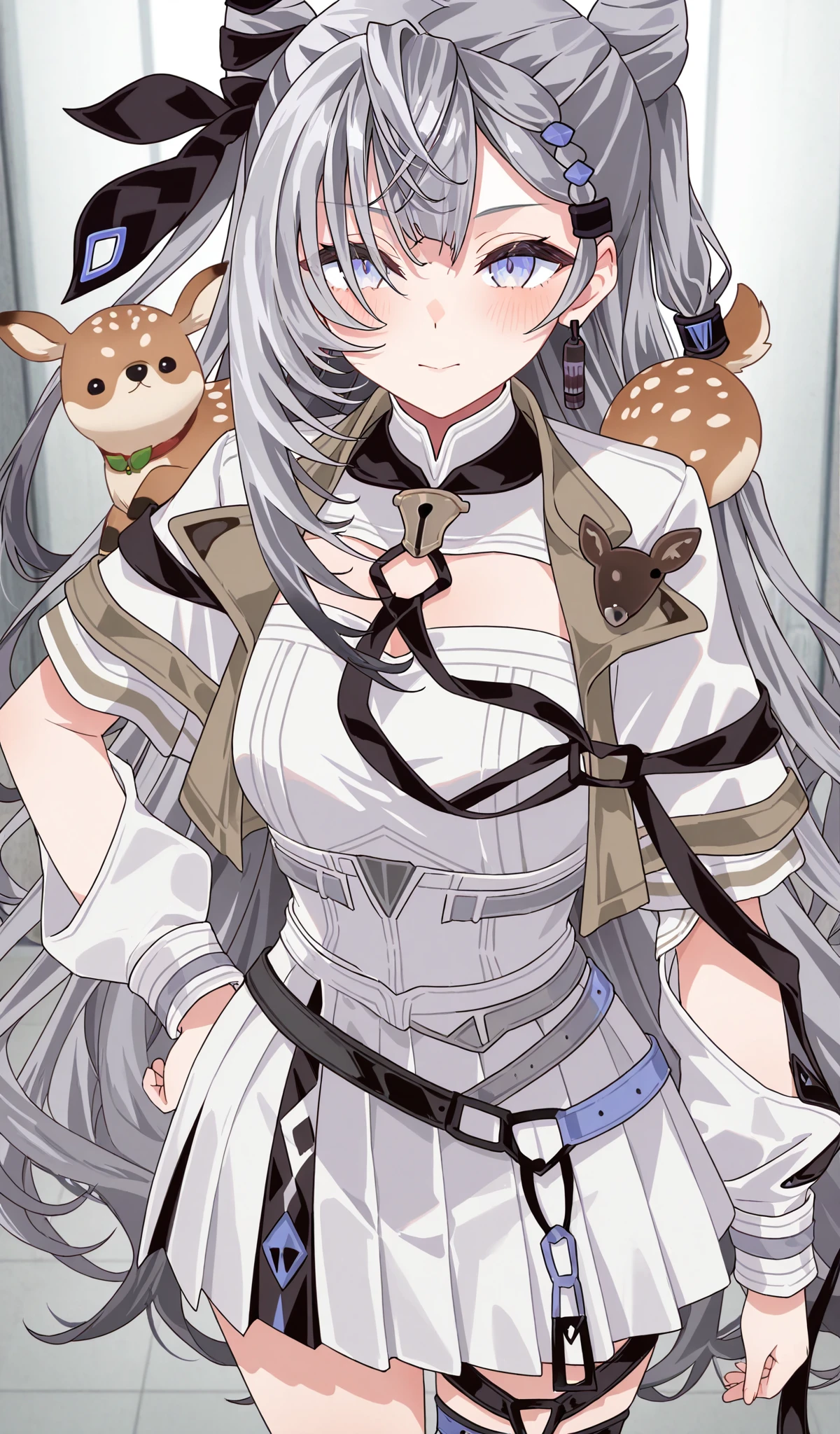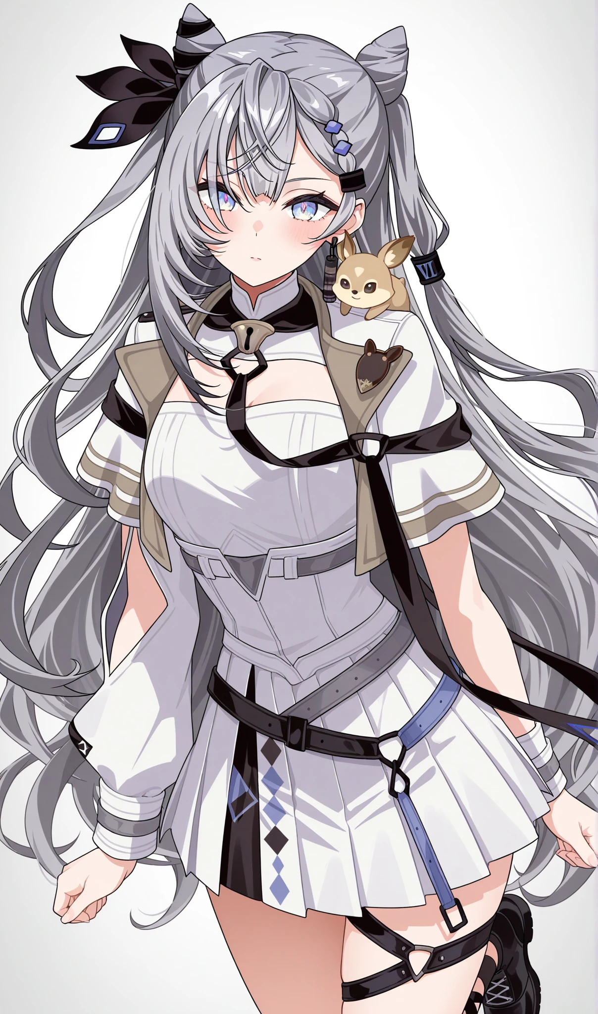 Hololive_VestiaZeta, (((Vestia_Zeta))), gray hair, light blue eyes, long hair, twin hair buns, side braid, bangs, hair beads, roman numeral hairpin, VII hairpin, hair ribbon, blue eyes, earrings, tactical outfit, white and black clothing, cleavage cutout, choker, shoulder cape, cloak, diamond pattern, deer-shaped brooch, shoulder brooch, glowing brooch eyes, small animal pin, asymmetrical sleeves, belt, pleated skirt, thigh strap, black shoes
