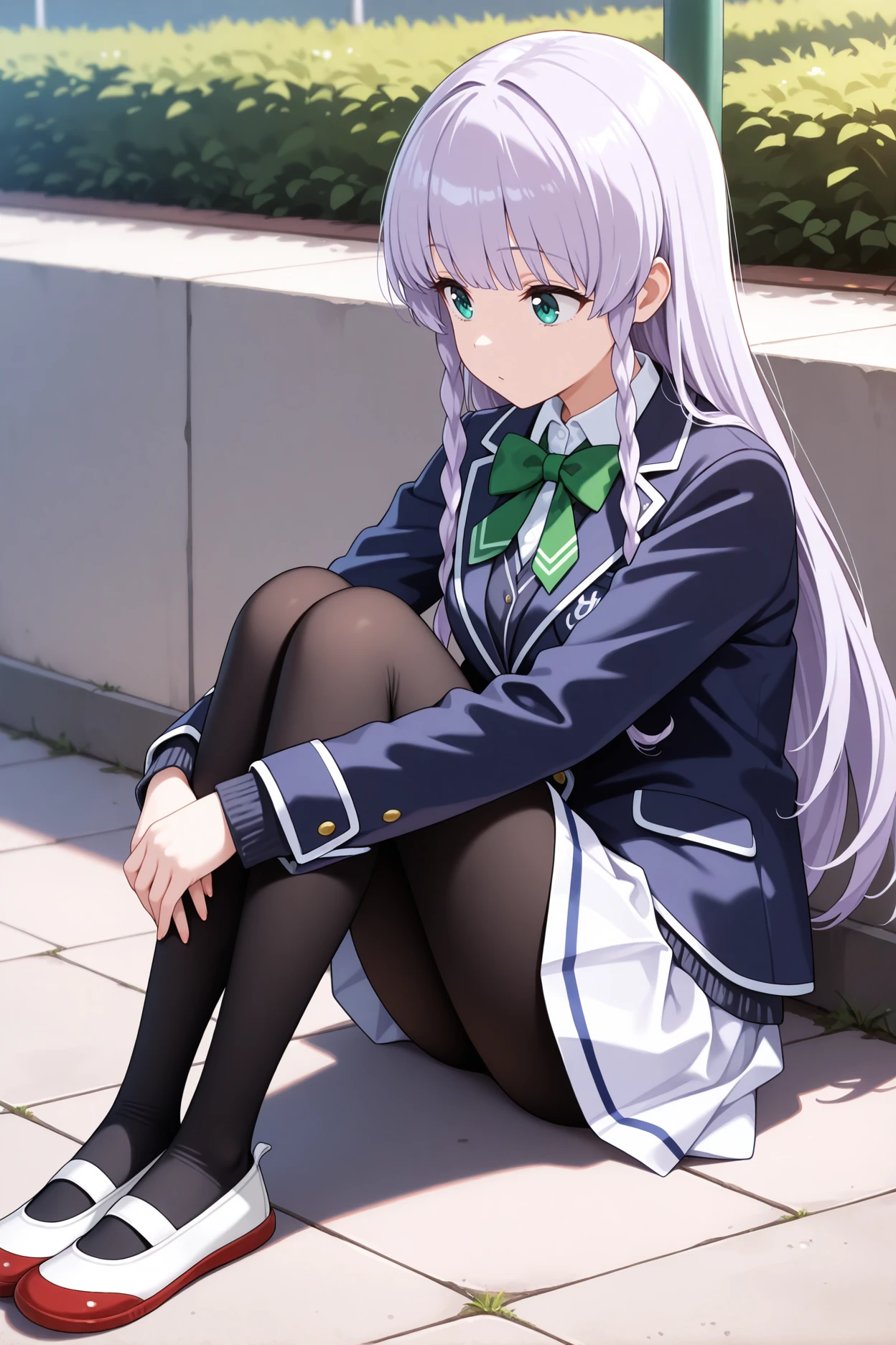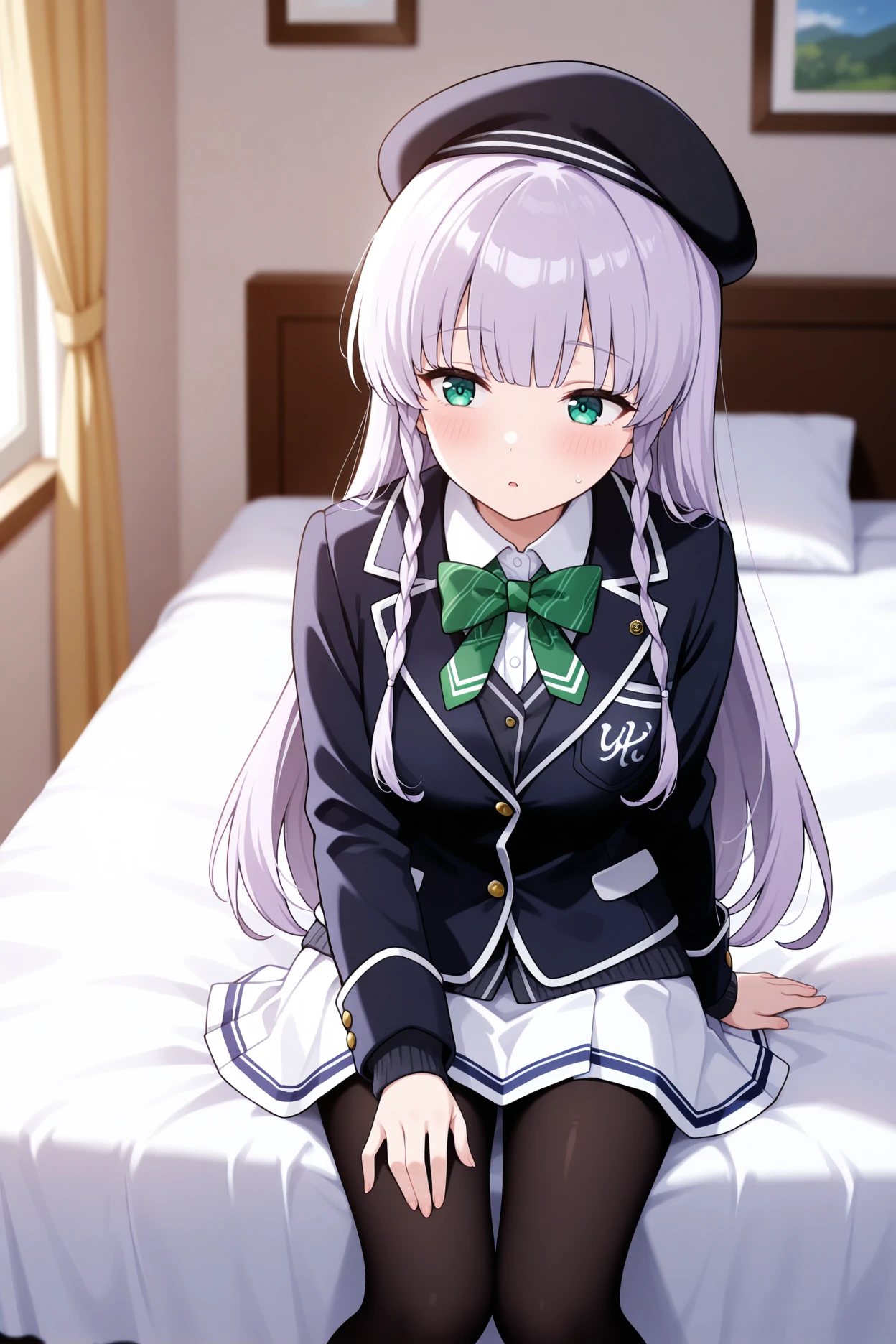 b0se0utfit, school uniform, black headwear, jacket, blazer, long sleeves, green bowtie, white shirt, collared shirt, white skirt, black leggings, uwabaki,