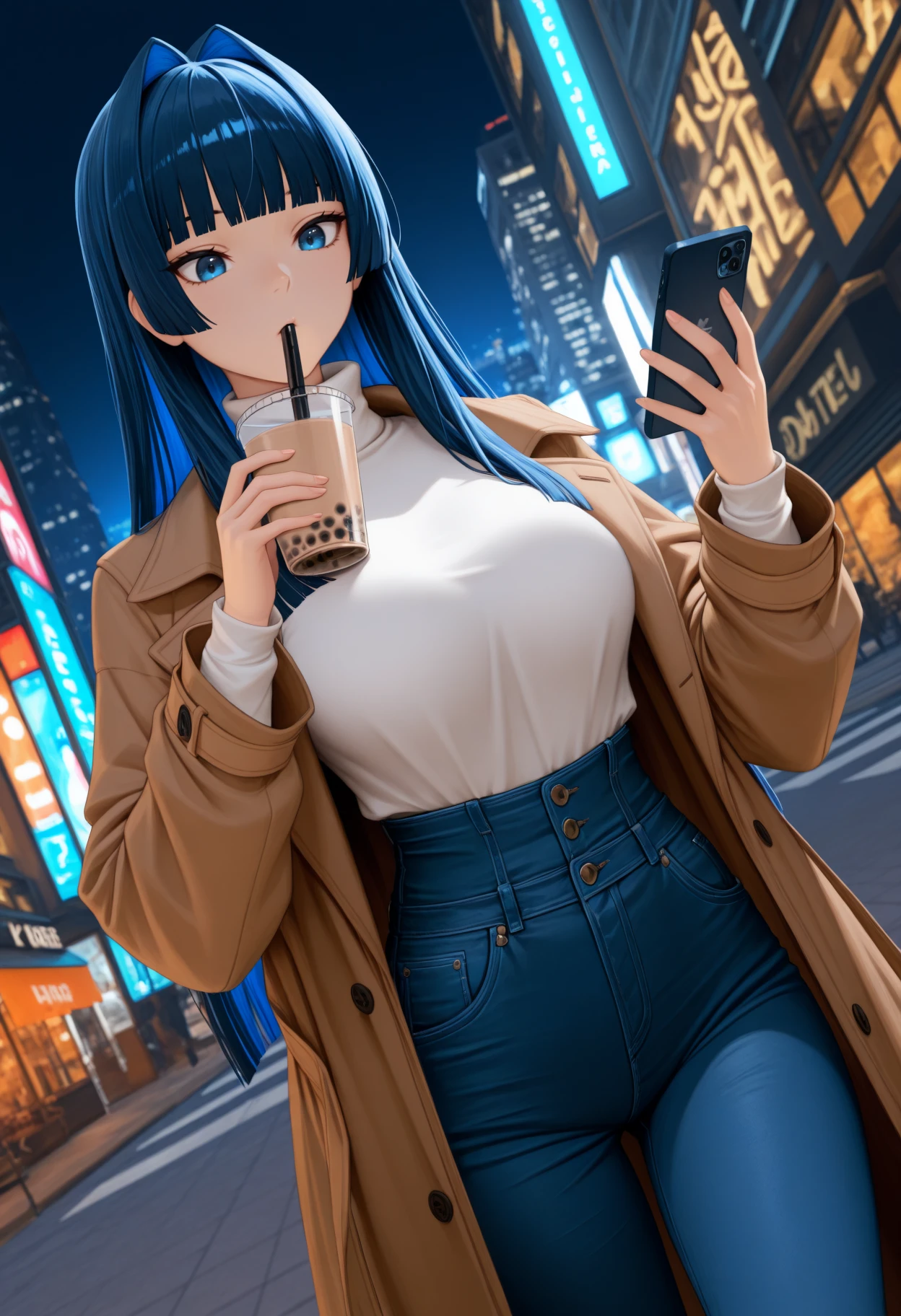 Kr0niiCas, blue eyes, blue hair, long hair, hime cut, hair intakes, white turtleneck, brown coat, open coat, high-waist jeansCasual (without coat):