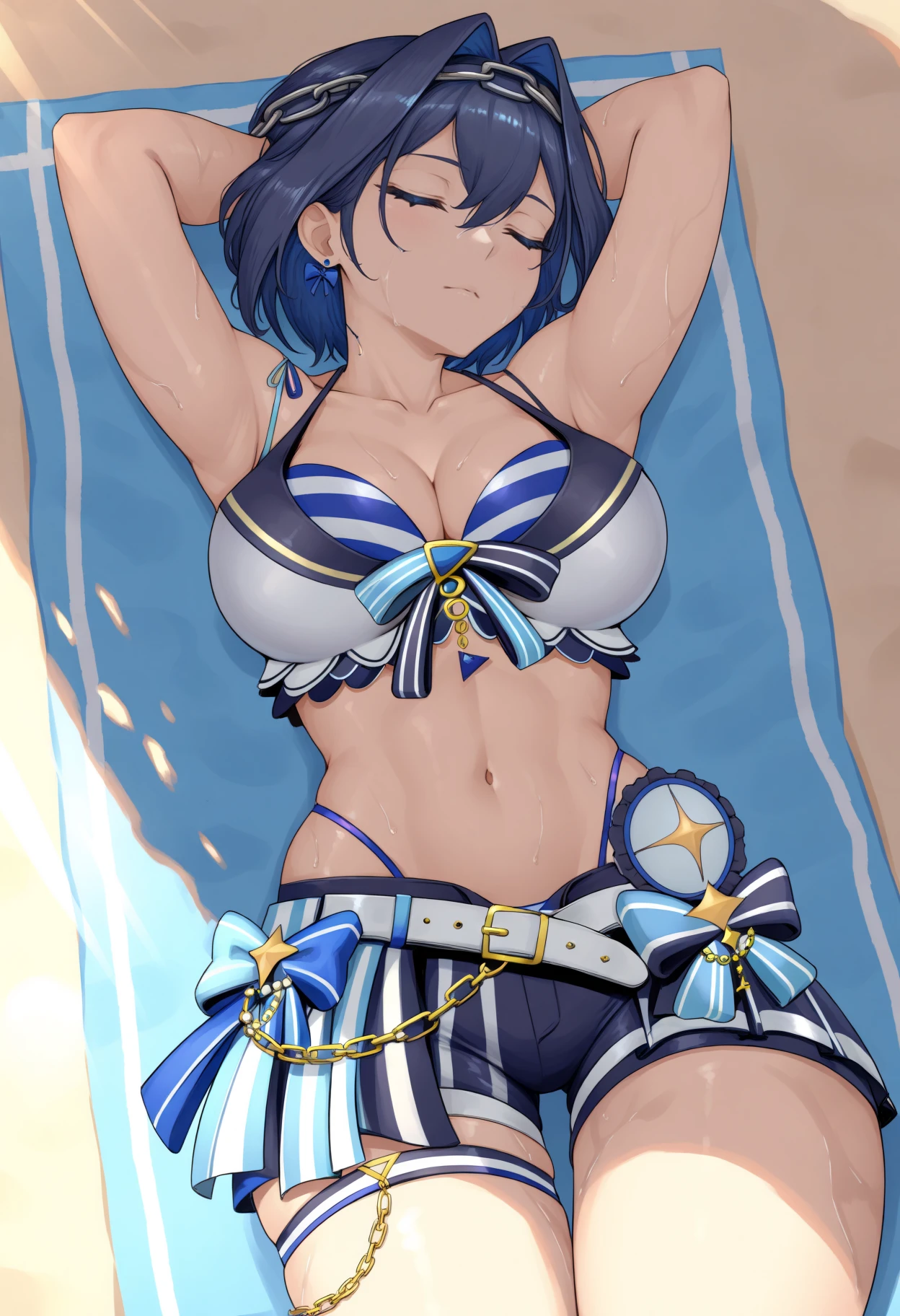 Kr0niiSum, blue eyes, blue hair, short hair, hair intakes, chain headband, bow earrings, layered bikini, striped bikini, blue bikini, white bikini, front-tie bikini top, highleg, white belt, bikini shorts, blue waist bow, thigh strapIdol (Bright version):