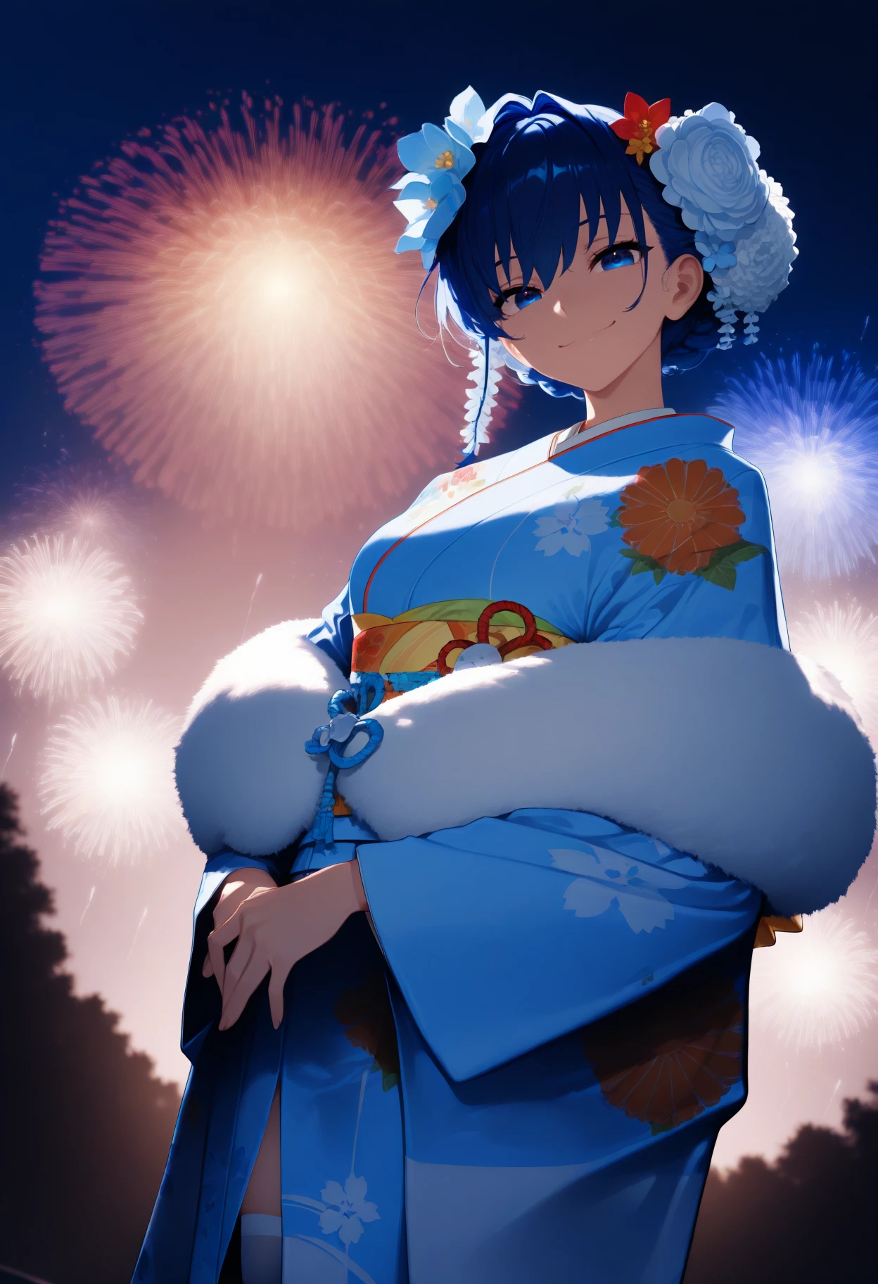 Kr0niiNwyrs, blue eyes, blue hair, short hair, braid, hair bun, hair flower, blue kimono, floral print, fur scarf, obi, side slit, white thighhighsMafia (with coat):