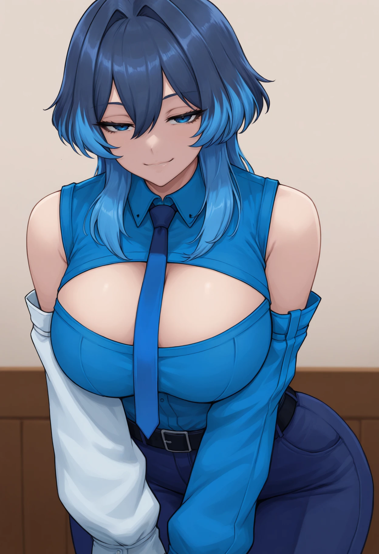Kr0niiMfa, blue eyes, blue hair, medium hair, wolf cut, hair intakes, blue shirt, collared shirt, cleavage cutout, blue necktie, tucked in, detached sleeves, asymmetrical sleeves, white sleeve, blue sleeve, black belt, blue pantsMaid (with apron):