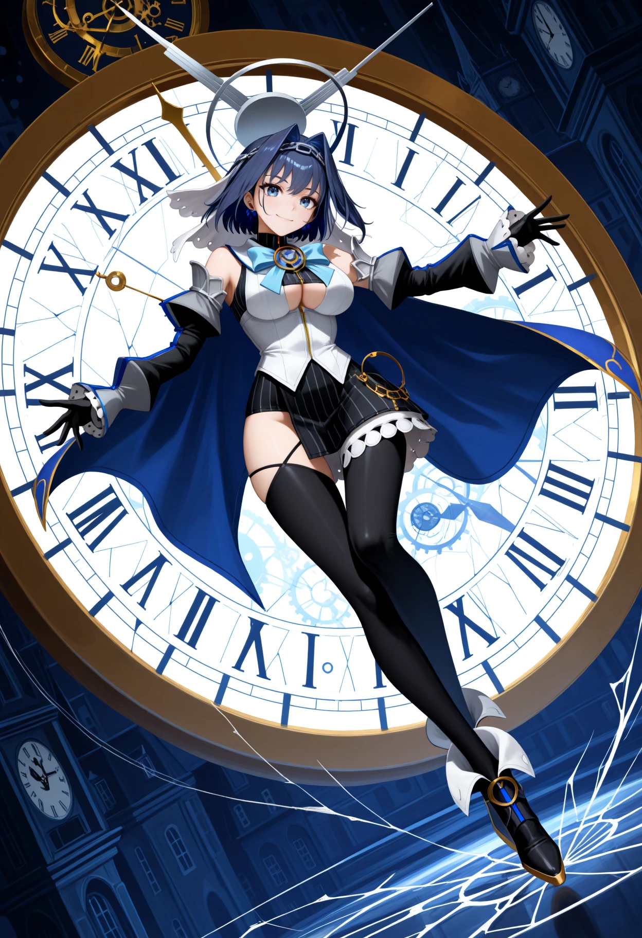 Kr0niiDef, blue eyes, blue hair, short hair, hair intakes, chain headband, bow earrings, mechanical halo, white veil, striped crop top, zipper, white vest, clothing cutout, blue bow, detached sleeves, black gloves, black skirt, half-skirt, striped skirt, black thighhighs, blue capeCasual (with coat):