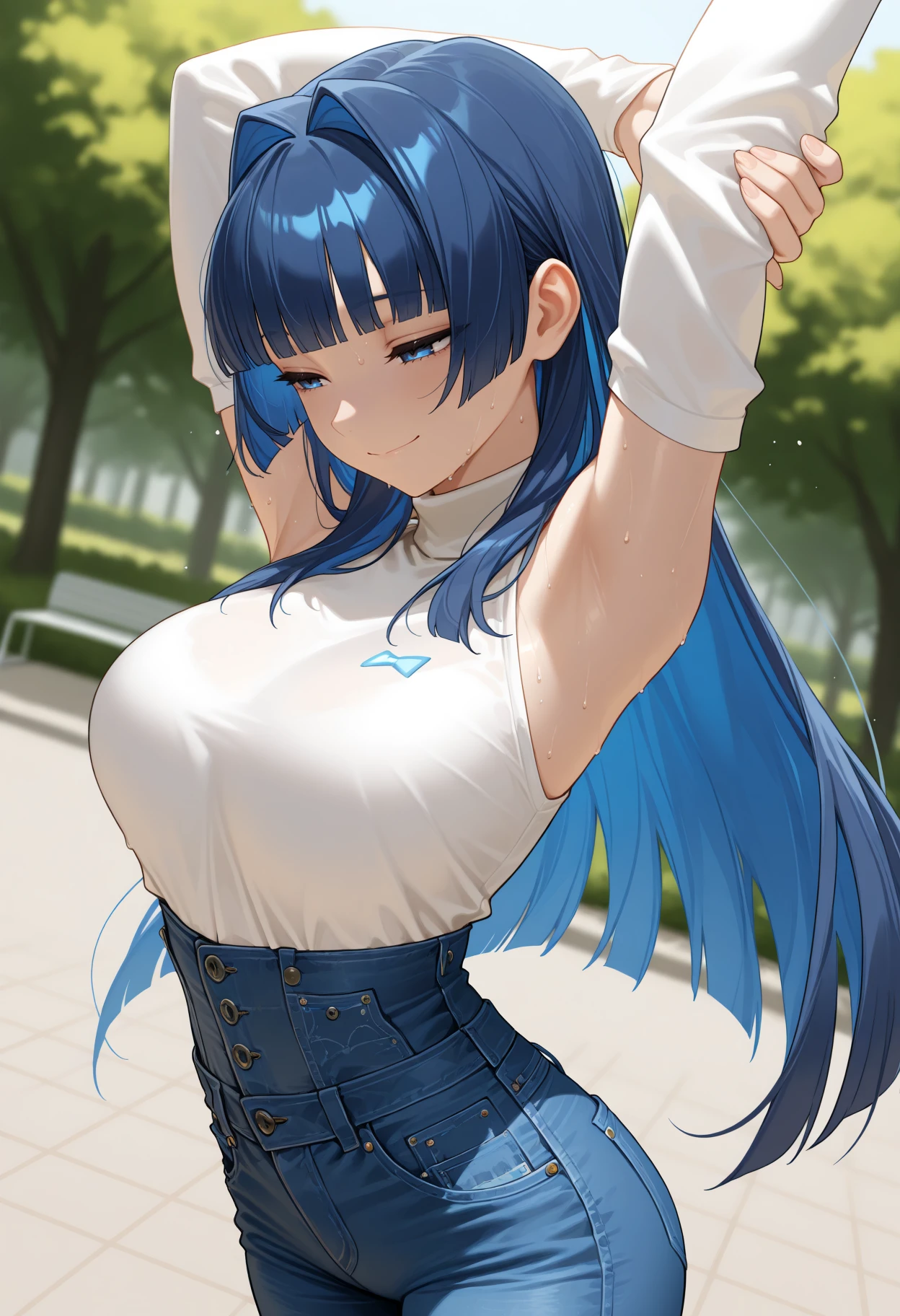 Kr0niiCas, blue eyes, blue hair, long hair, hime cut, hair intakes, white turtleneck, detached sleeves, long sleeves, bare shoulders, high-waist jeansCasual (shorts version):