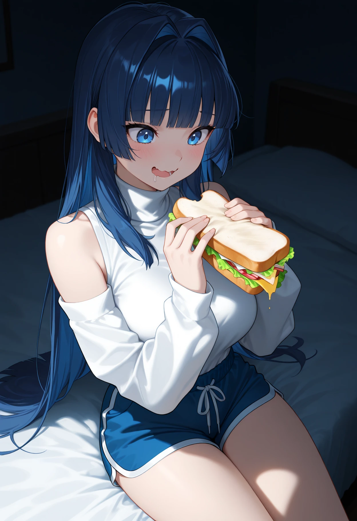 Kr0niiCas, blue eyes, blue hair, long hair, hime cut, hair intakes, white turtleneck, detached sleeves, long sleeves, bare shoulders, blue shorts, dolphin shortsNew Year's Kimono: