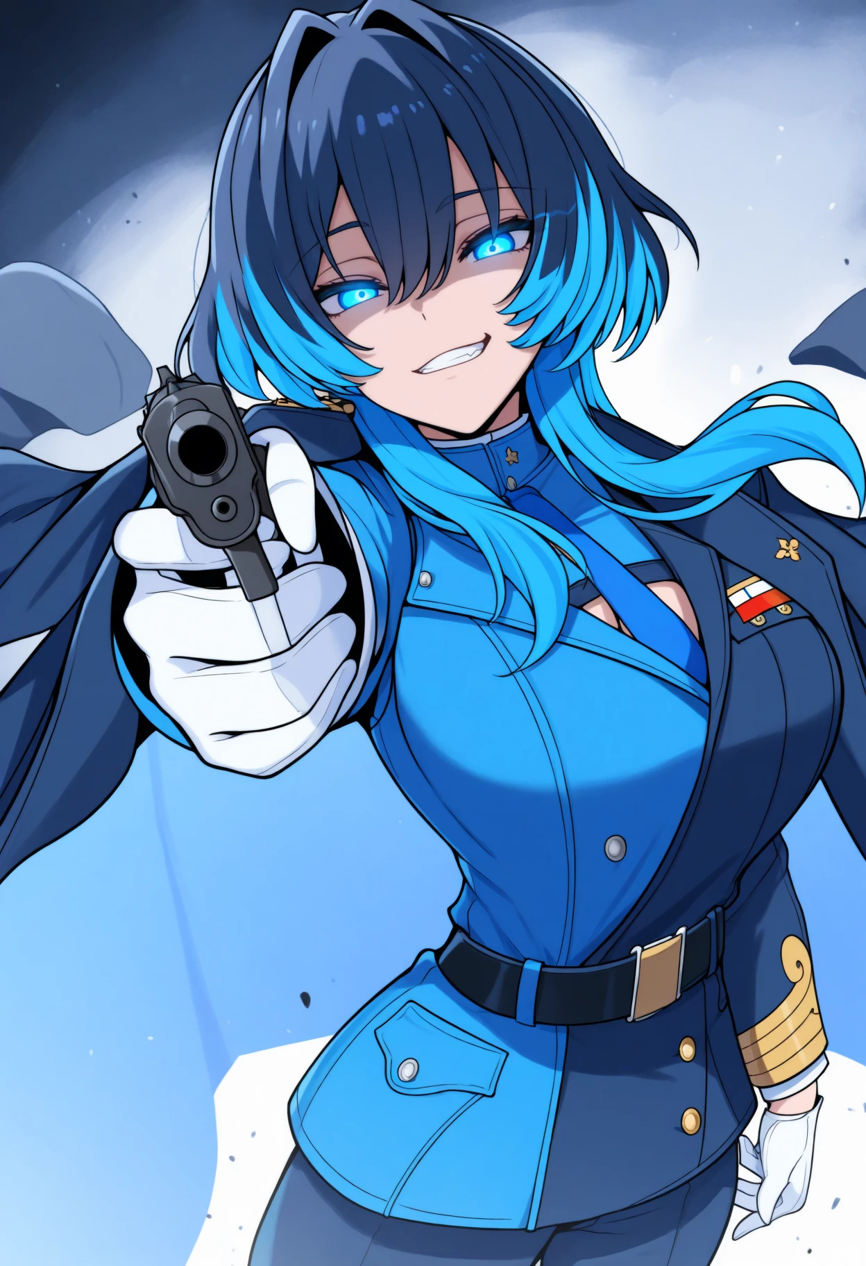 Kr0niiMfa, blue eyes, blue hair, medium hair, wolf cut, hair intakes, military uniform, blue coat, coat on shoulders, multicolored military jacket, black jacket, blue jacket, blue necktie, blue waistcoat, white gloves, black belt, blue pants, thigh strapMafia (without coat):