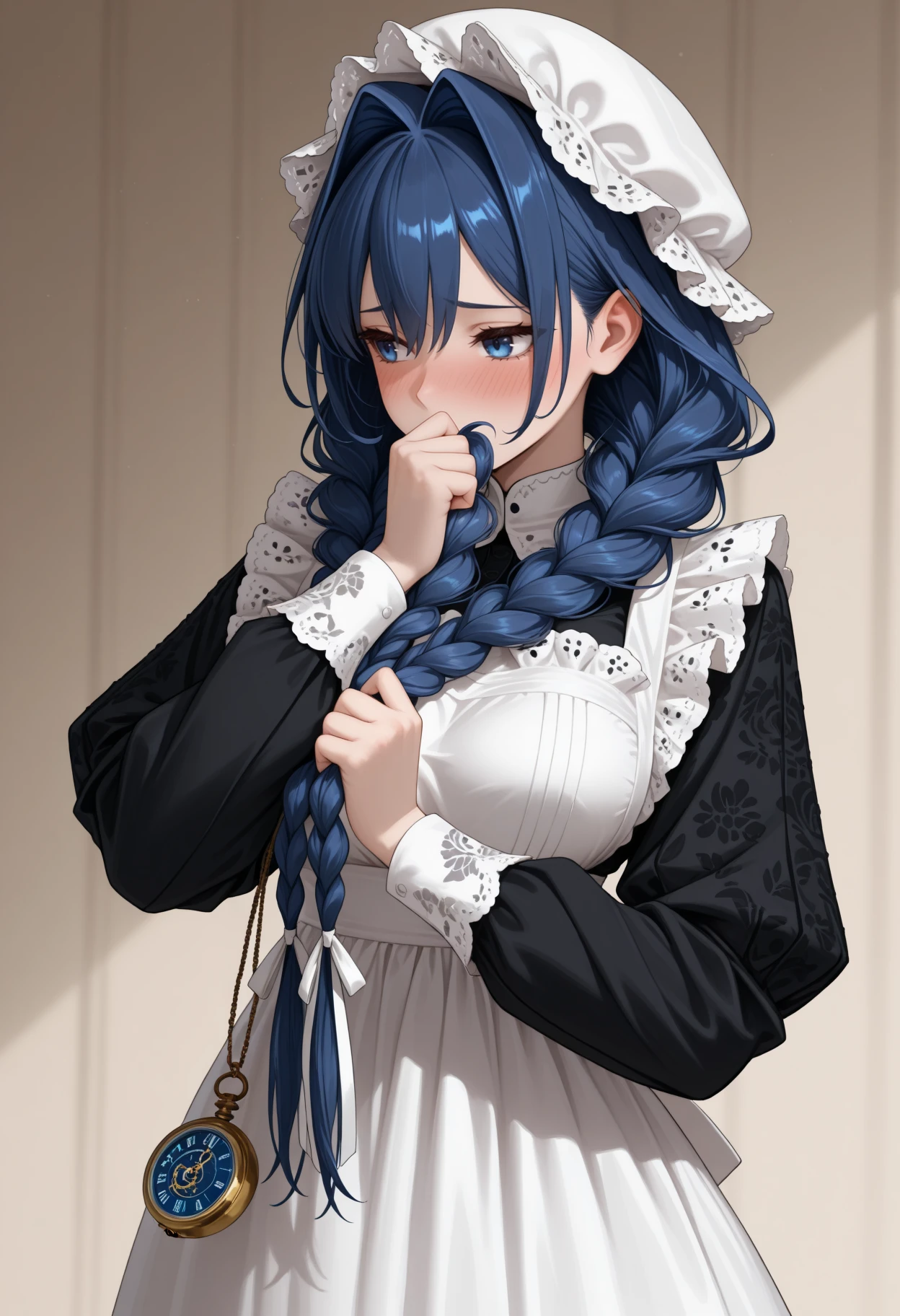 Kr0niiM4id, blue eyes, blue hair, long hair, hair intakes, low twin braids, hair over shoulder, hair ribbon, white ribbon, white mob cap, puritan collar, long dress, black dress, frilled apron, white apron, embroidery, empire waist, long sleeves, pocket watchMaid (without apron):