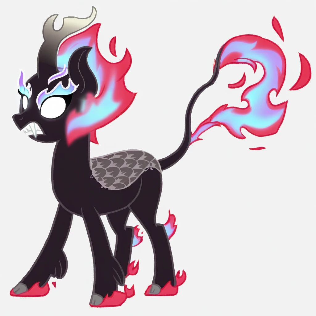 <lora:MLP - Nirik Transformation:1>, nirik, kirin transformation, dark kirin, fiery mane and tail, glowing white eyes, flaming hooves,