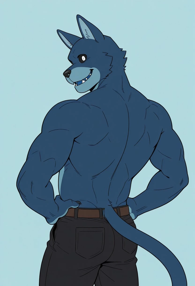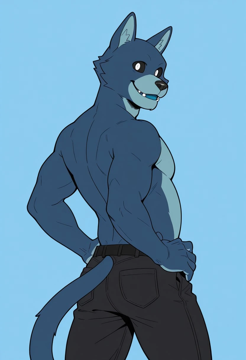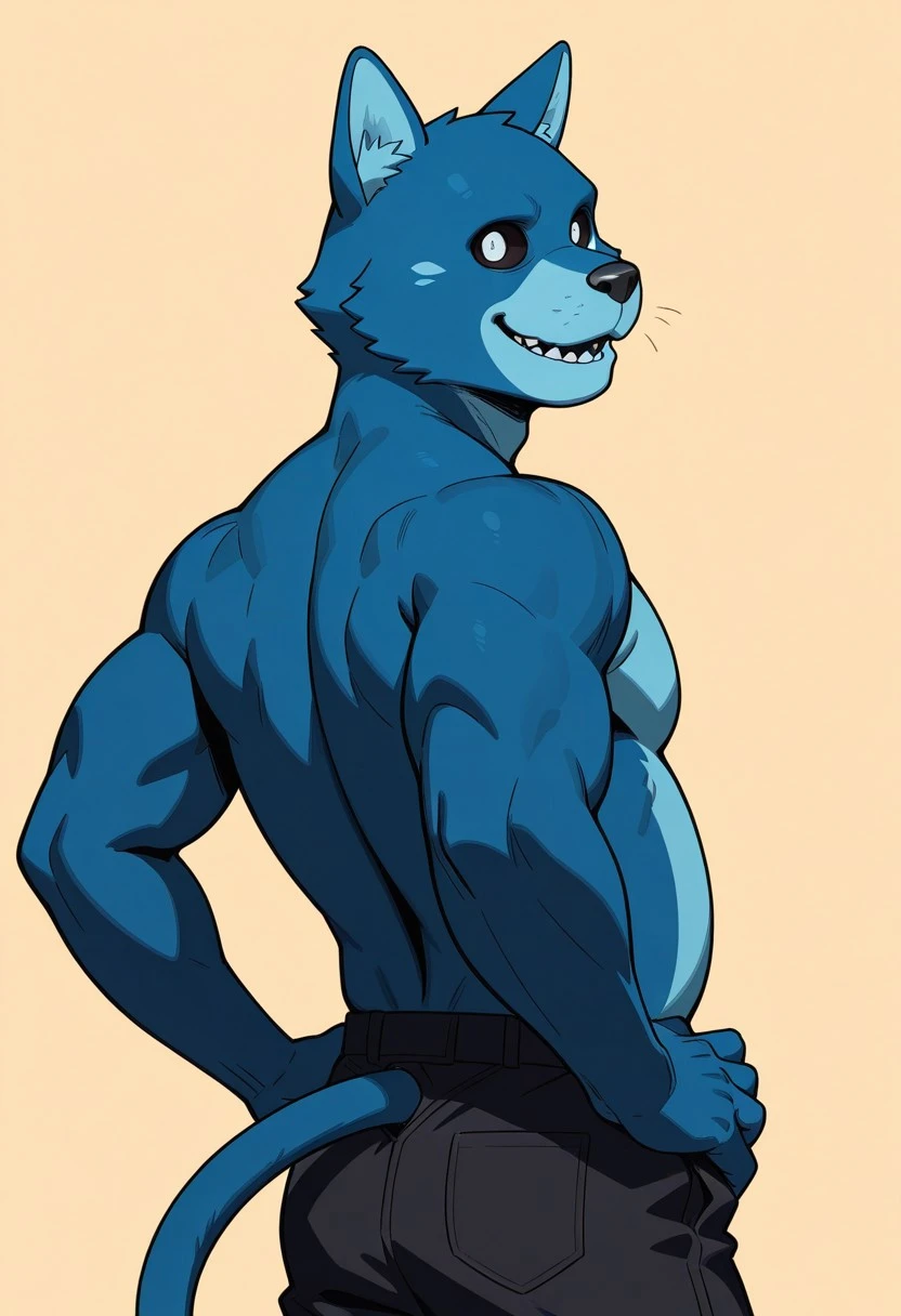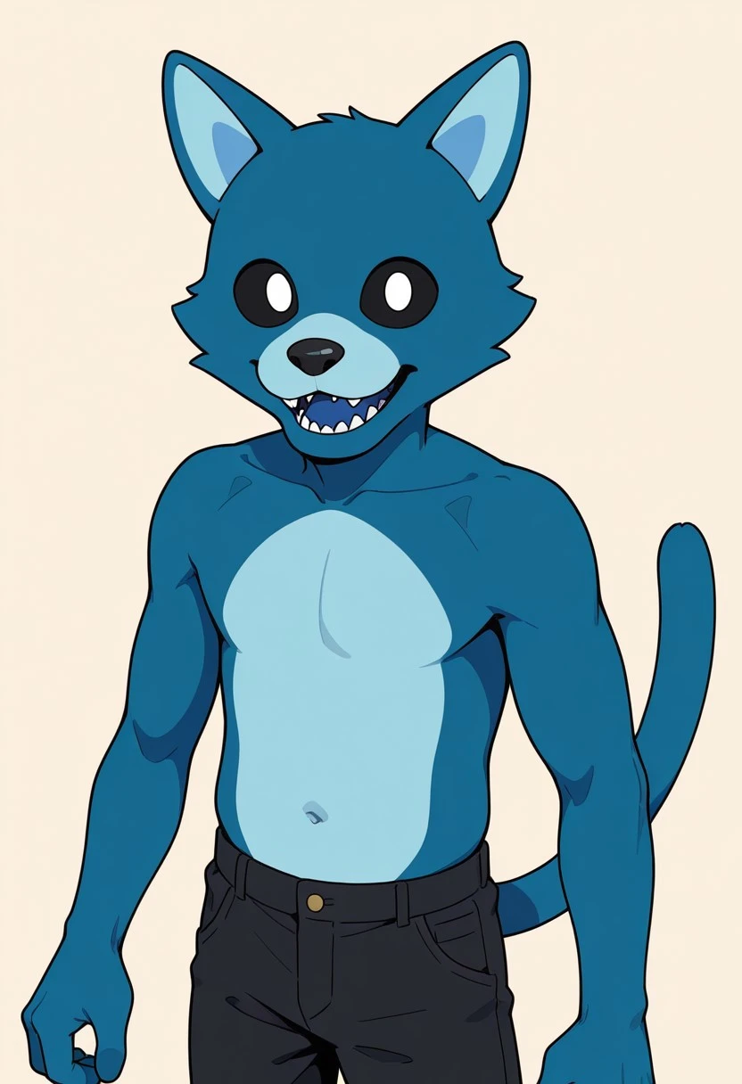 solo,male,anthro cat,dark-blue fur,blue mouth,light-blue stomach,light-blue inner ears,black sclera,white pupils,cheek tufts,cat tail,no eyebrows,black nose,
