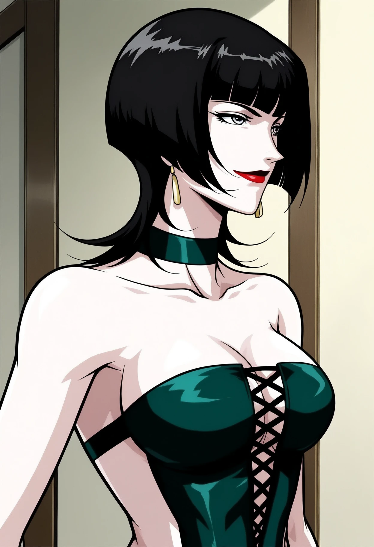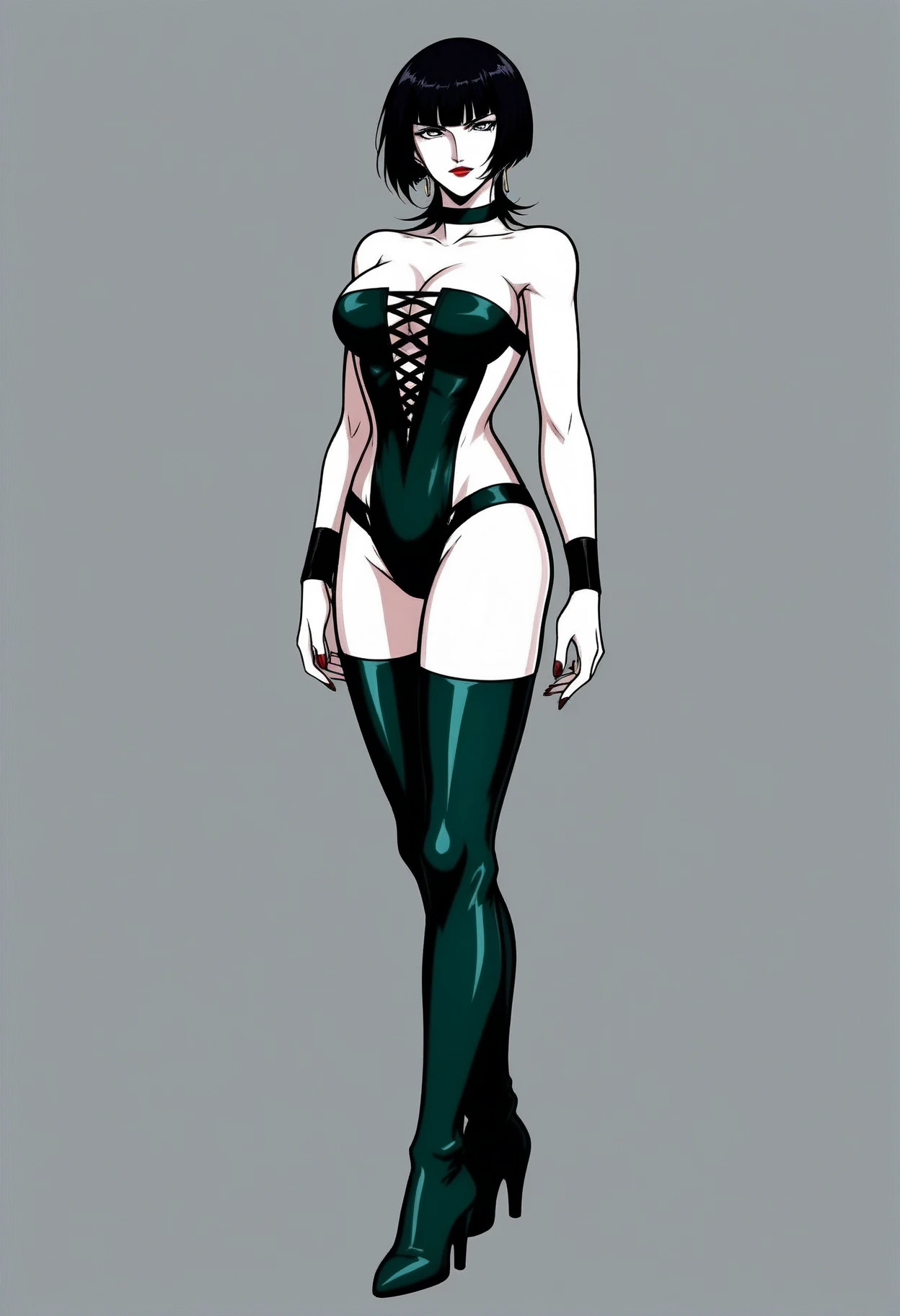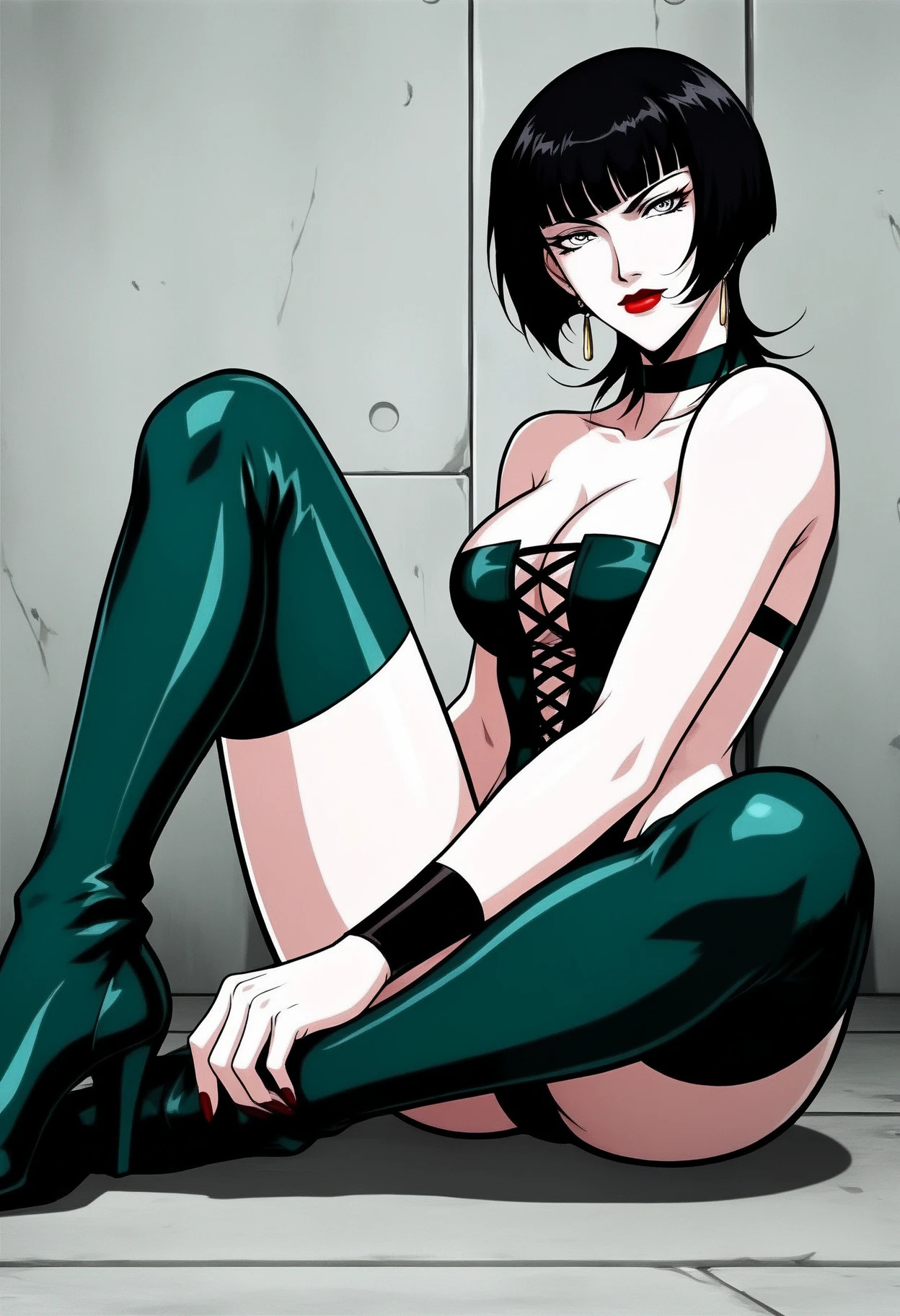 1,yedaofangzhi, 1girl, solo, jewelry, black hair, earrings, boots, short hair, thighhighs, high heels, Green fitted top, thigh boots, choker, high heel boots, looking at viewer, red nails, sitting, makeup, cleavage, red lips, nail polish, Japanese animation