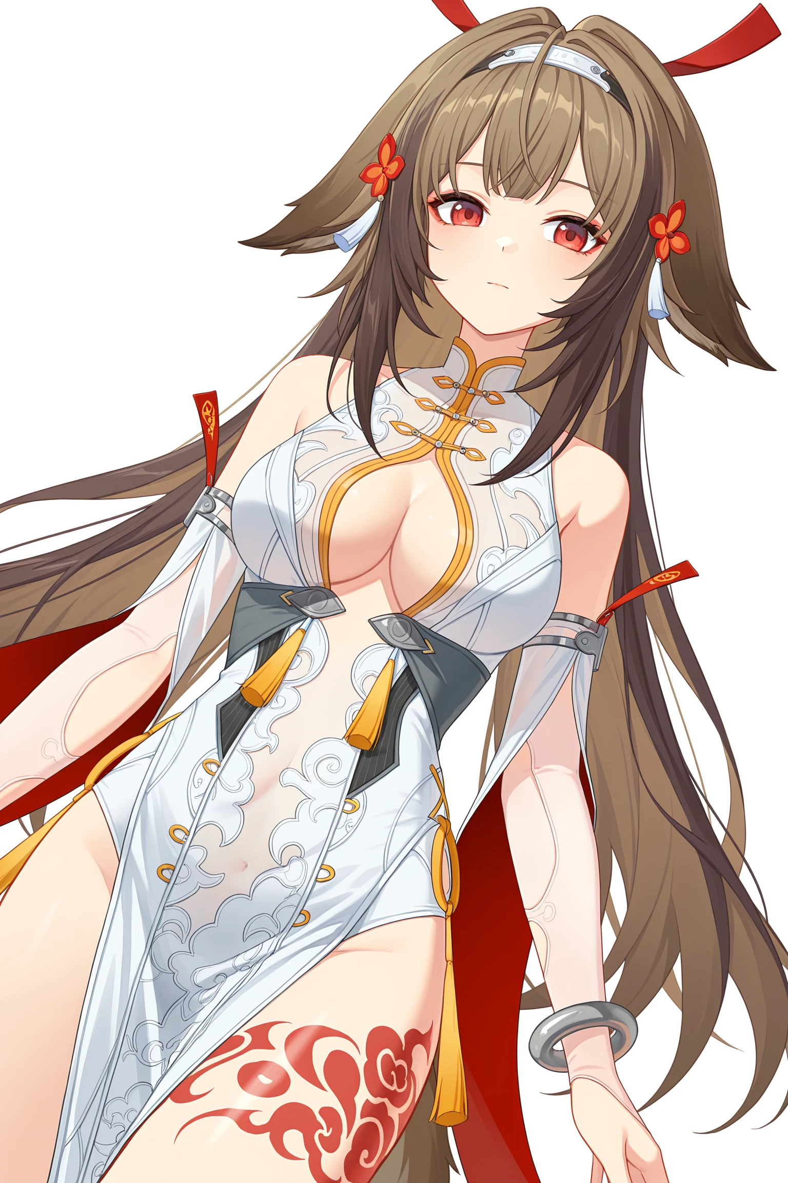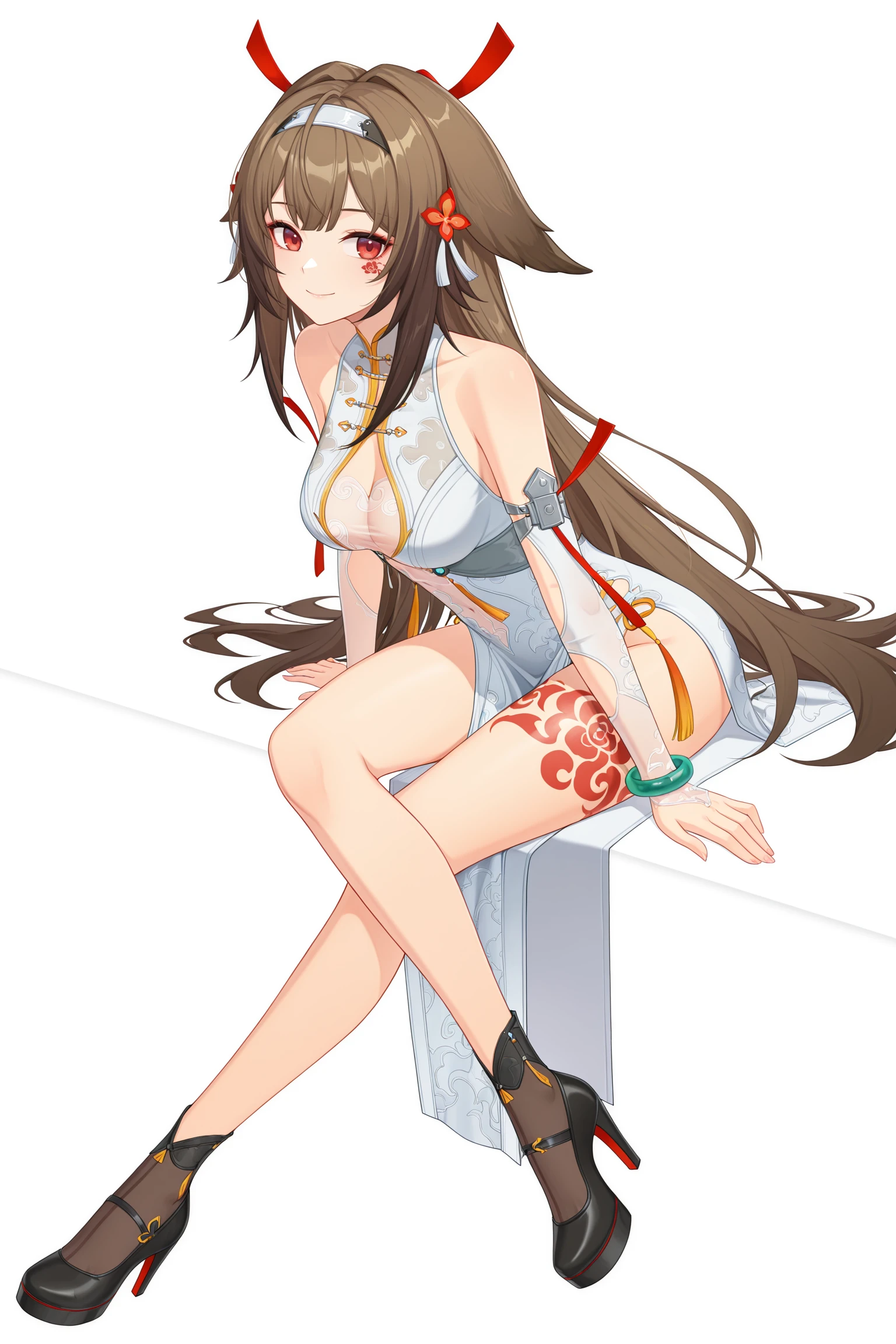 china dress,white dress,see-through chest,see-through dress,pelvic curtain,thigh tattoo,sleeveless dress,covered cleavage,chinese clothes,black footwear,flower tattoo,high heels,detached sleeves,see-through,---------------------->