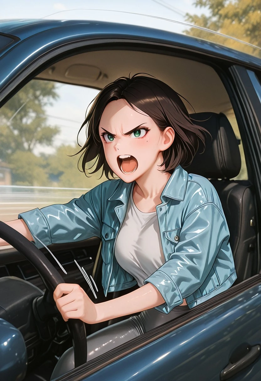 1. ((open blue denim jacket, short-sleeves white top, grey yoga pants, )) black sport shoes with white sole,