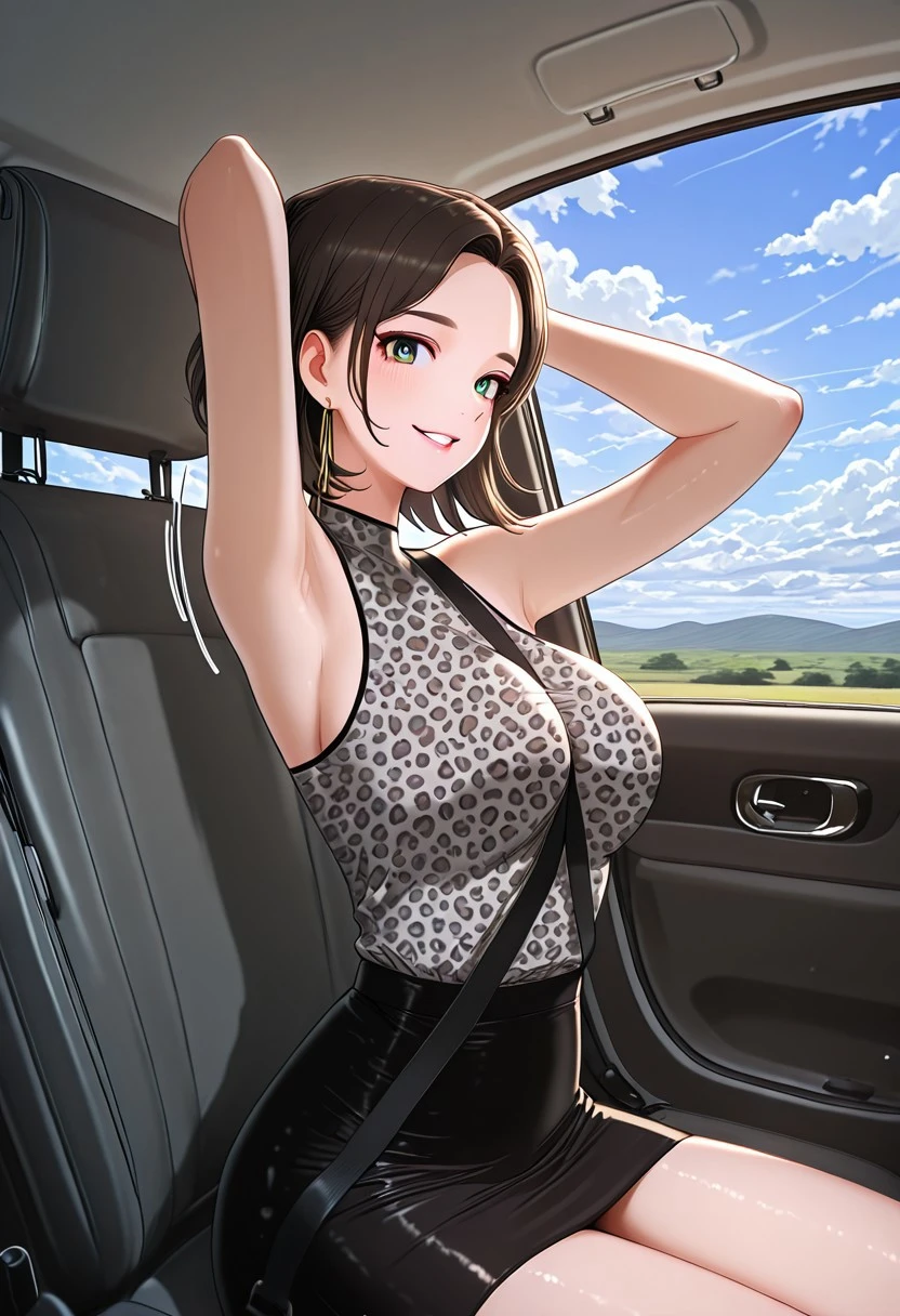 4. ((???? sleeveless high-neck leopard-print grey top with black edge, long gold earrings, ???? black pencil skirt, )) black boots, black women's shoulder bag,