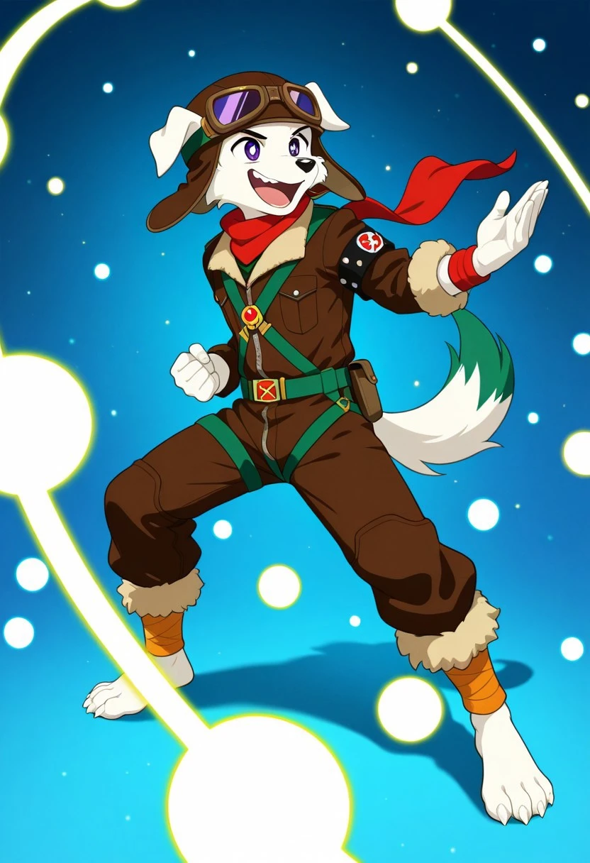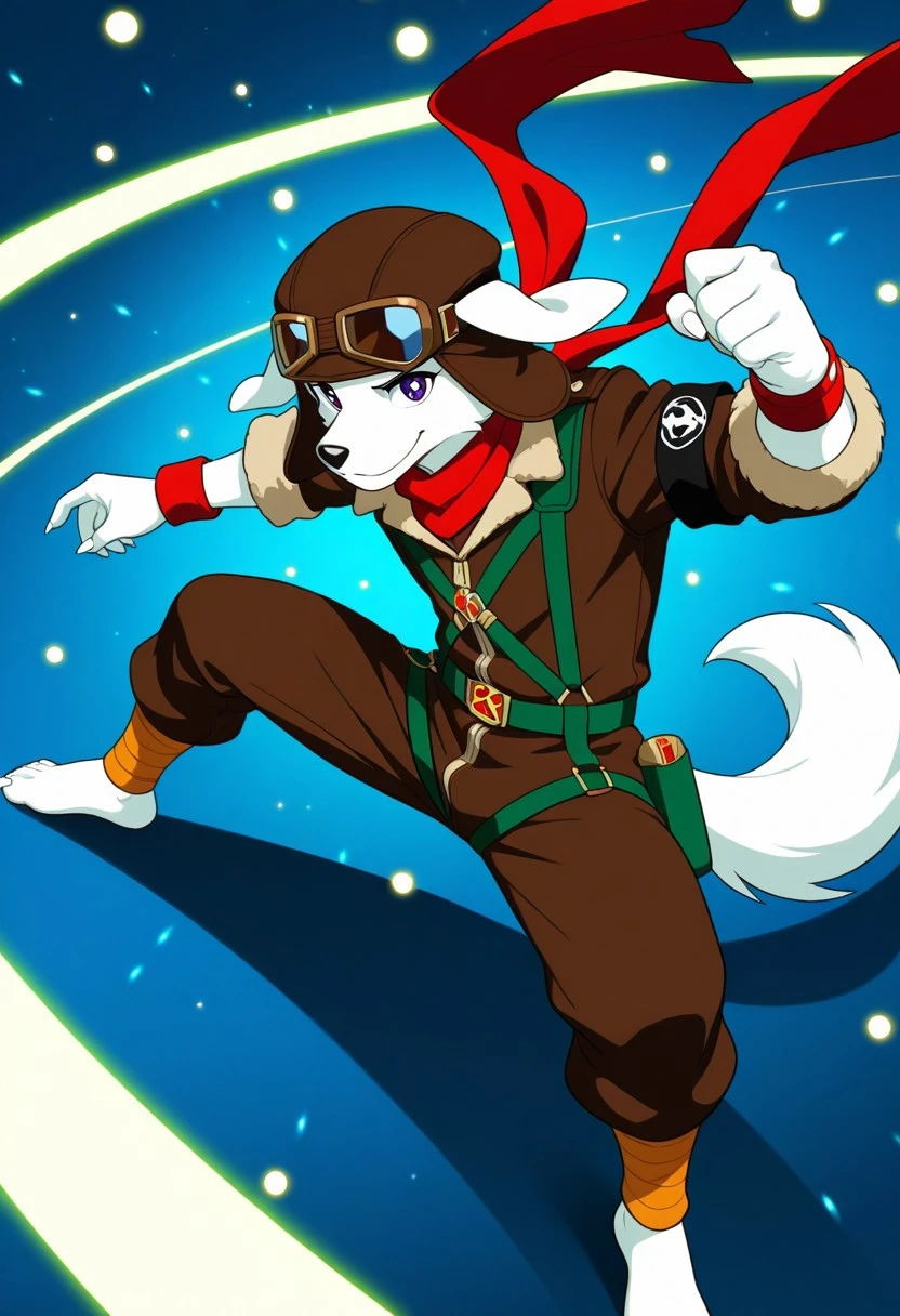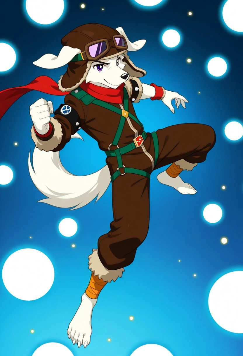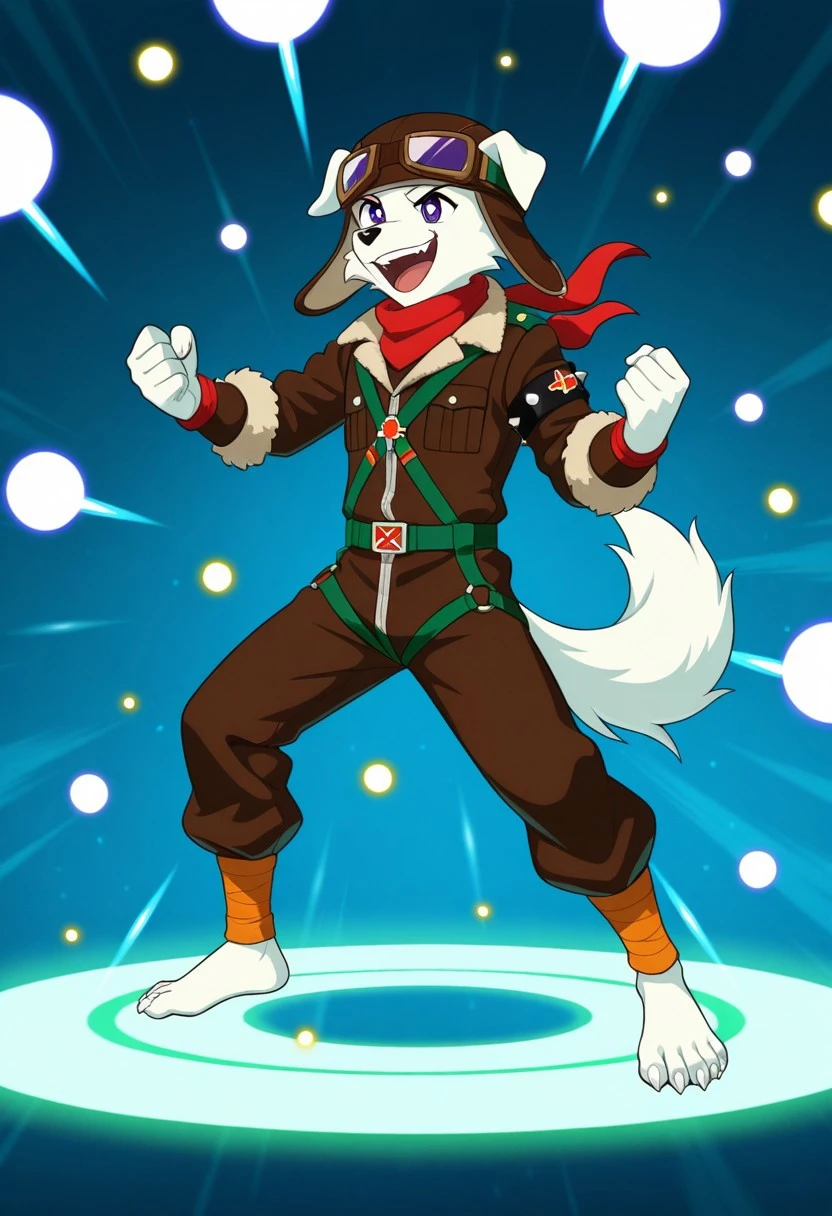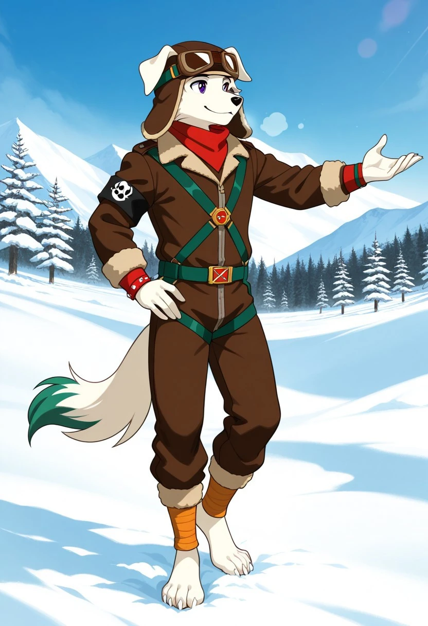 Zeke,male,violet eyes,long floppy ears,anthro,dog,male,white fur,white tail with green tail tip, wearing brown aviator suit with green straps, red scarf, beige fur trim, orange ankles bands,single black spiked armband on right upper arm,red handbands, brown goggles on hood,white claws,Barefoot