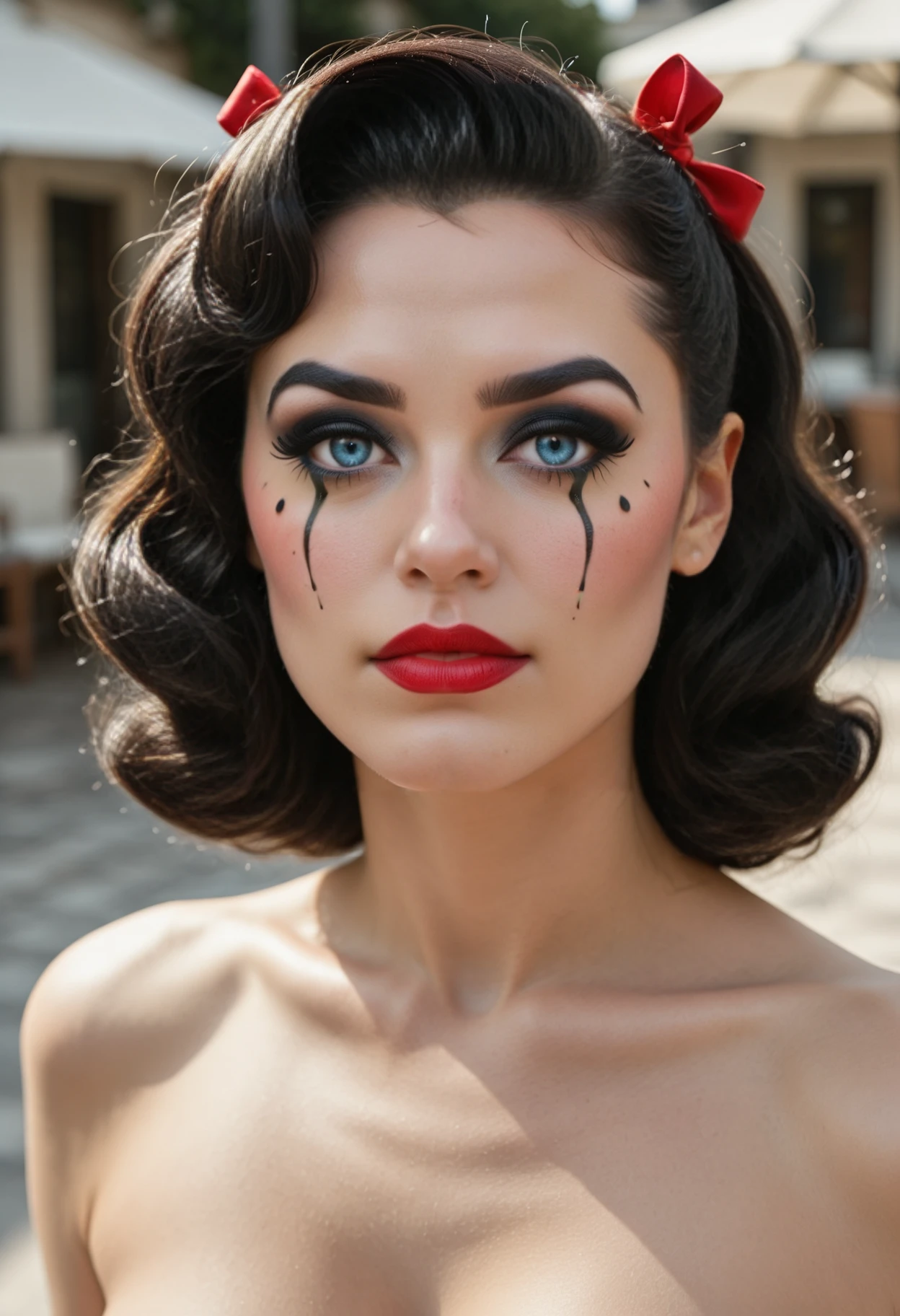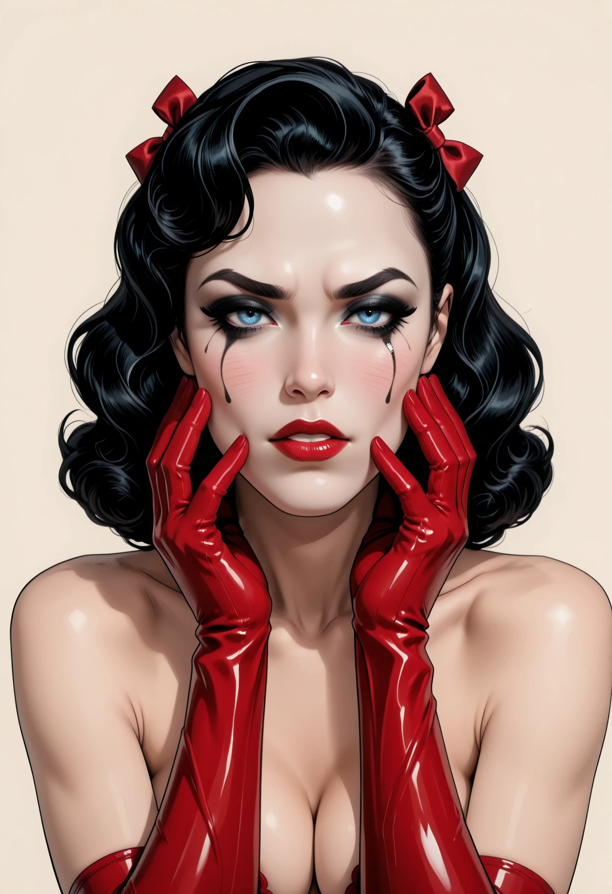 vintage hairstyle, black hair, wavy hair, side-swept bangs, shoulder-length hair, hair bow, red bow, two bows, blue eyes, heavy makeup, eyeliner, winged eyeliner, mascara, teardrop makeup, black tears, red lipstick,