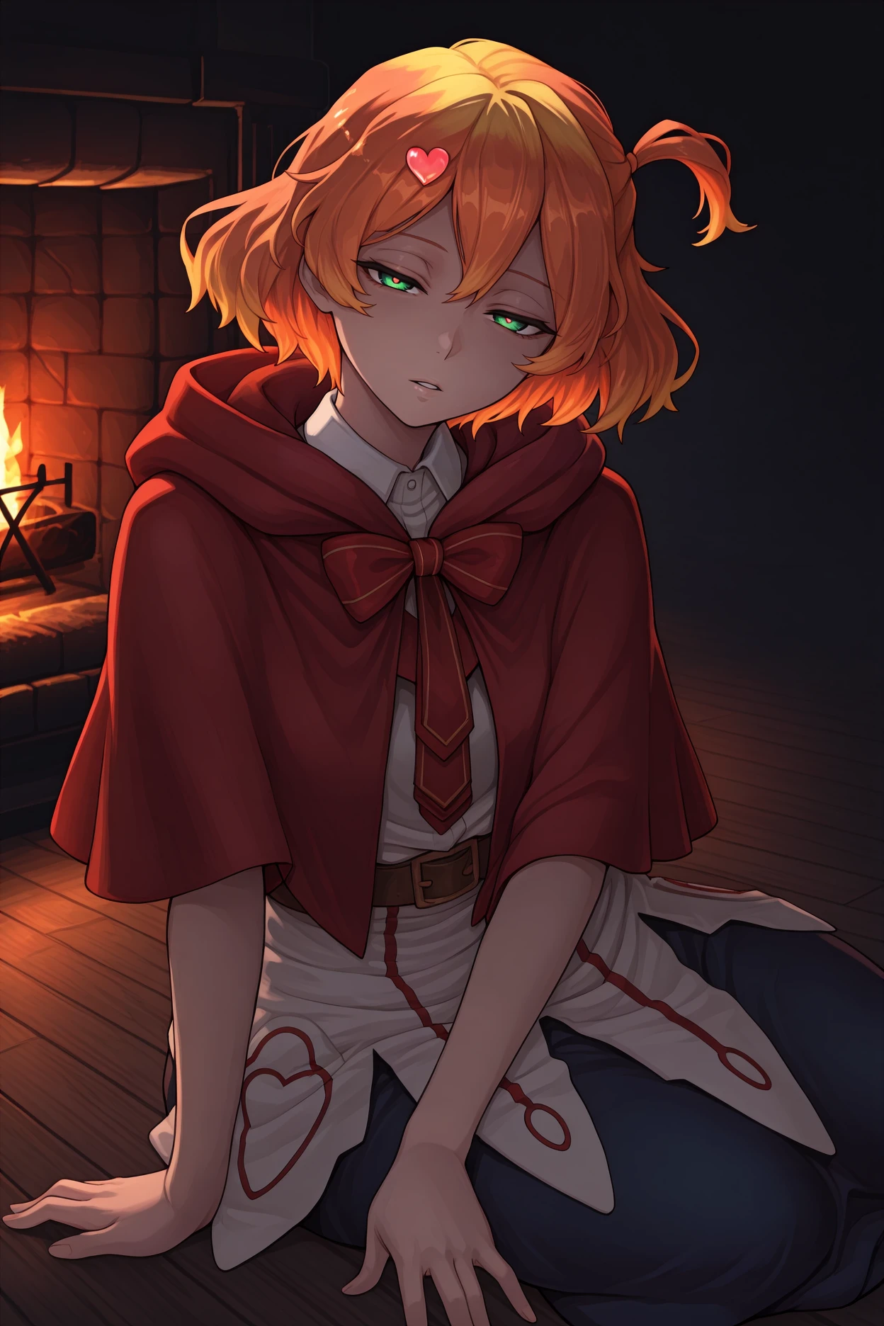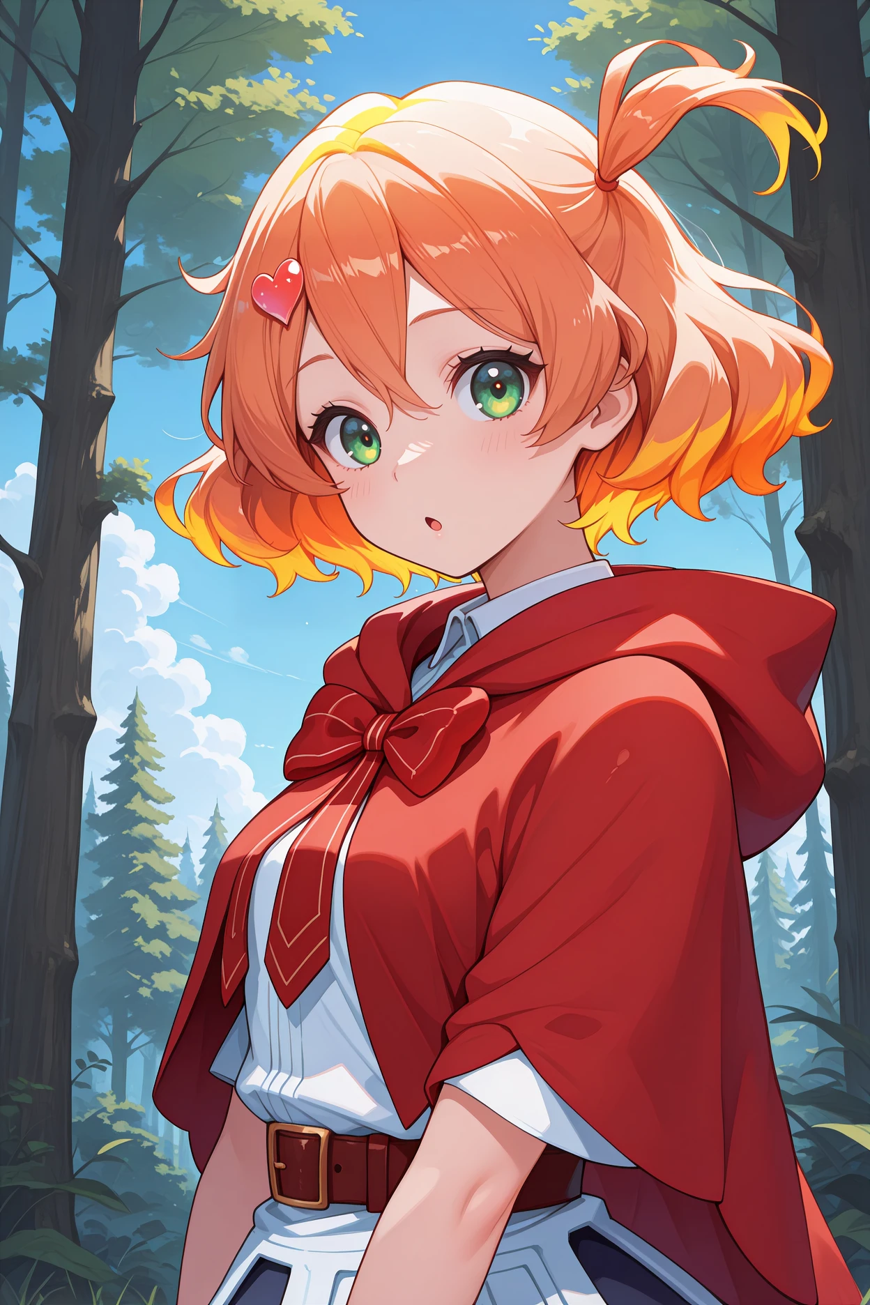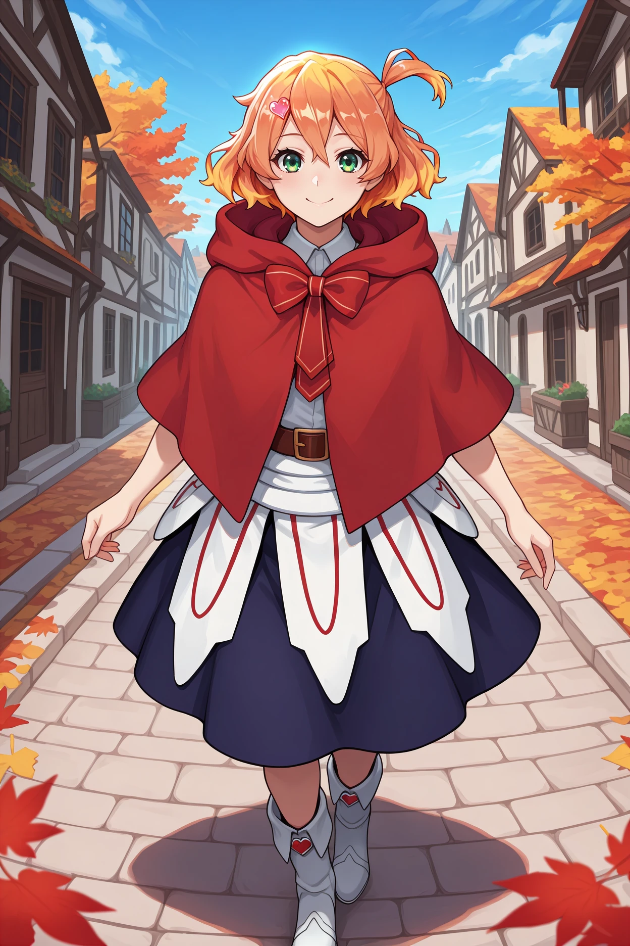 heart hair ornament, red cloak, red capelet, hood down, red bowtie, white shirt, collared shirt, belt, white tunic, dark blue skirt, white boots