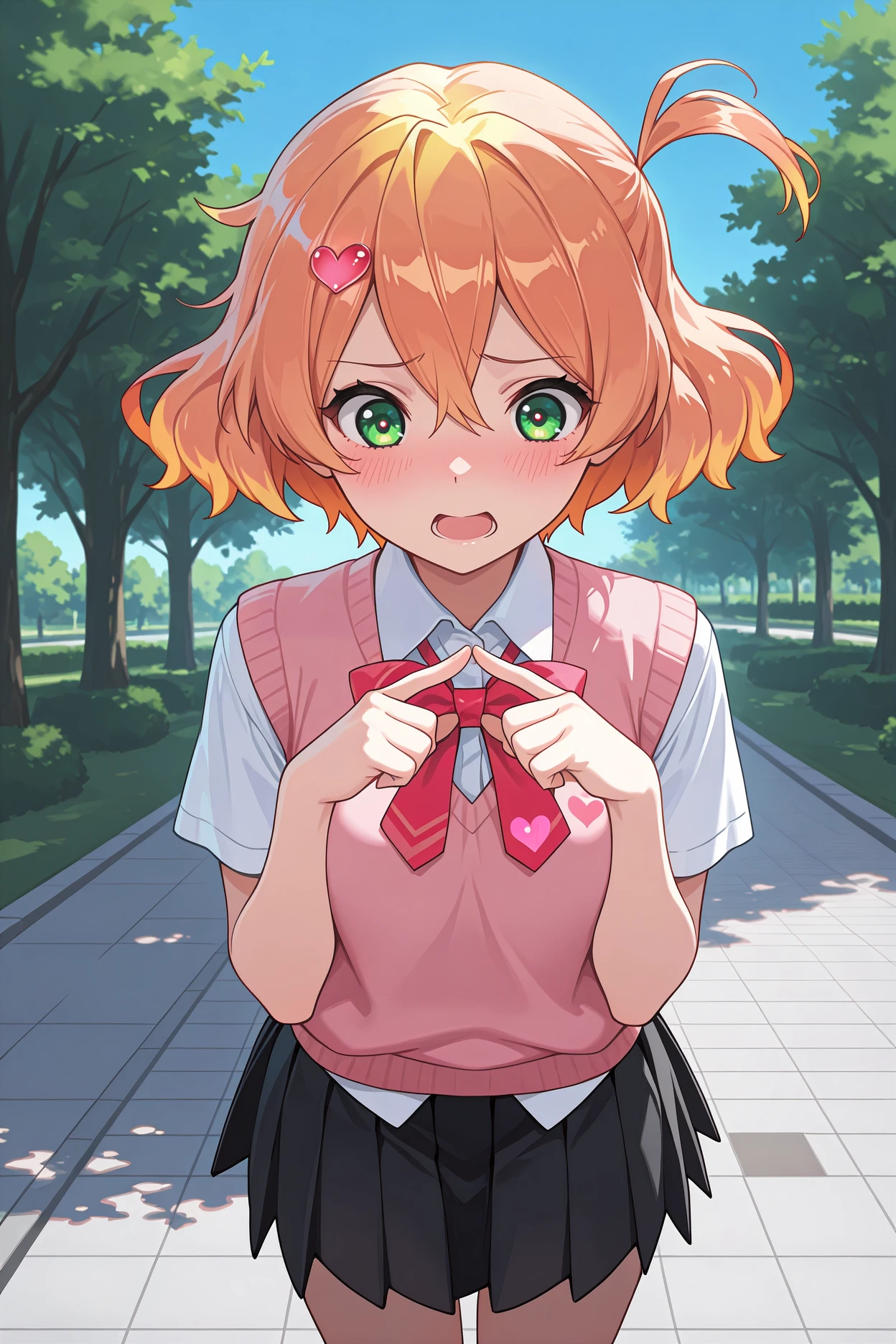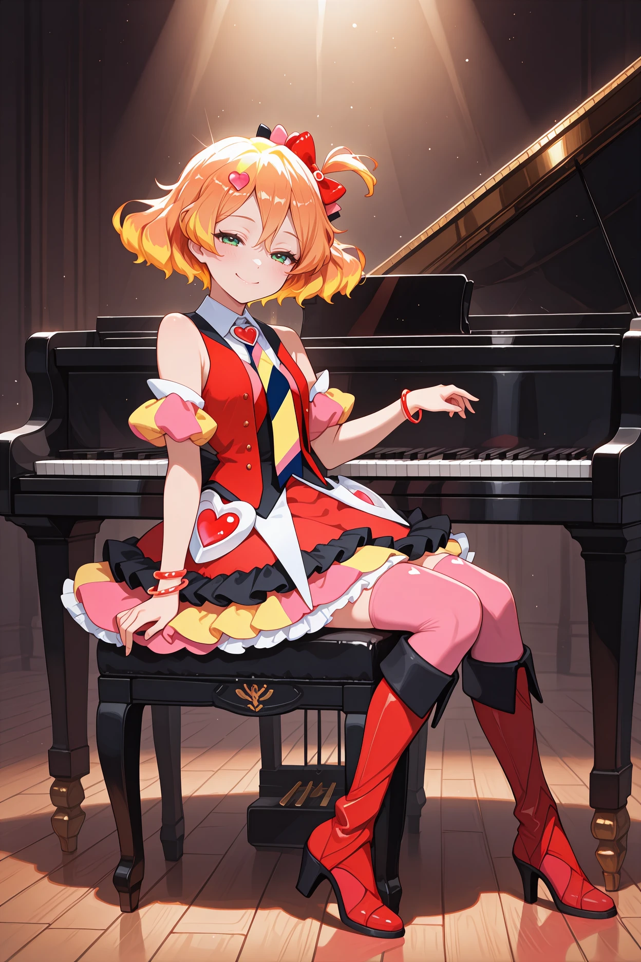 • Add "heart hair ornament, hair bow, red bow, red vest, sleeveless, white shirt, collared shirt, yellow necktie, multicolored necktie, detached sleeves, very short sleeves, pink sleeves, yellow sleeves, bracelet, red skirt, frilled skirt, layered skirt, pink thighhighs, high heel boots, red boots, knee boots" for her idol outfit.