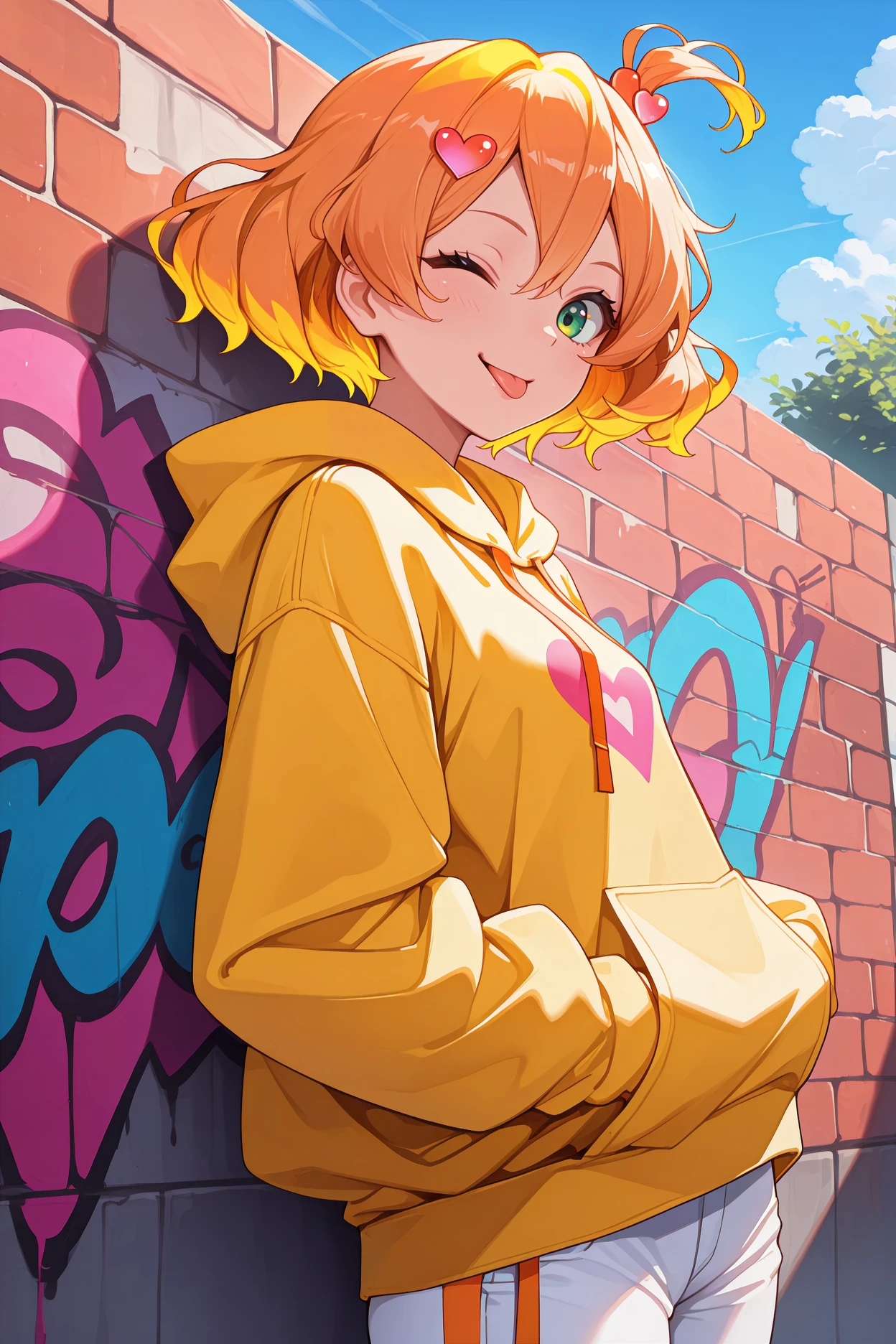 frjawn, blonde hair, orange hair, multicolored hair, short hair, one side up, hair between eyes, green eyes