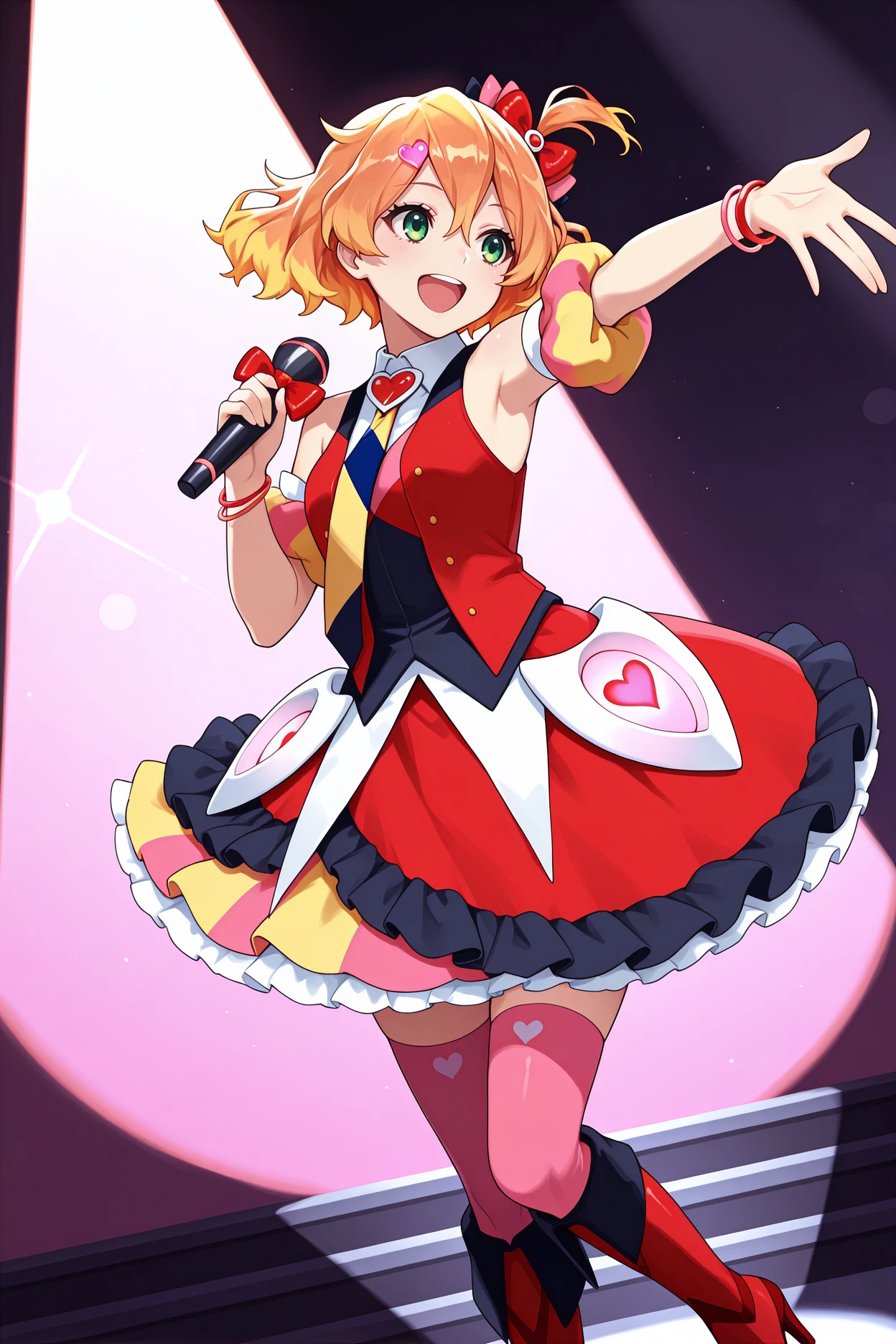 heart hair ornament, hair bow, red bow, red vest, sleeveless, white shirt, collared shirt, yellow necktie, multicolored necktie, detached sleeves, very short sleeves, pink sleeves, yellow sleeves, bracelet, red skirt, frilled skirt, layered skirt, pink thighhighs, high heel boots, red boots, knee boots