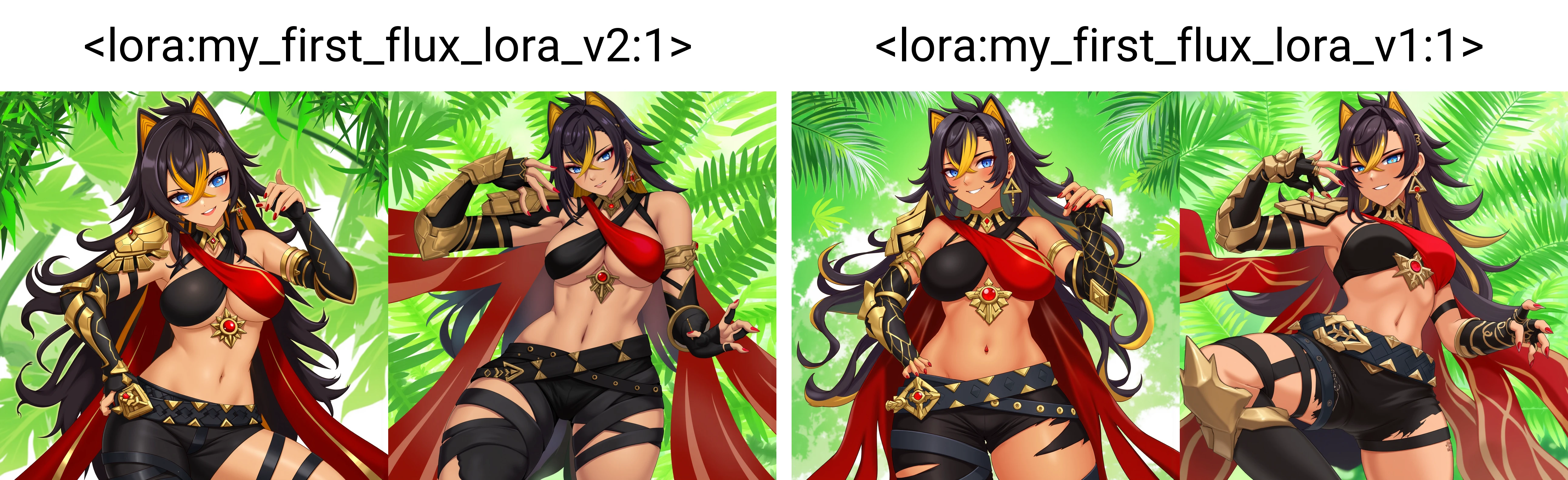 tags that might help, it was trained with both caption and tags solo, 1girl, (canonquality:1.5), black hair, blonde hair, bare shoulders, criss-cross halter, amulet, single claw, jewlery, breasts, large breasts, earrings, asymmetrical clothes, asymmetrical gloves, armlet, dark skin, dark skinned female, cape, ripped clothing, black shorts, midriff, multicolored hair, thigh boots, collar, long hair, blue eyes