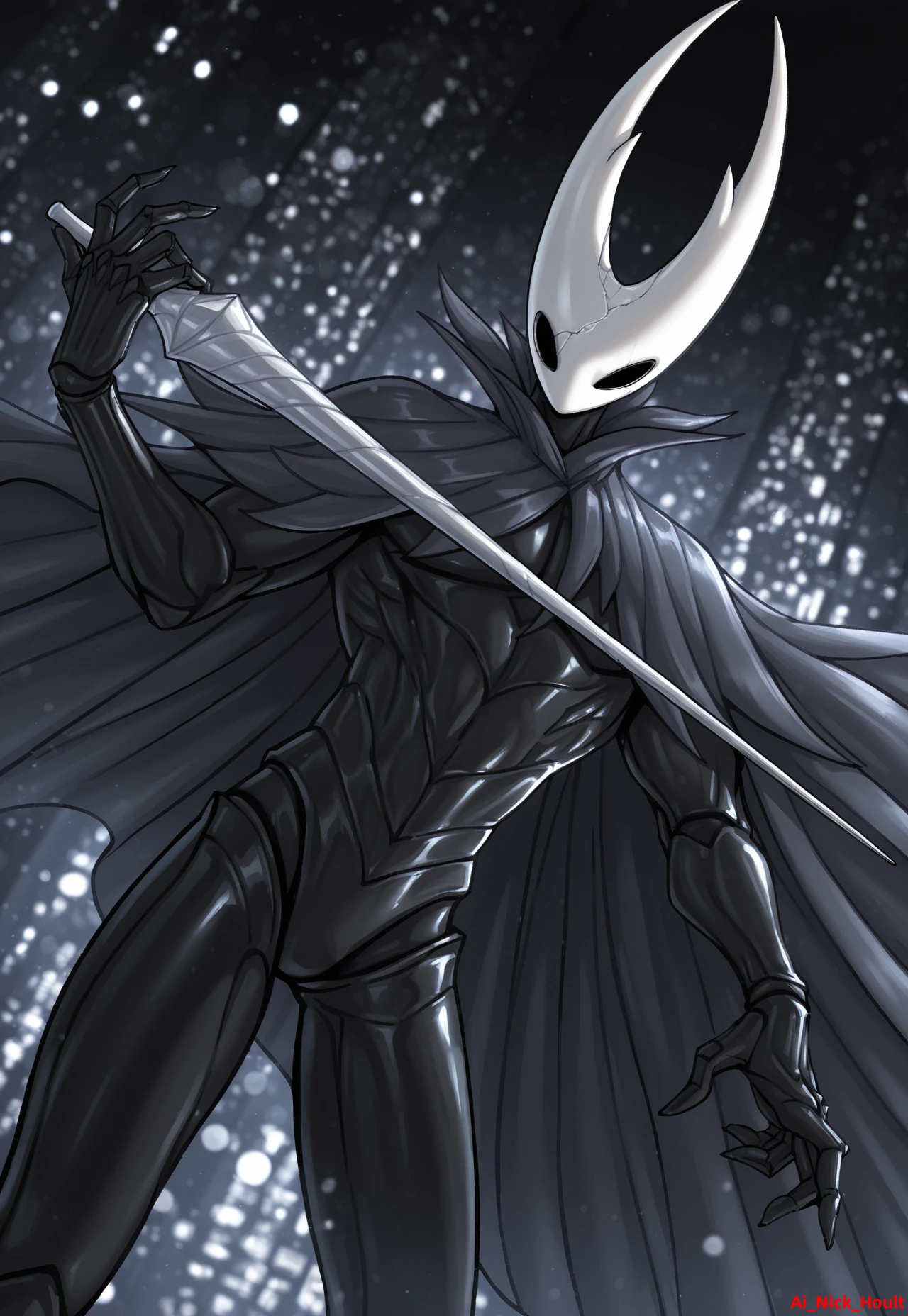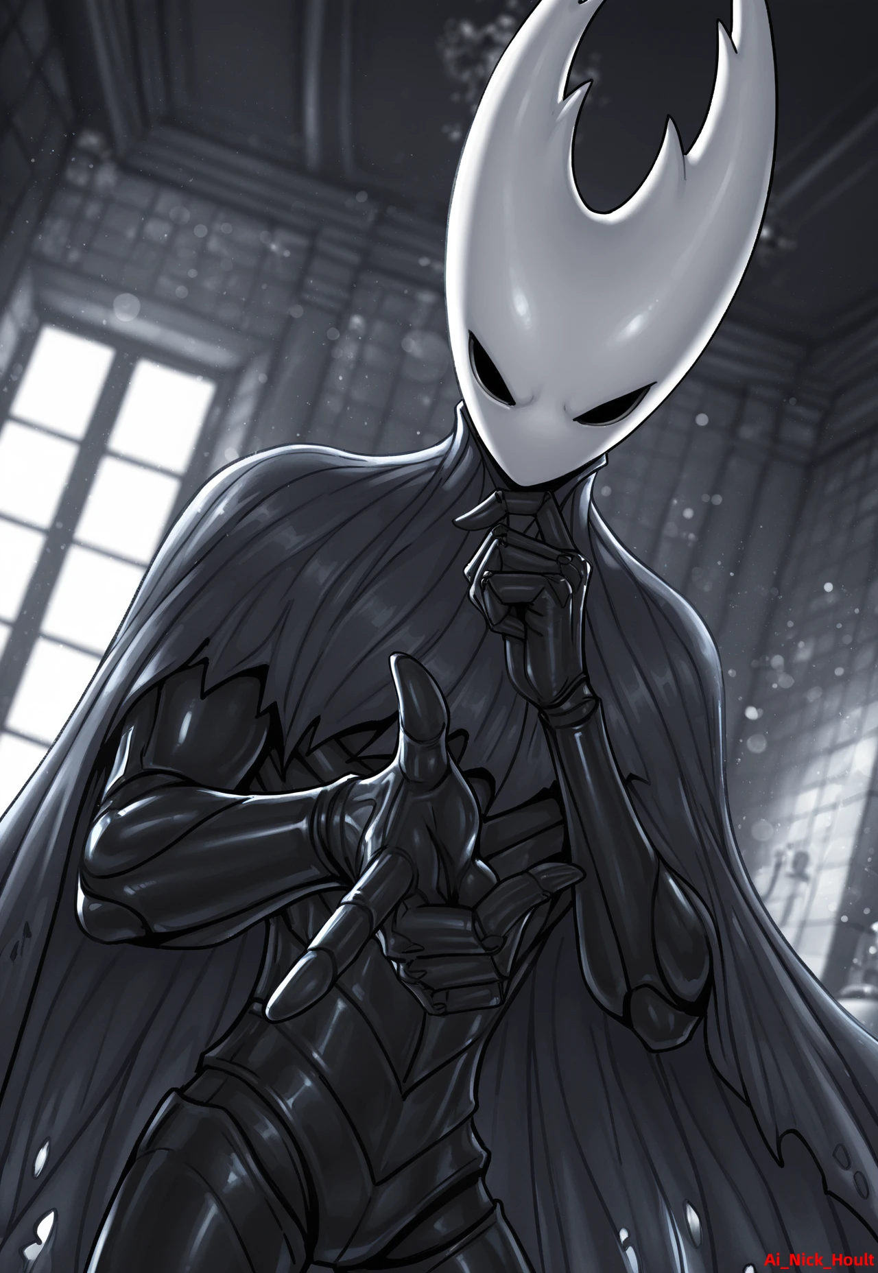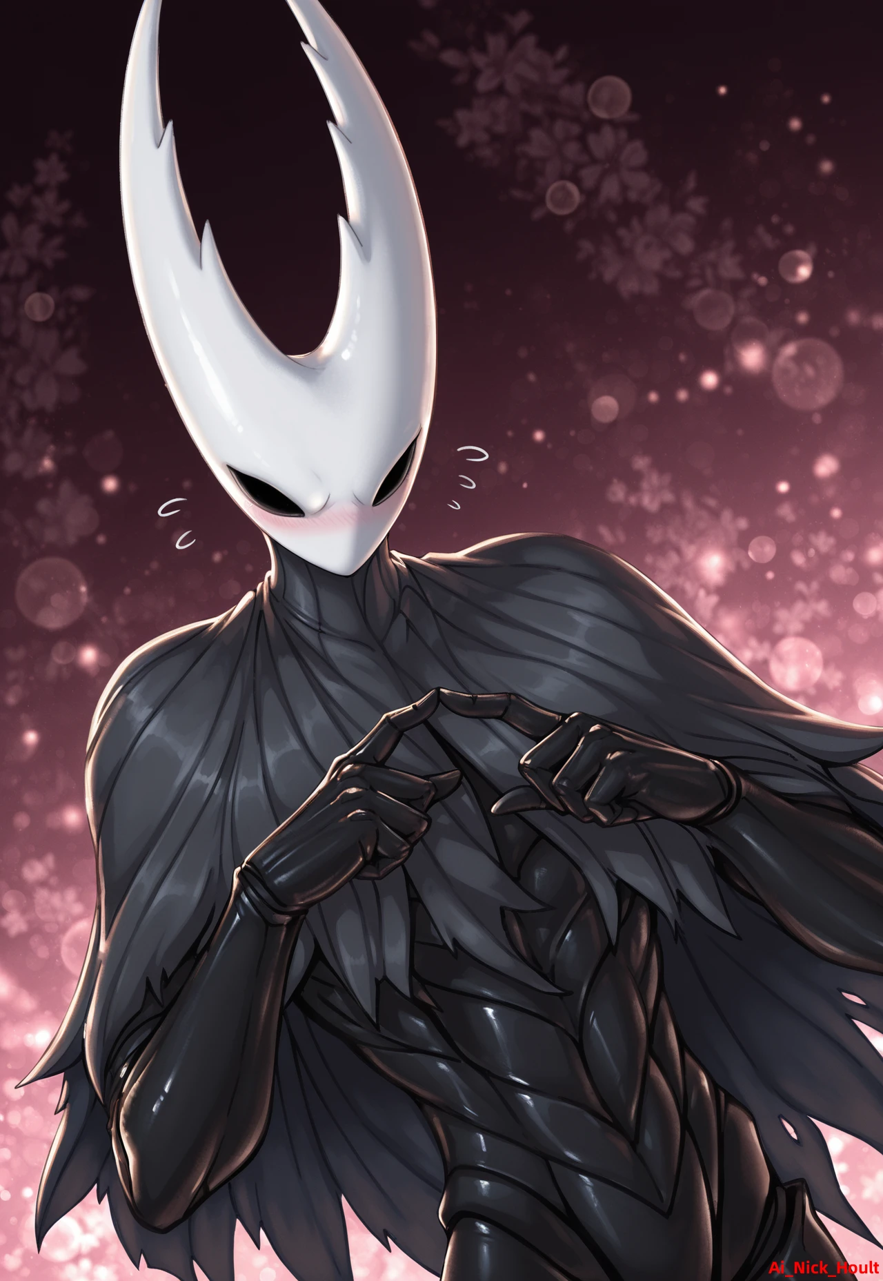 Pure Vessel, HK,mature, white hollow knight mask , dark body, black eyes, (no mouth), Side prompt: