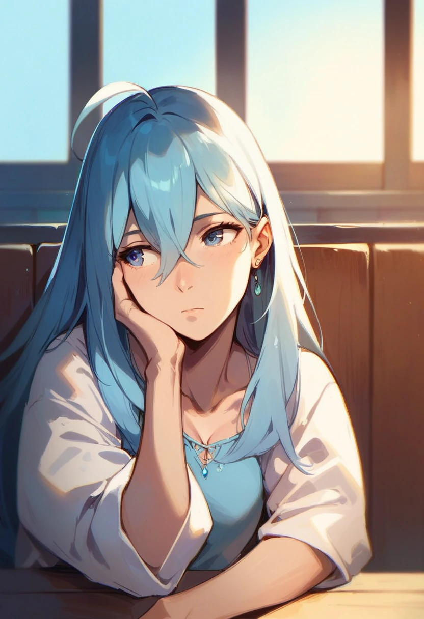 Trigger: vivy, 1girl, long hair, bangs, blue eyes, hair between eyes, blue hair, earrings, ahoge